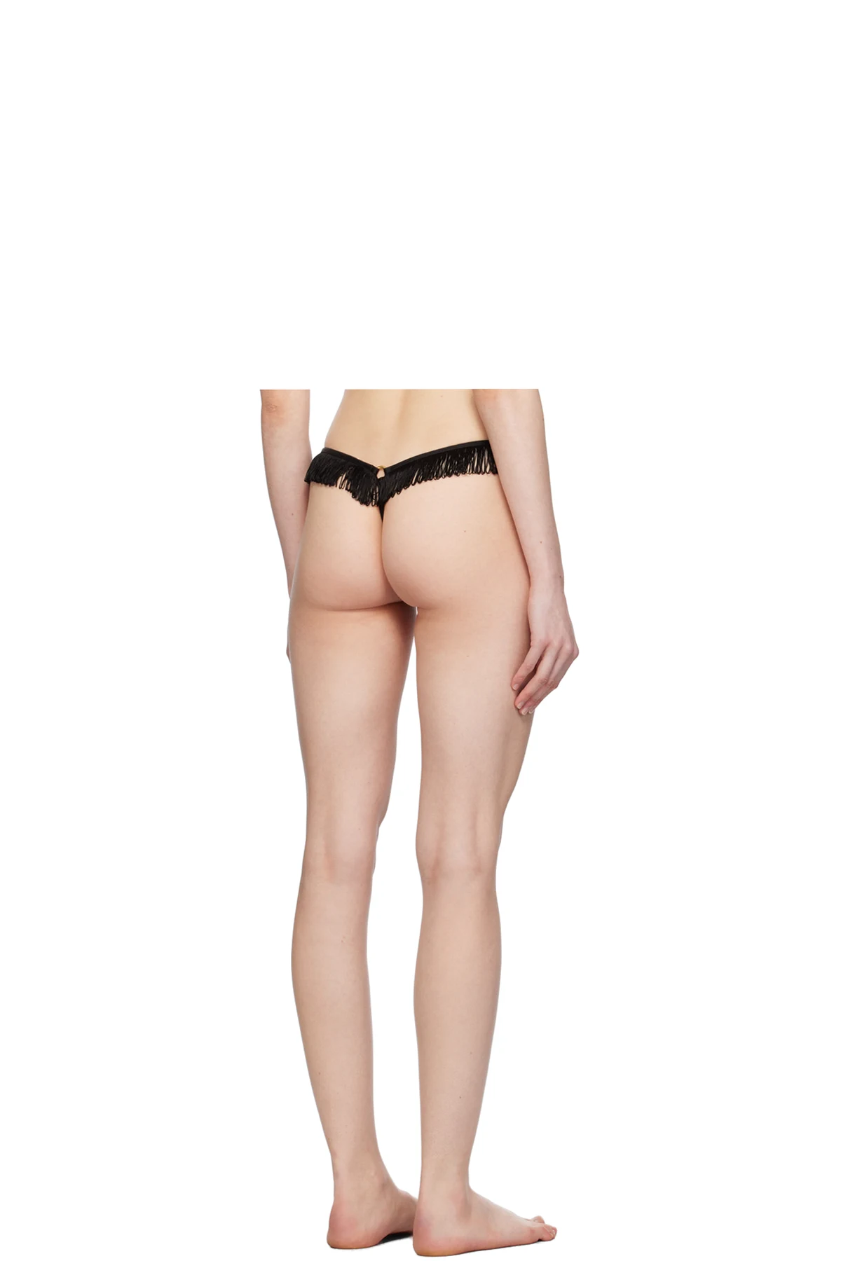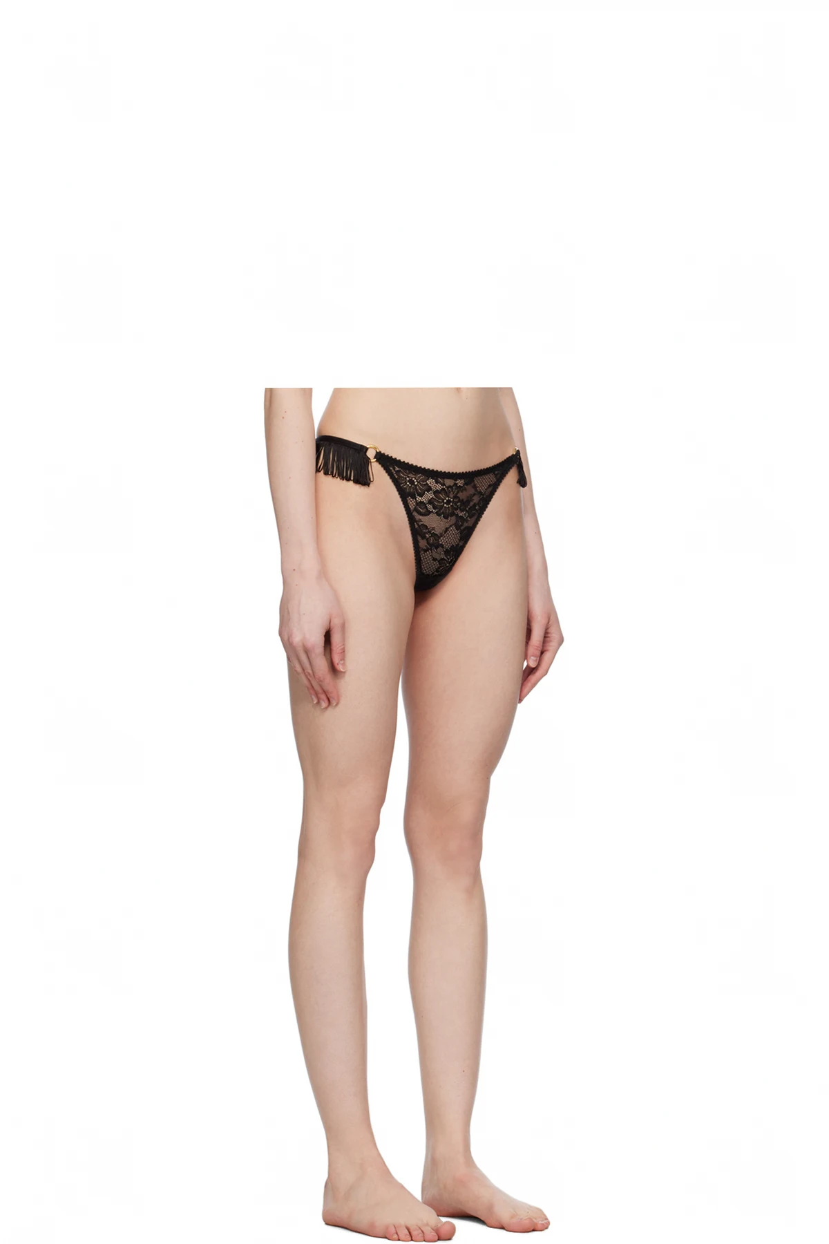 Sheer stretch nylon lace thong. Elasticized picot trim throughout.