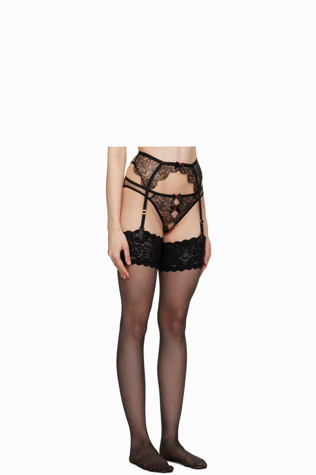 Semi-sheer nylon-blend tulle and polyester mesh garter belt. Scalloped edges and embroidered floral detailing throughout.