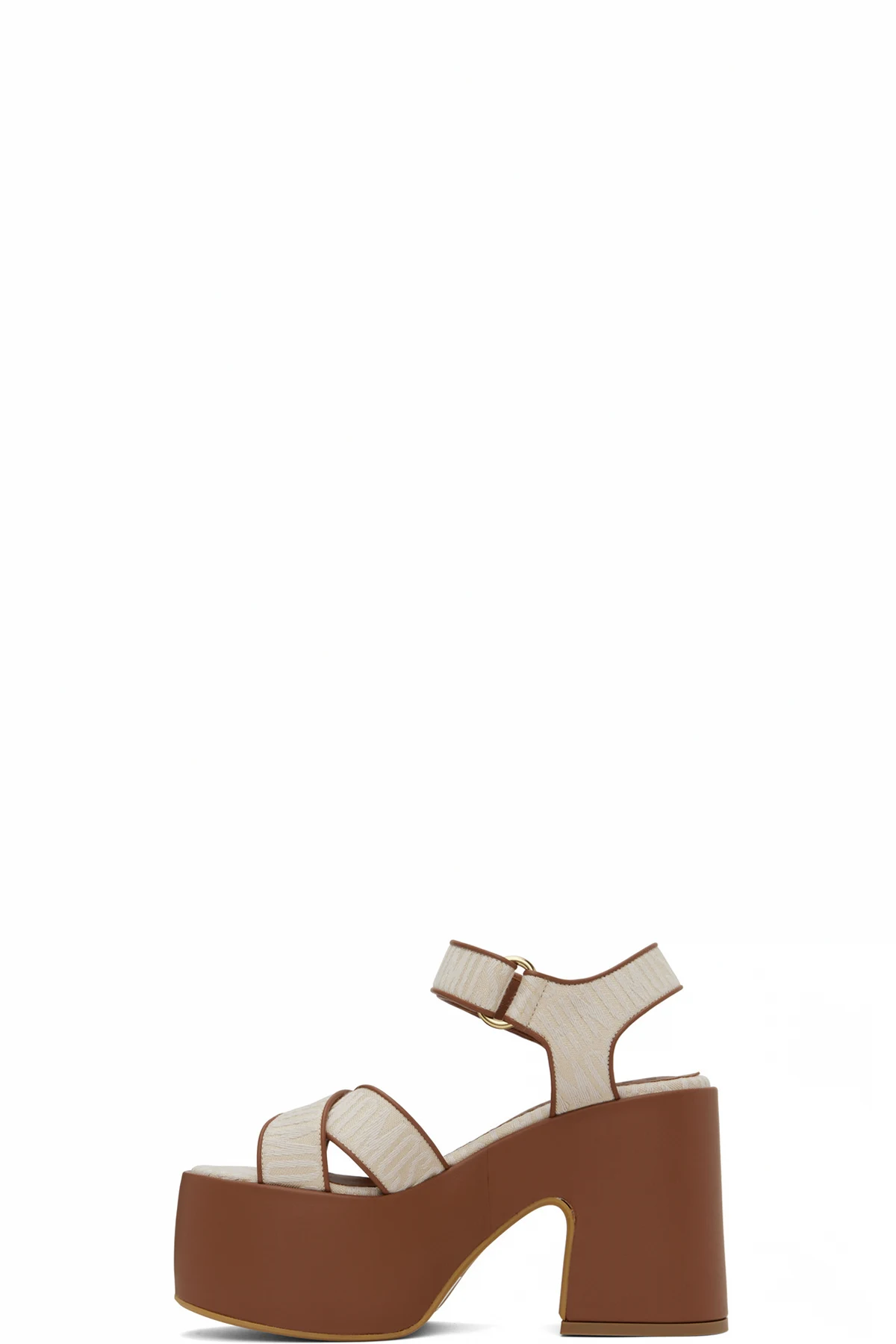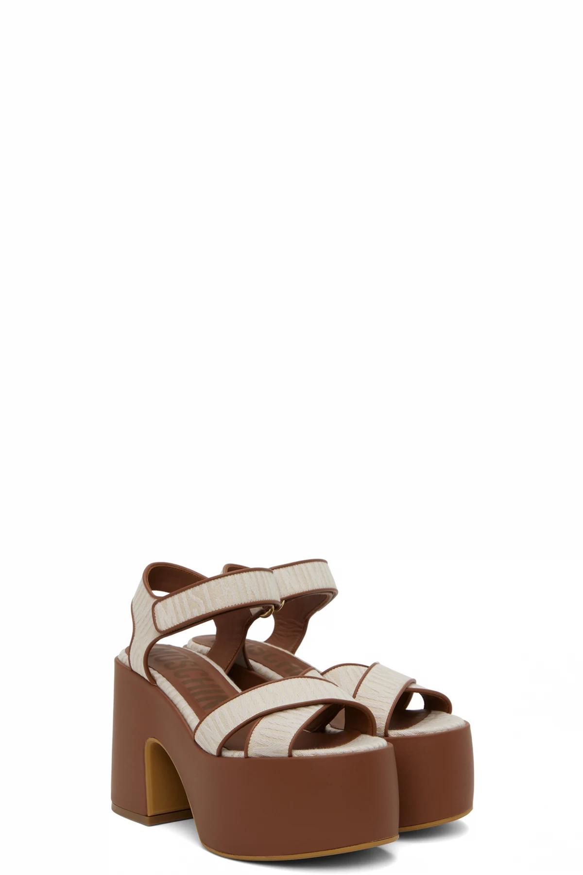 Canvas heeled sandals in beige and brown.