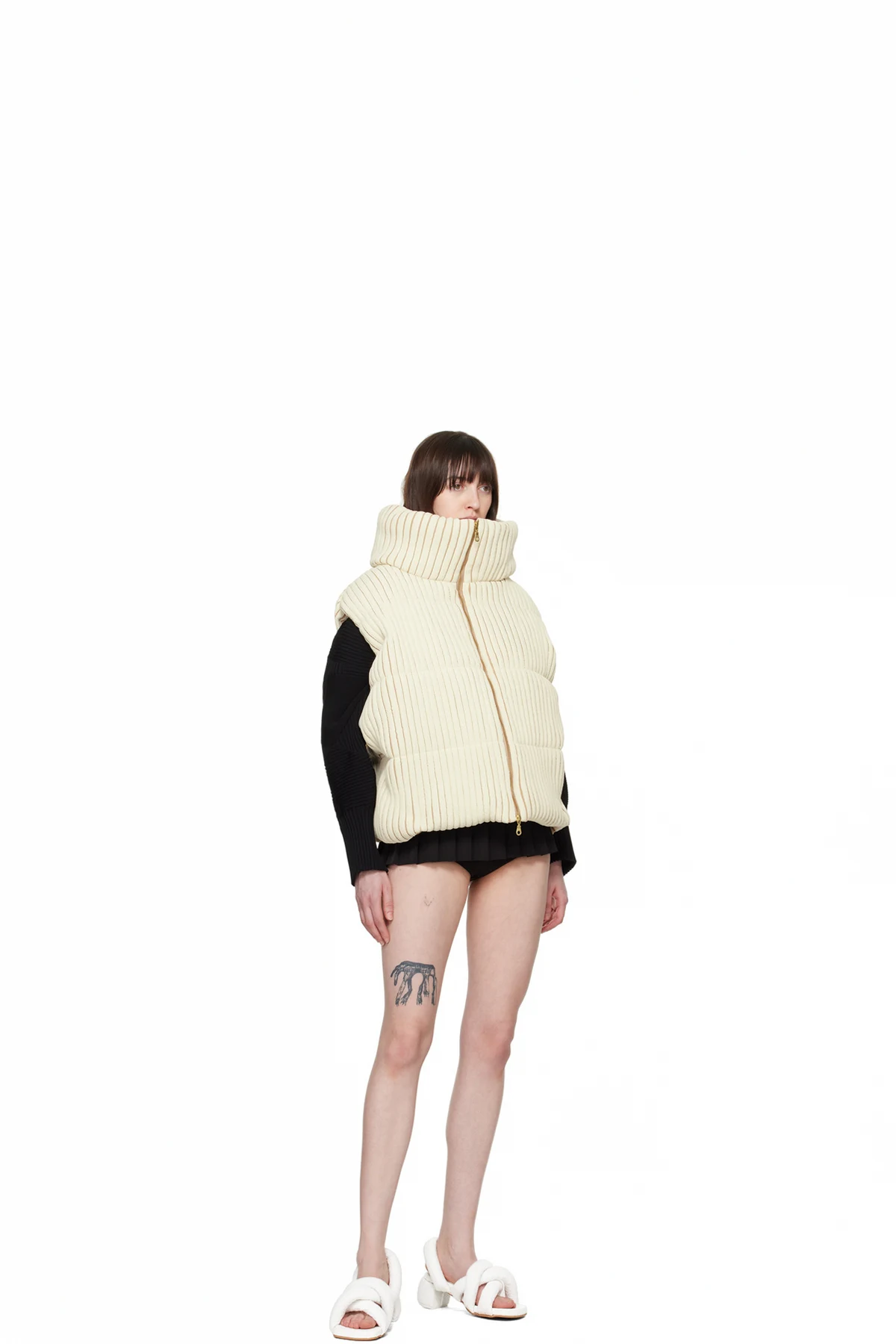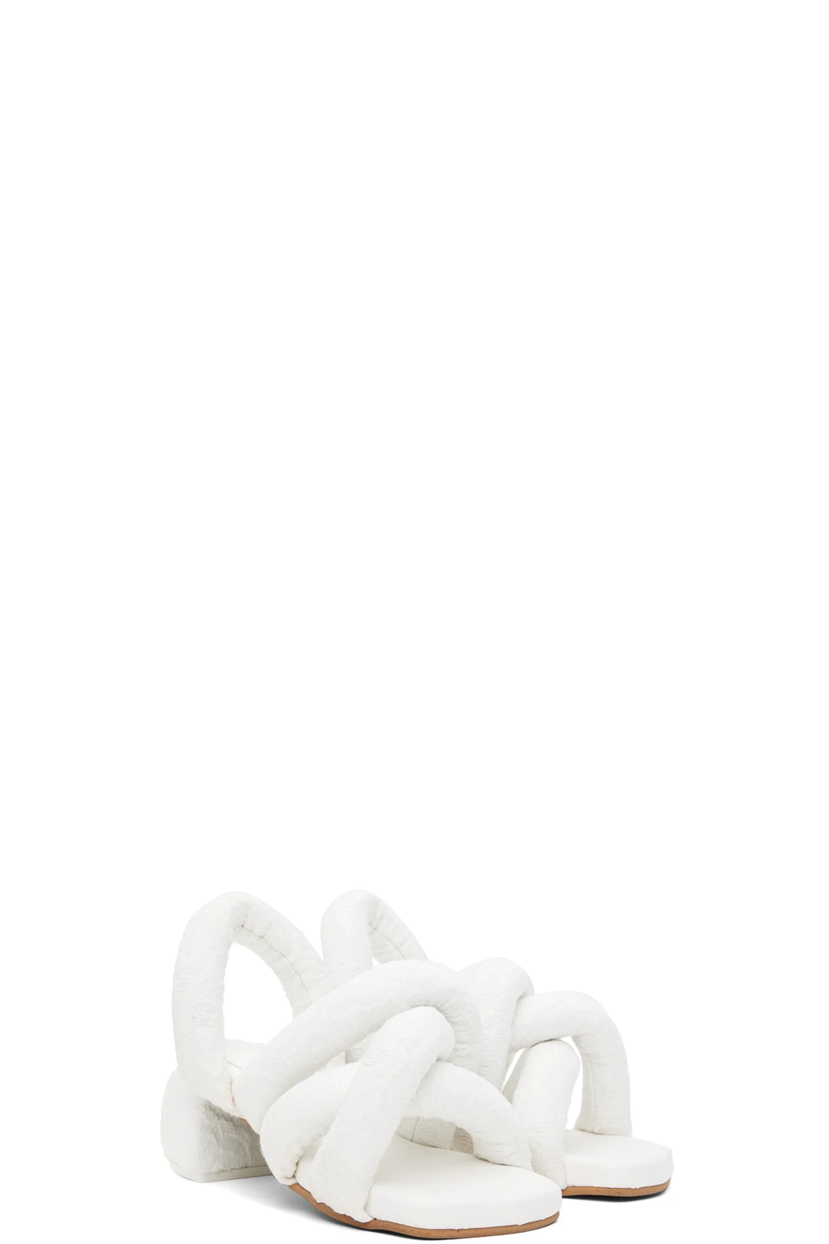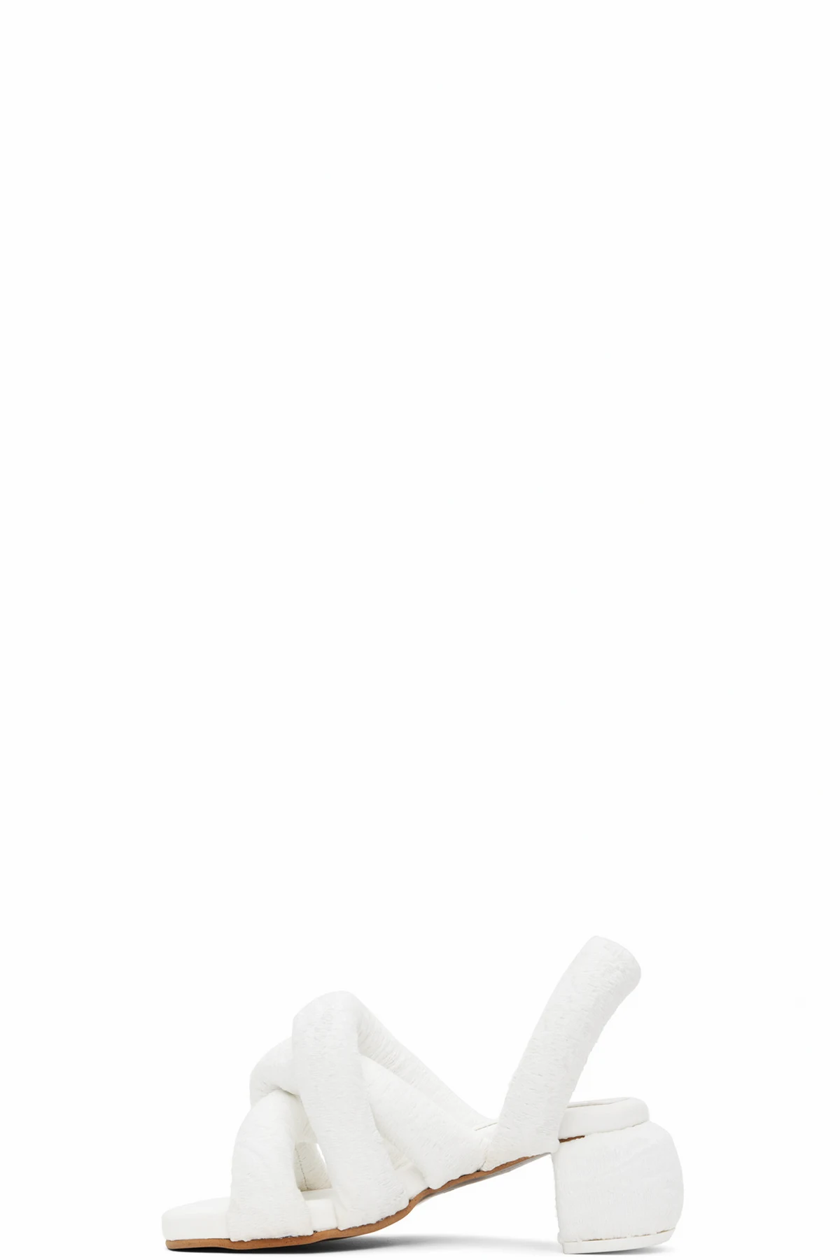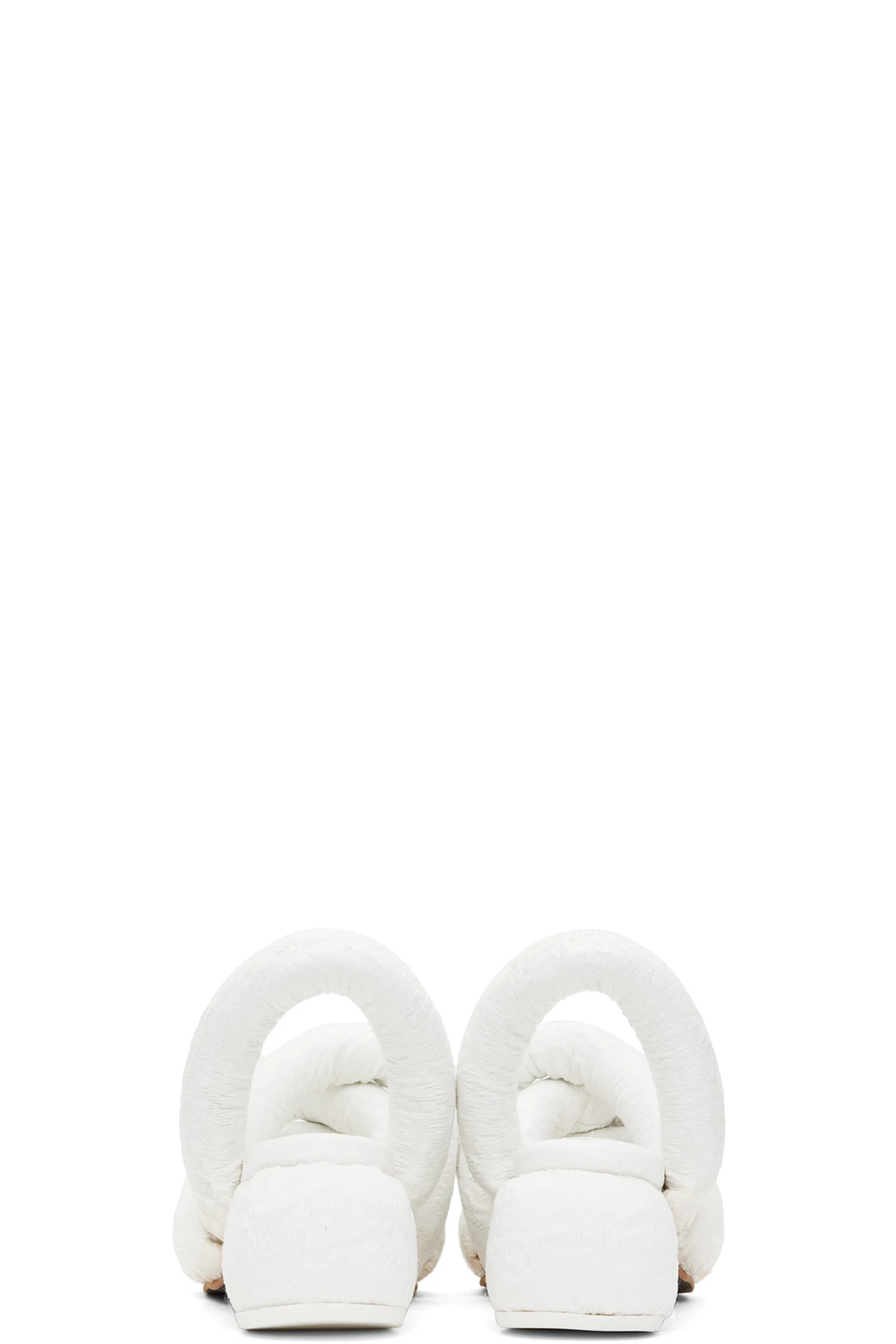 Padded brocade heeled sandals in white.