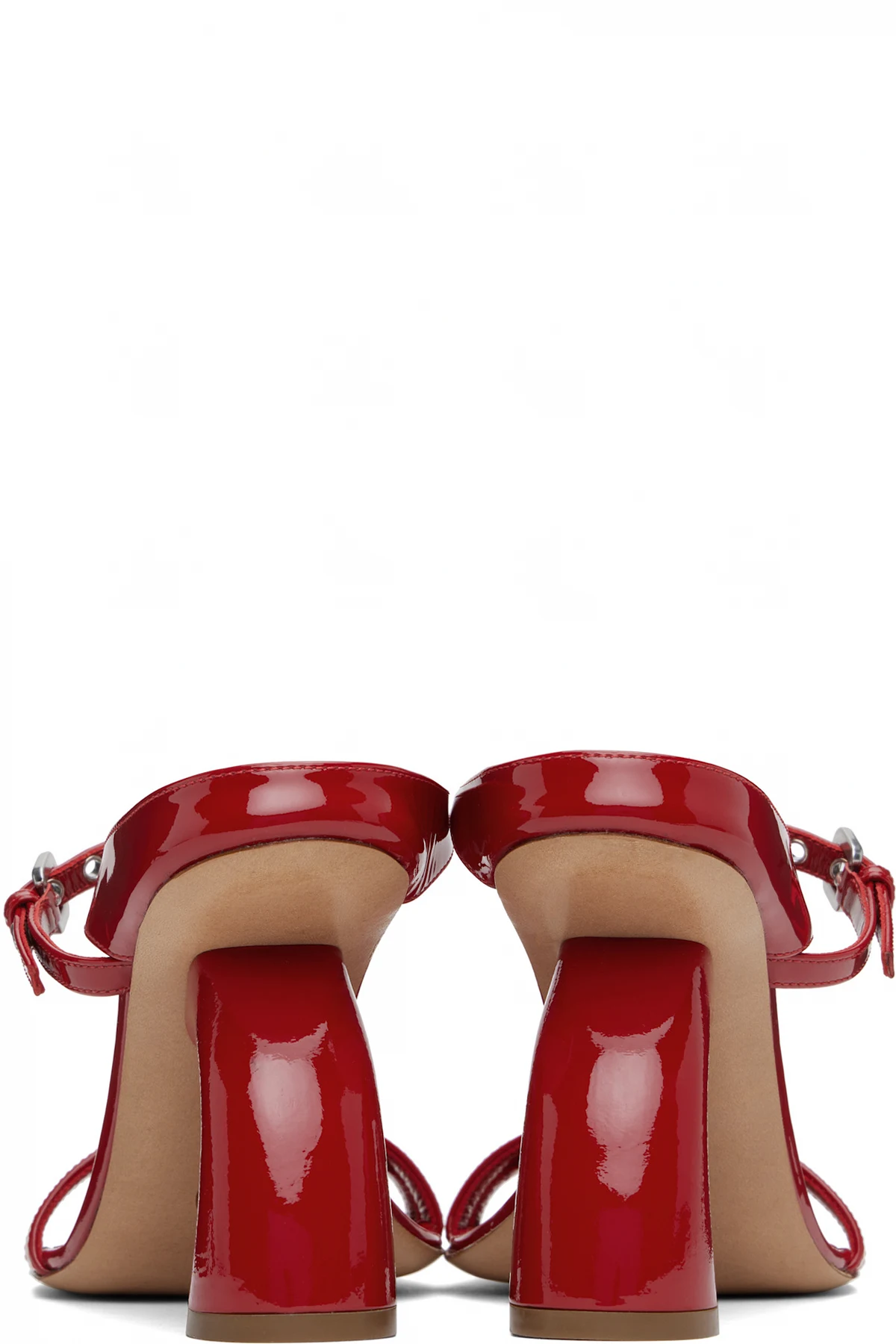Patent calfskin heeled sandals in red.