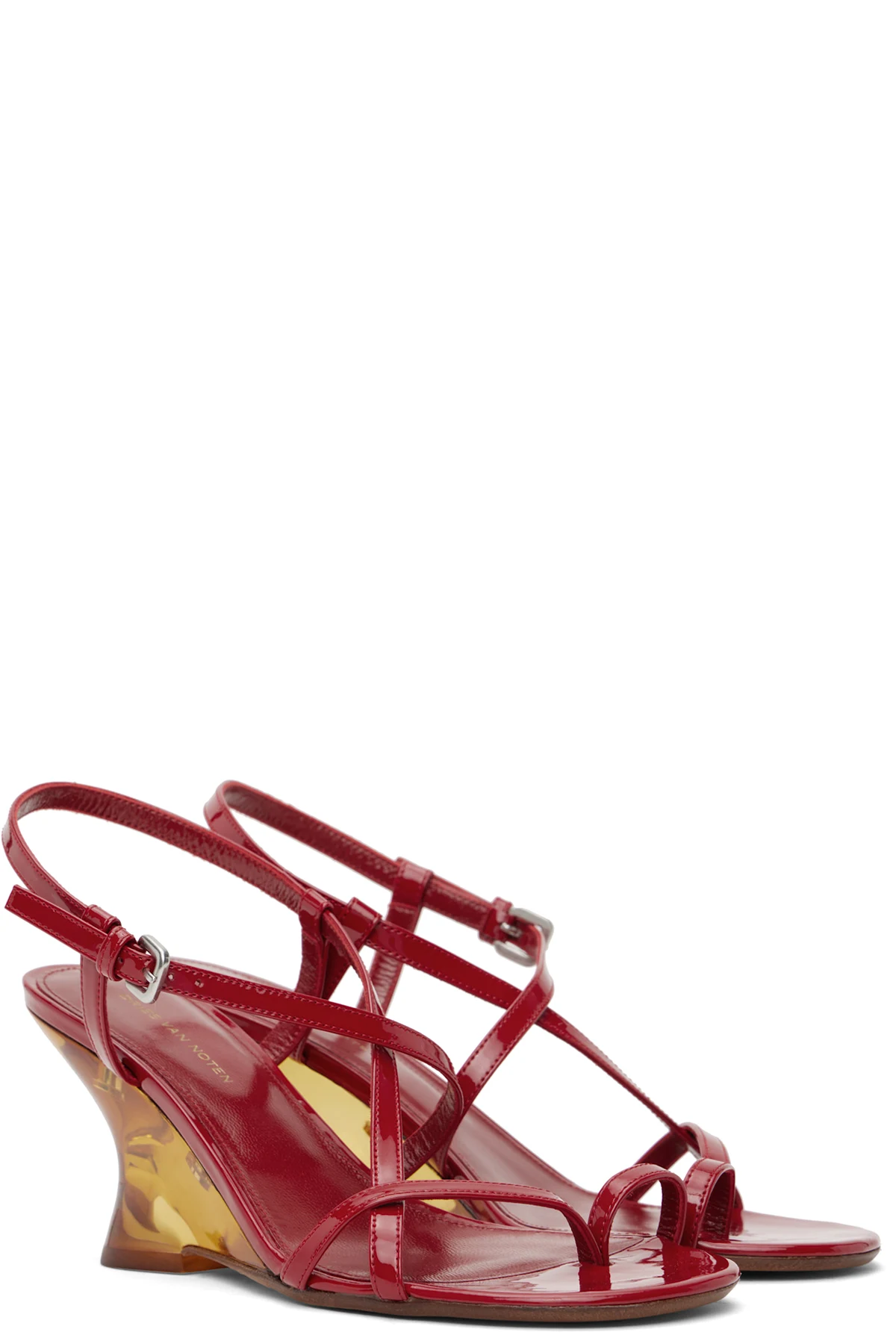 Patent leather heeled sandals in red.