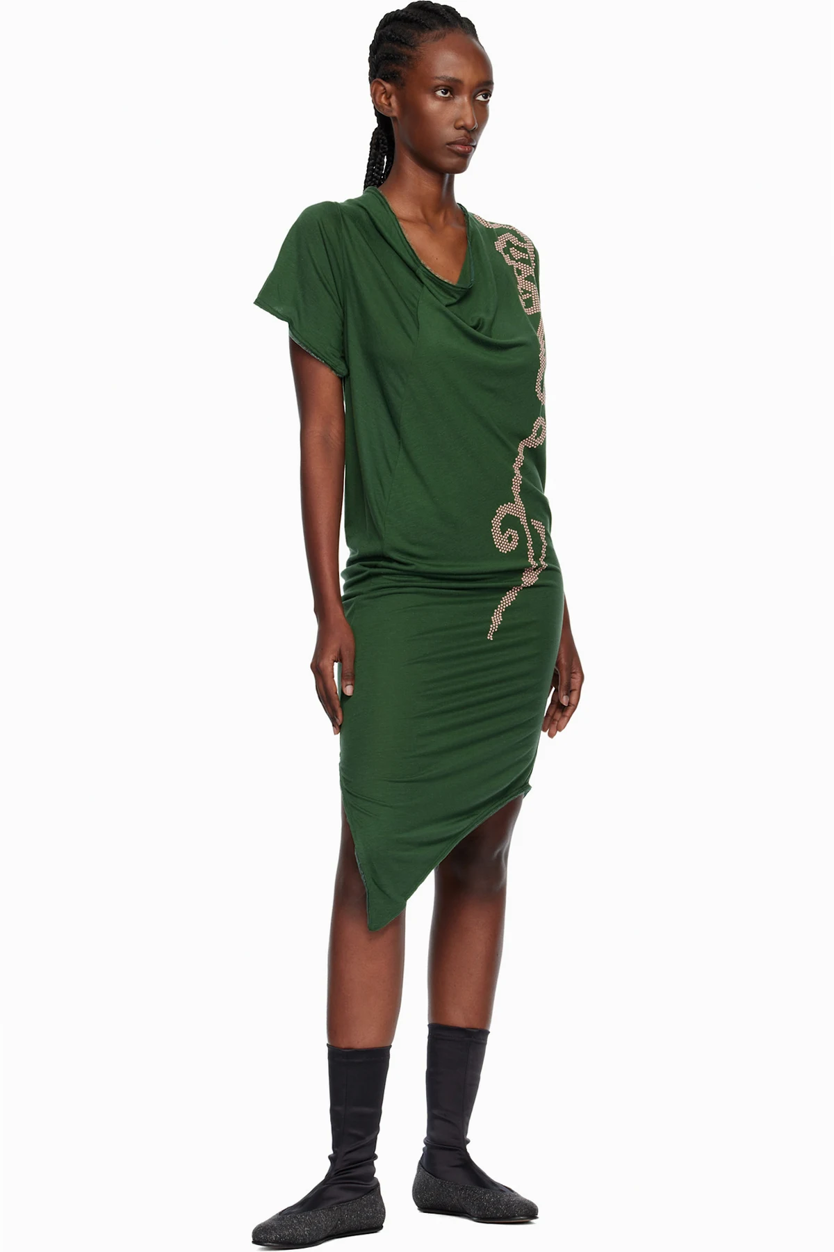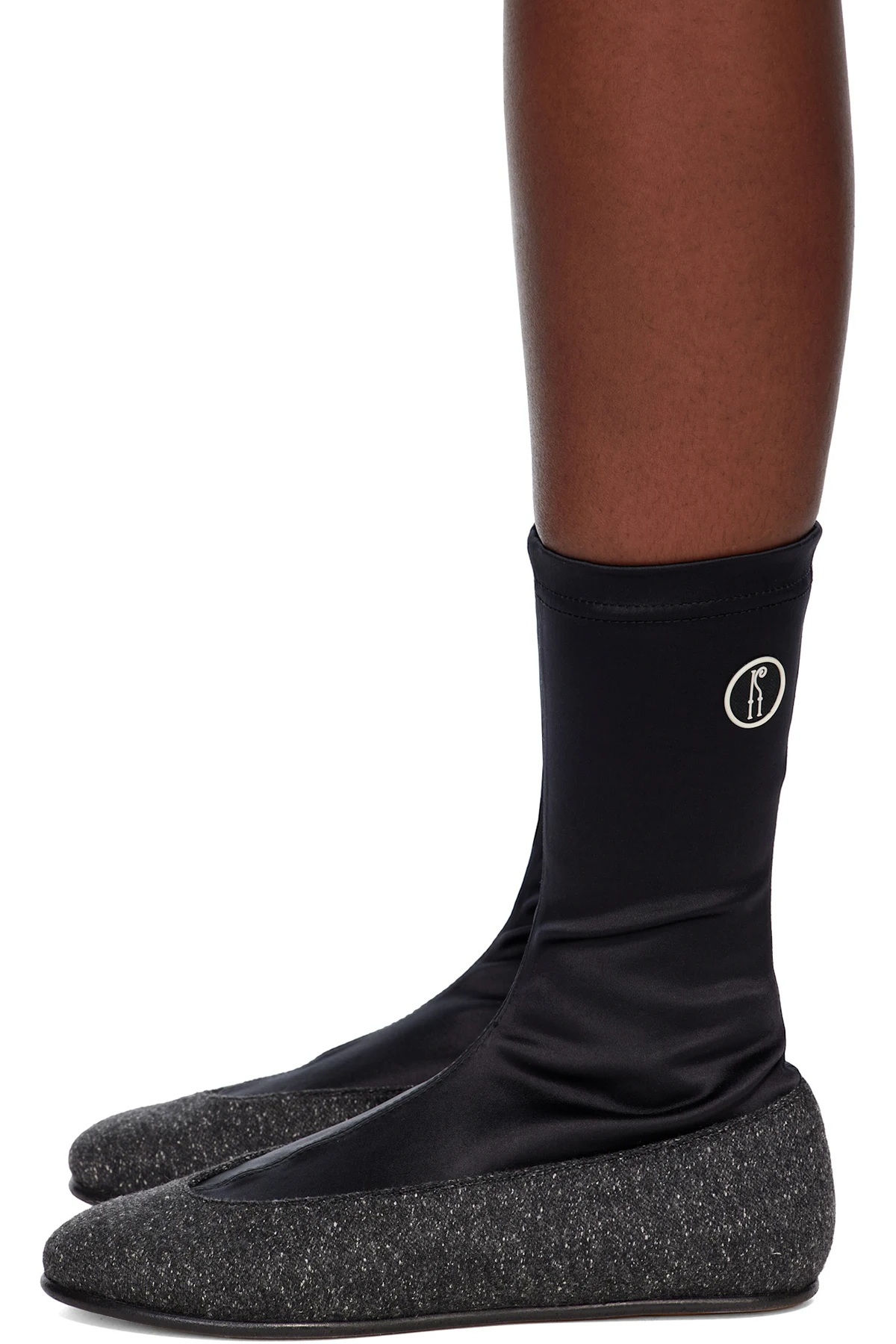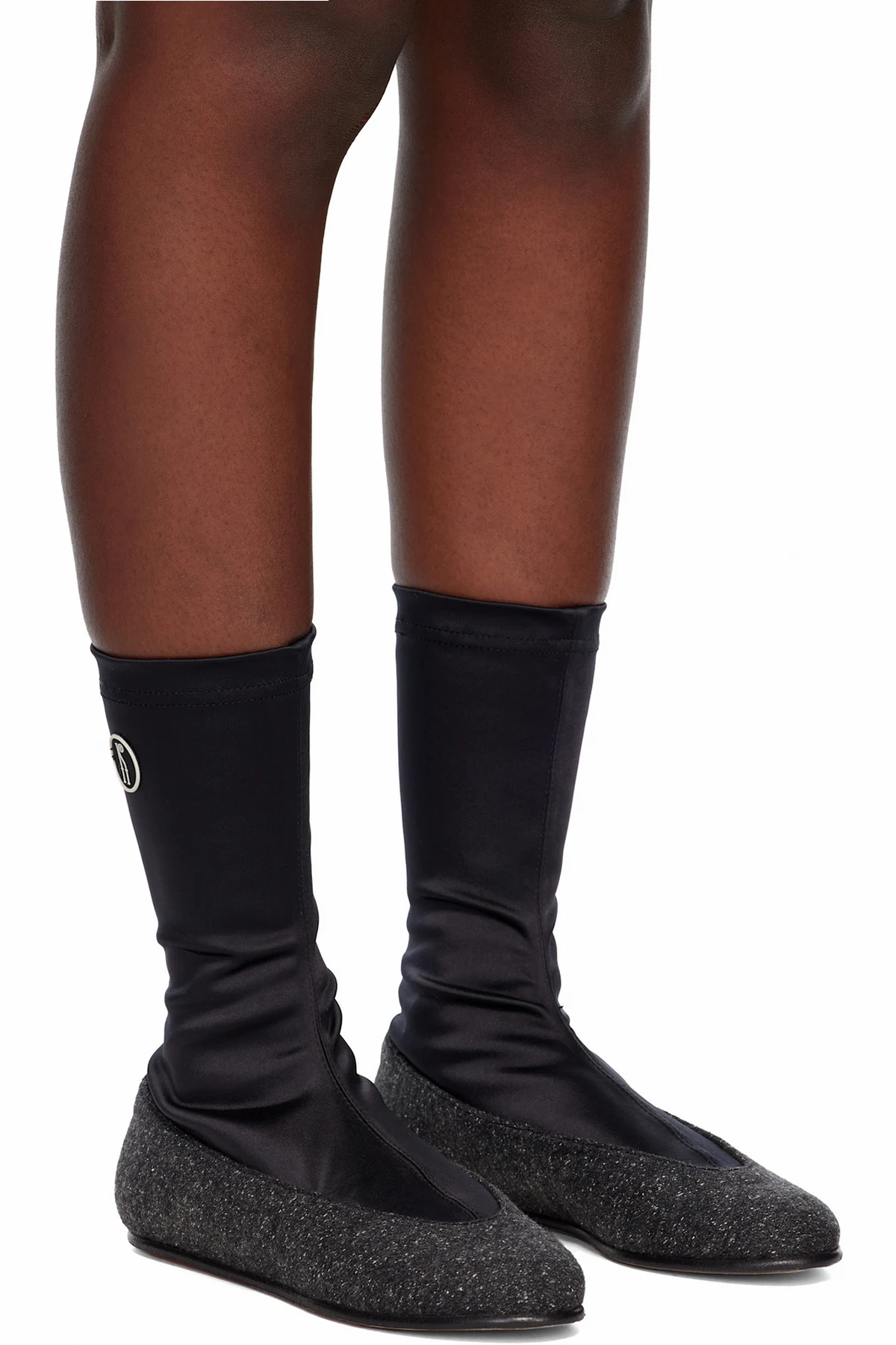 Ankle-high satin and tweed boots.