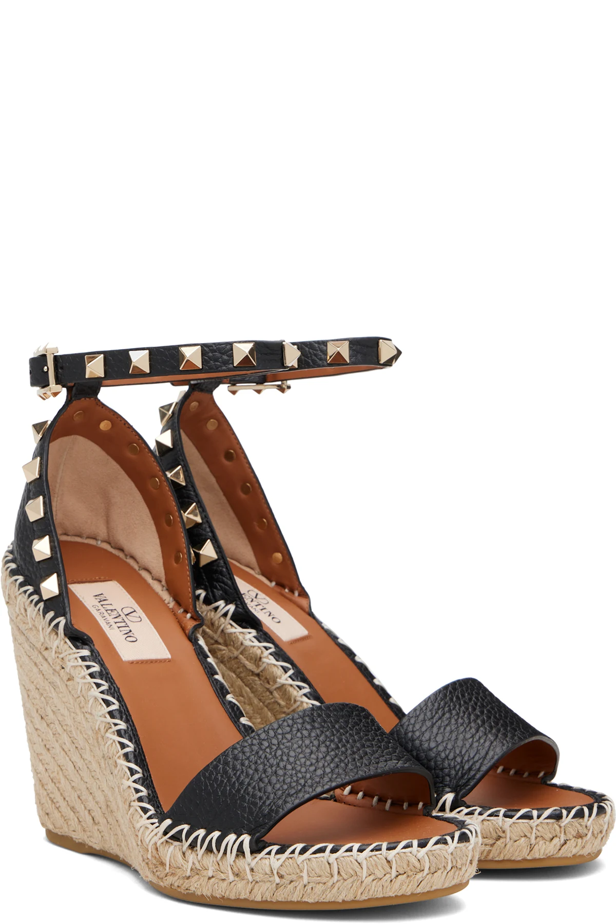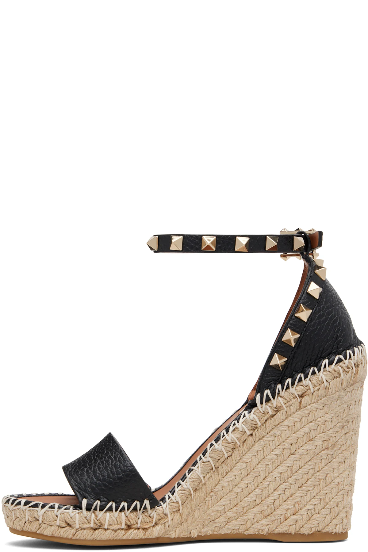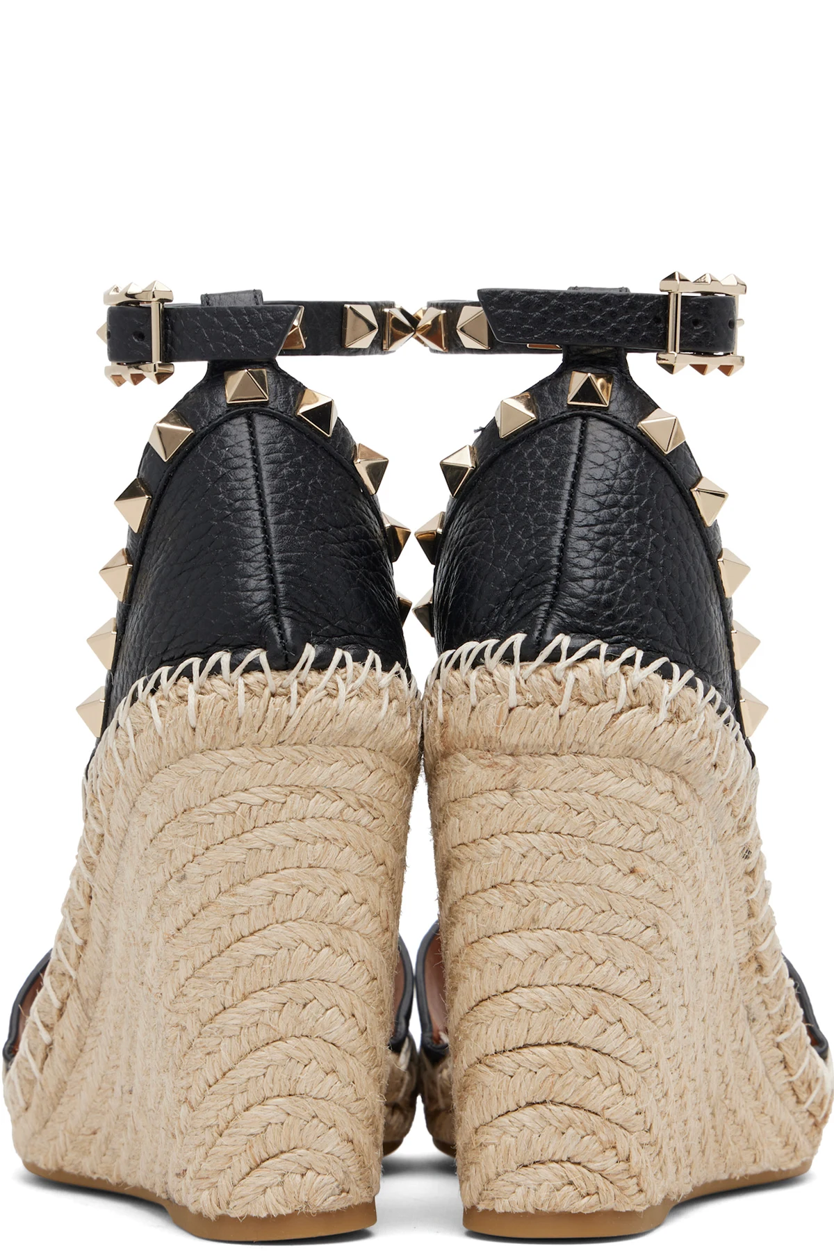 Black Double Rockstud Grainy Calfskin Wedge Sandals