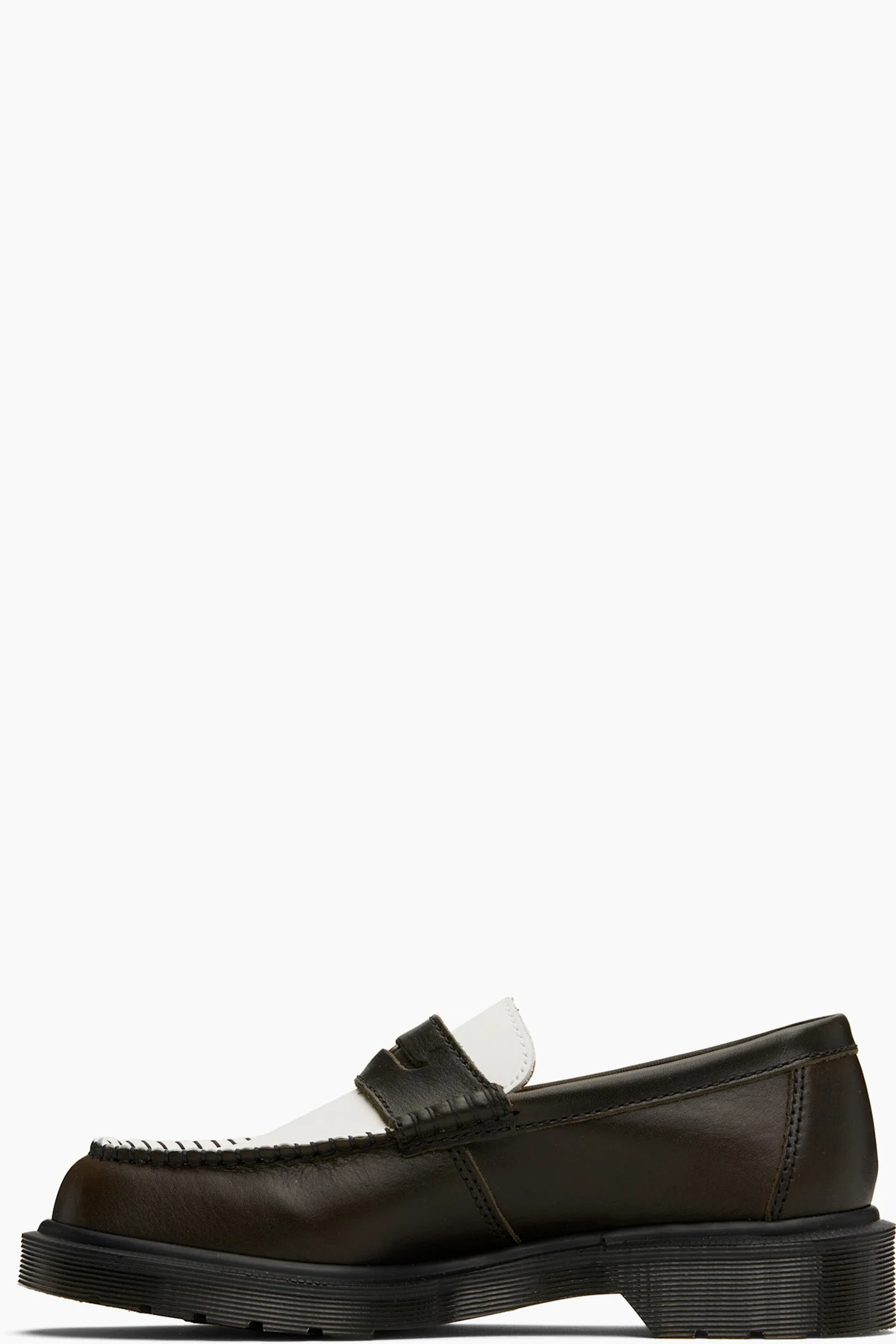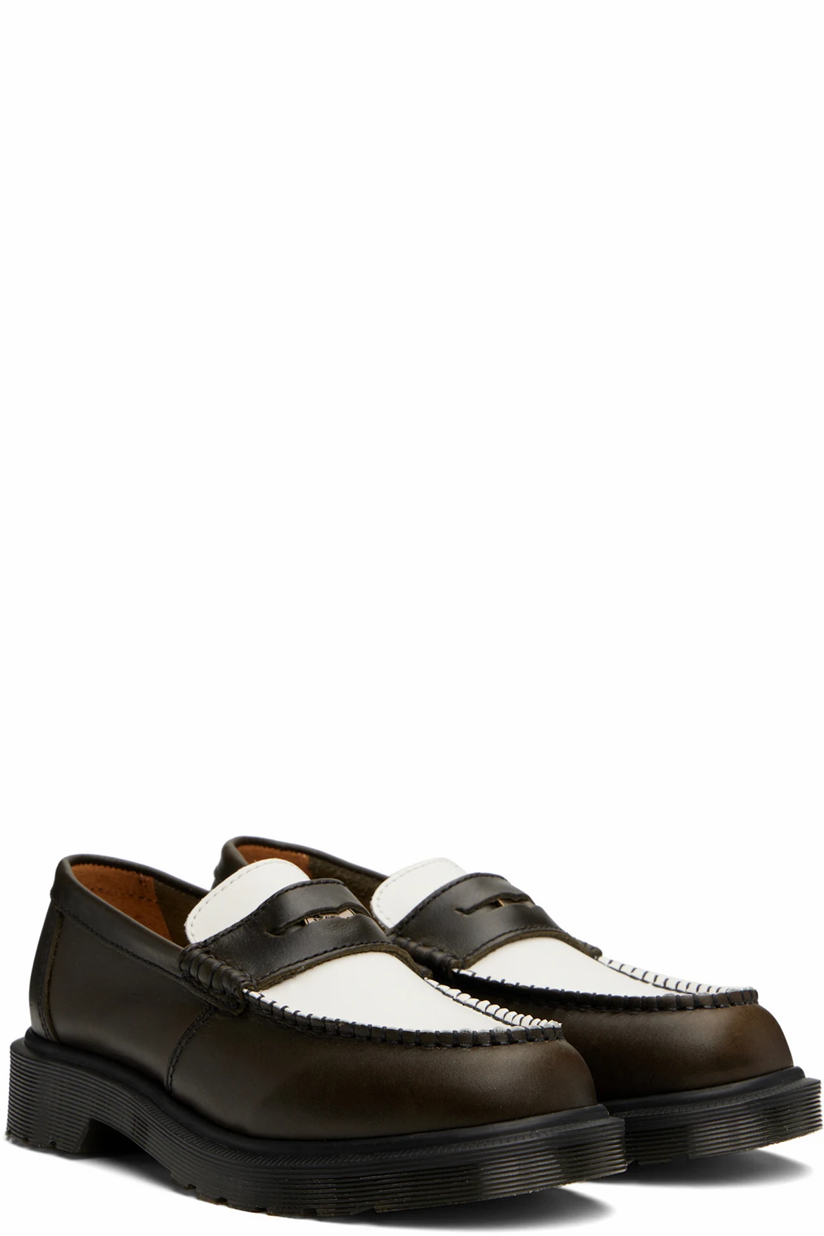 Handcrafted buffed calfskin loafers in brown and white.