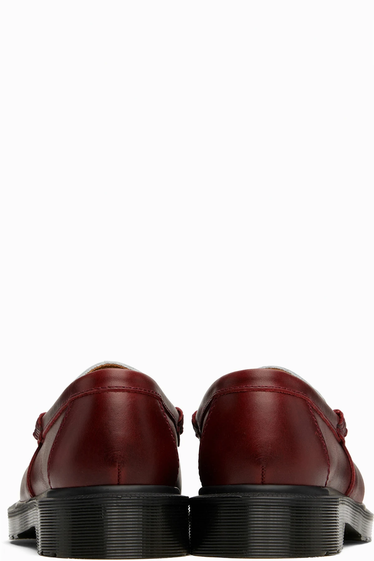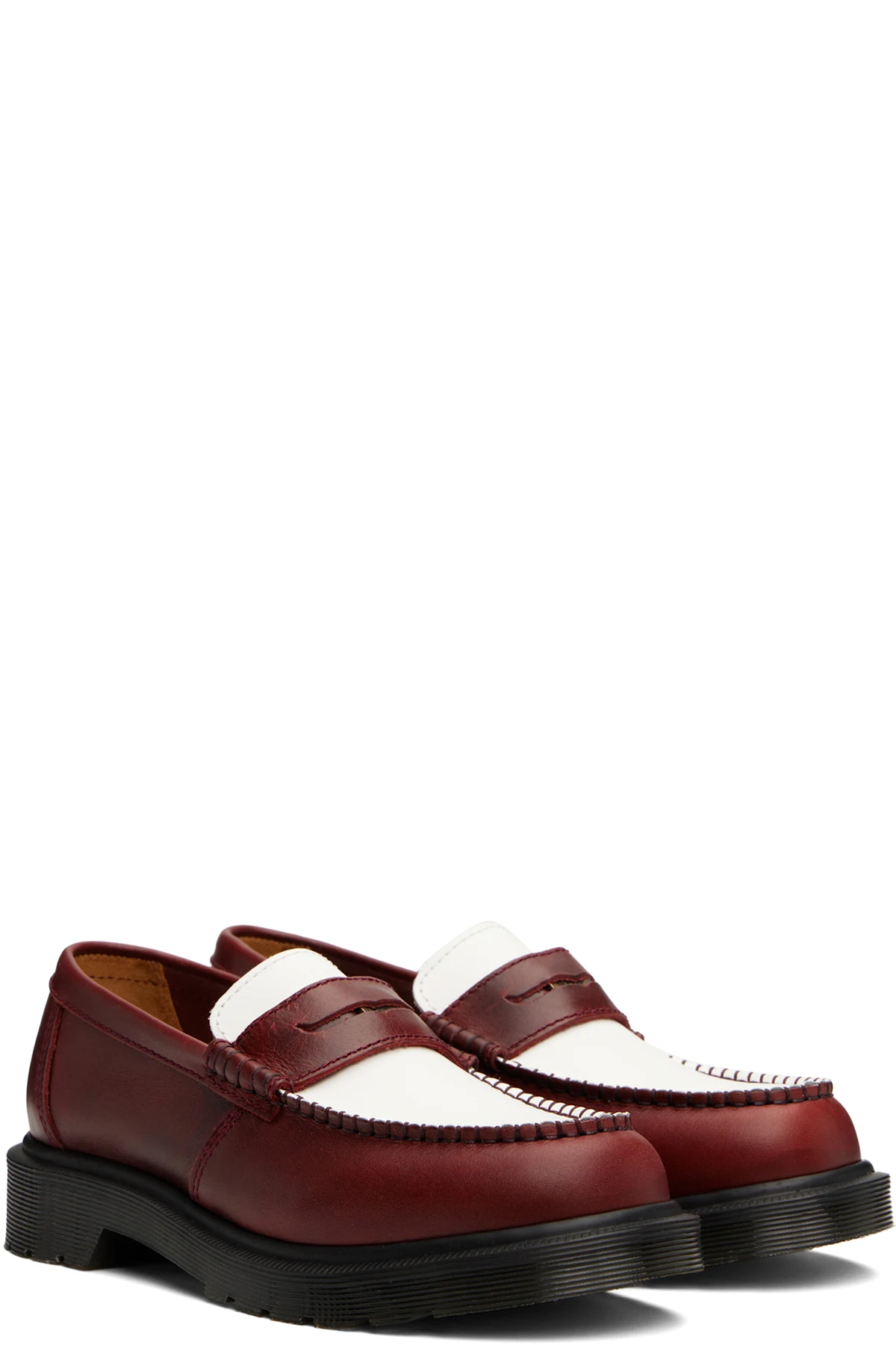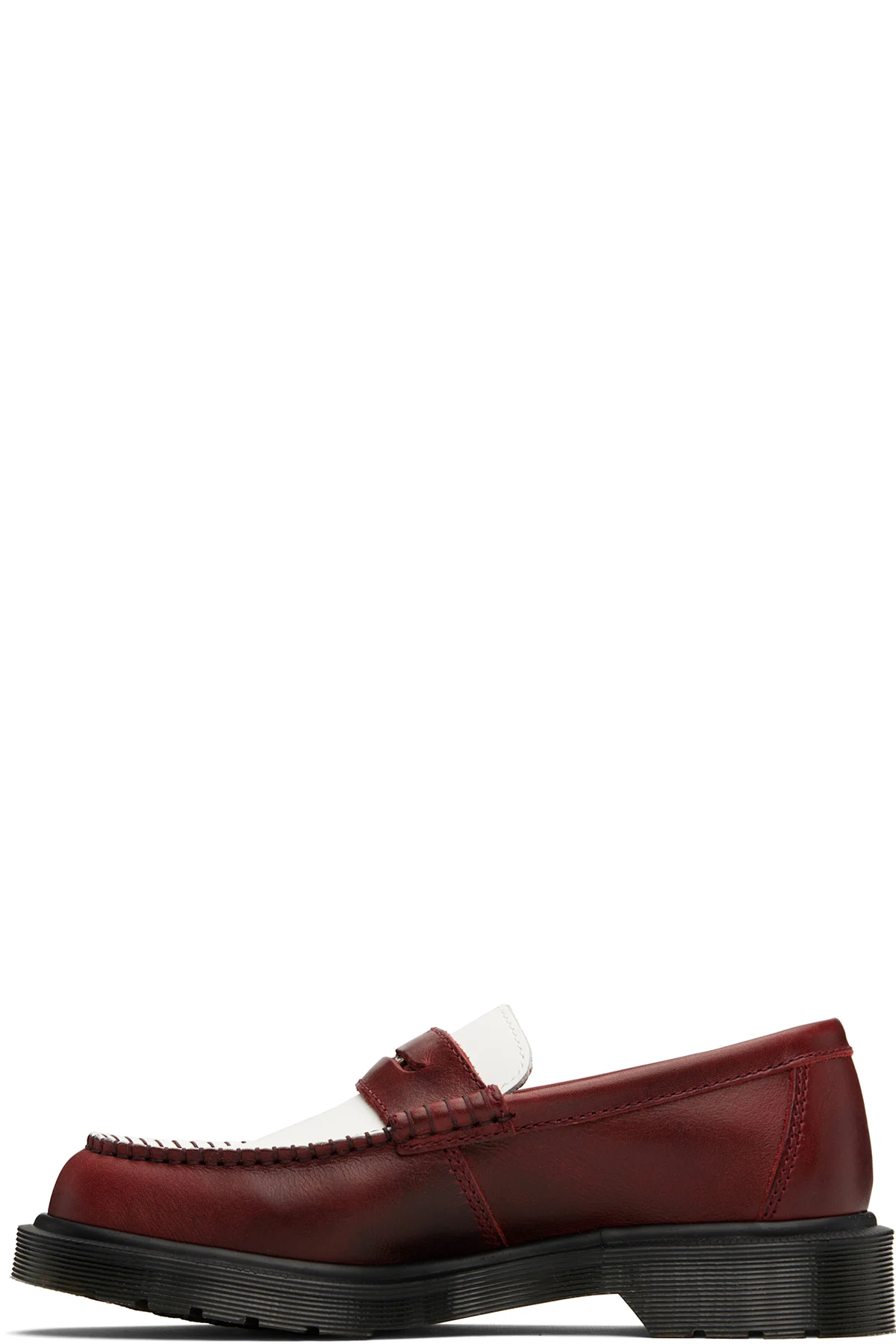 Handcrafted buffed calfskin loafers in burgundy and white.