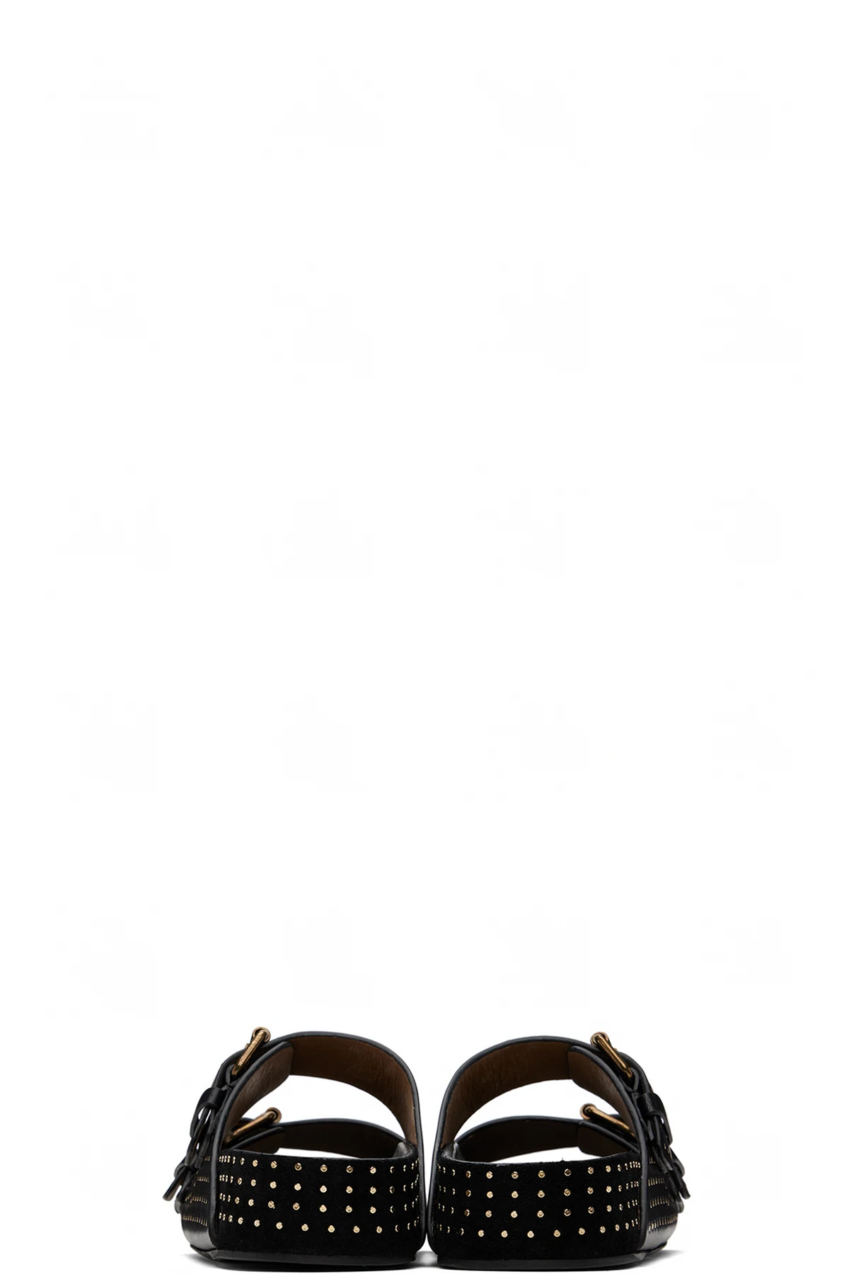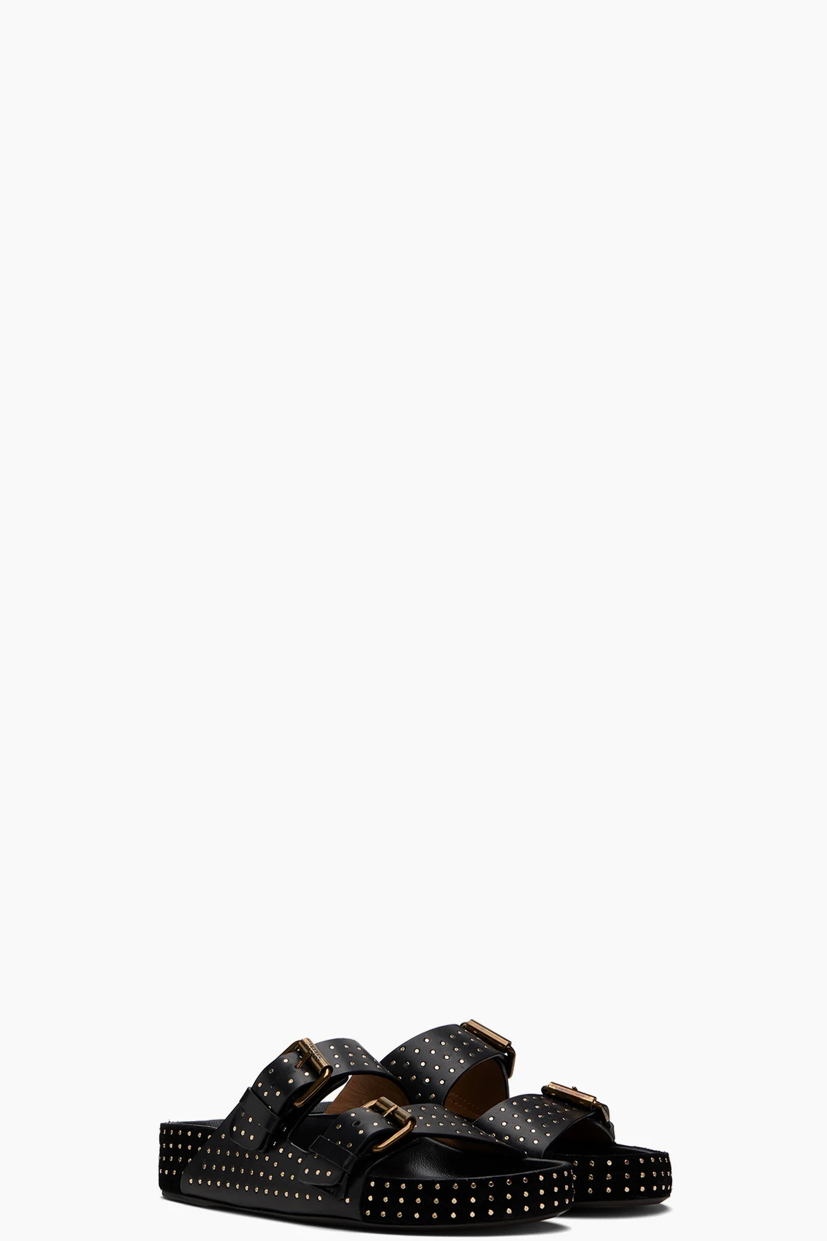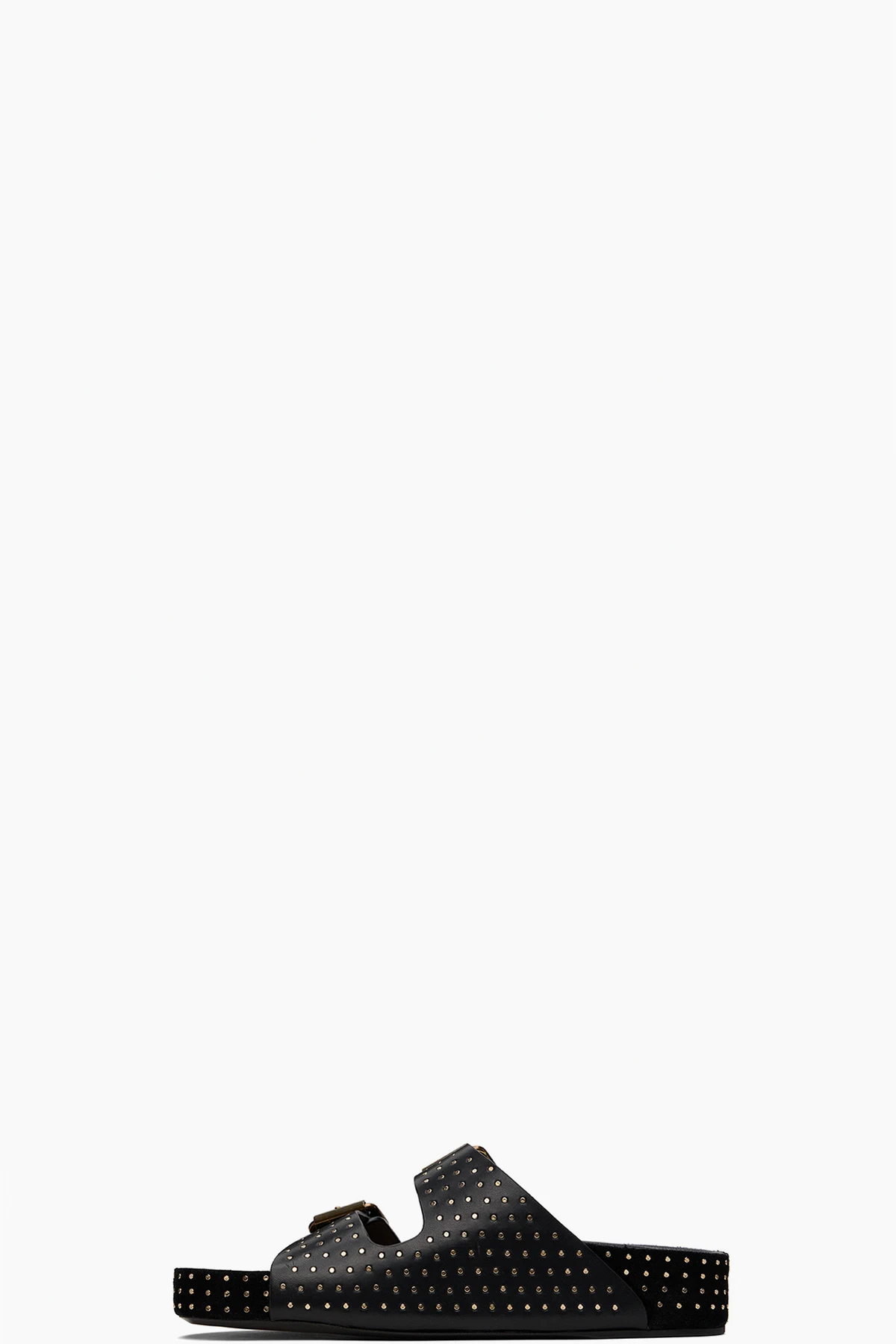 Buffed calfskin slip-on sandals in black. Studs throughout.