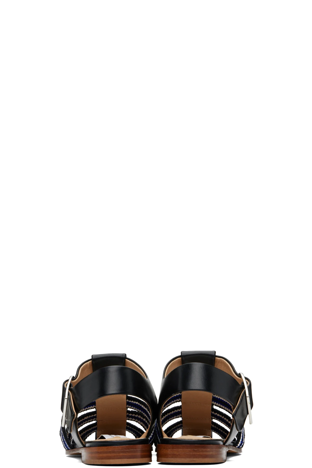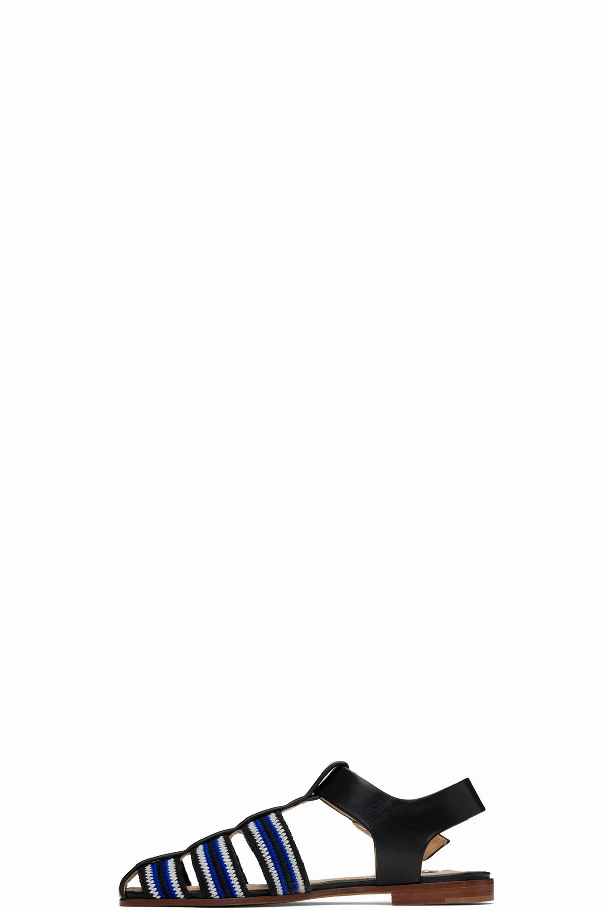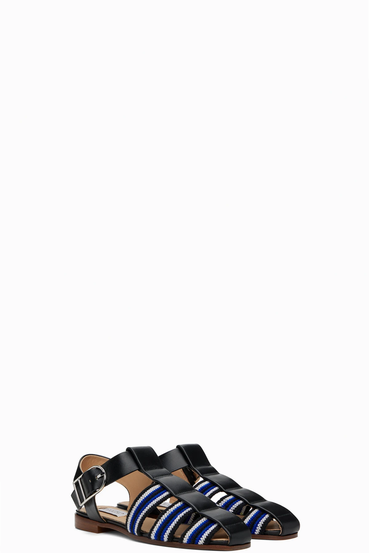 Crochet cotton and grained lambskin flat sandals in black and blue.