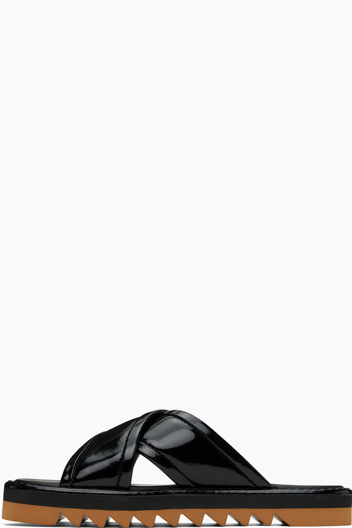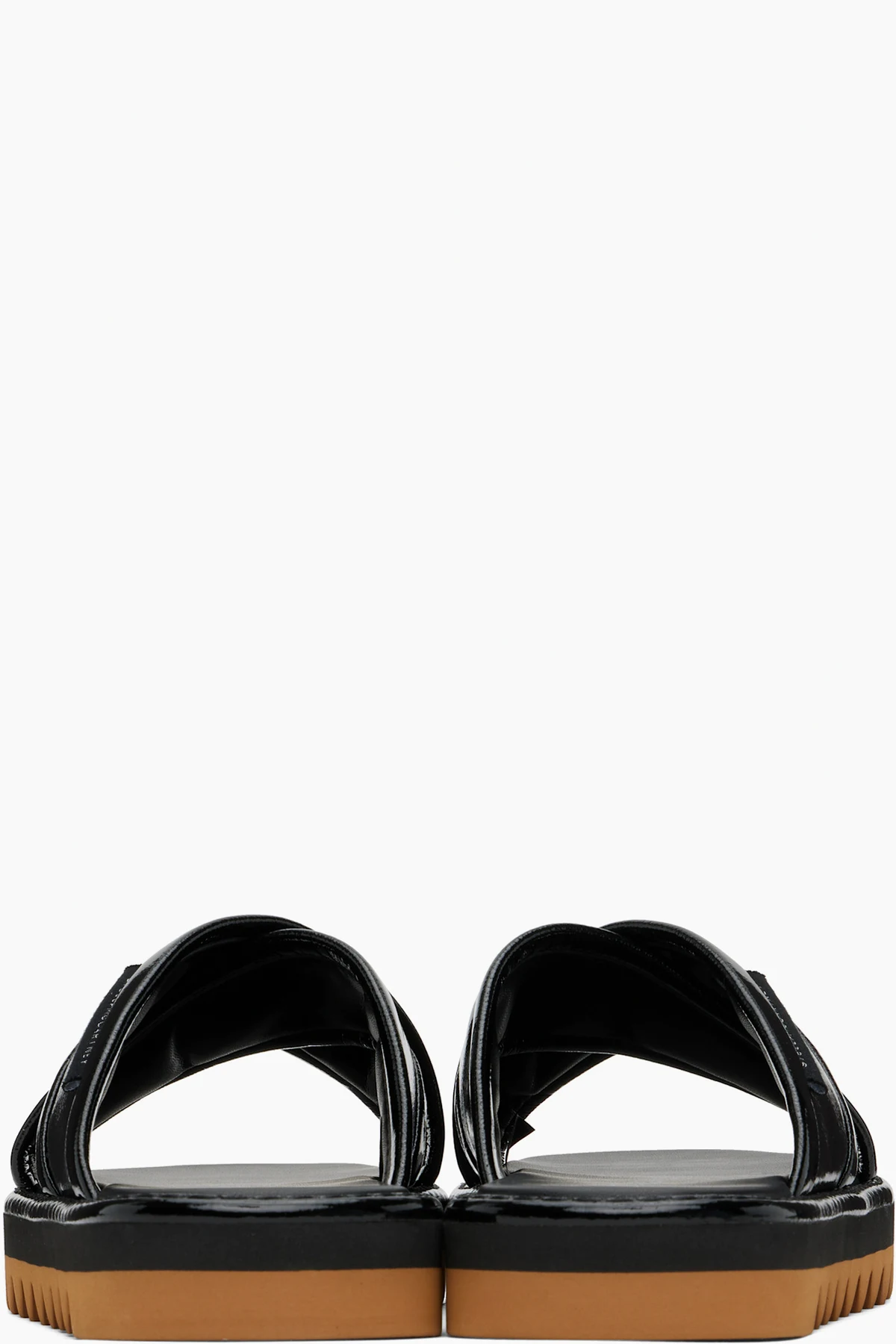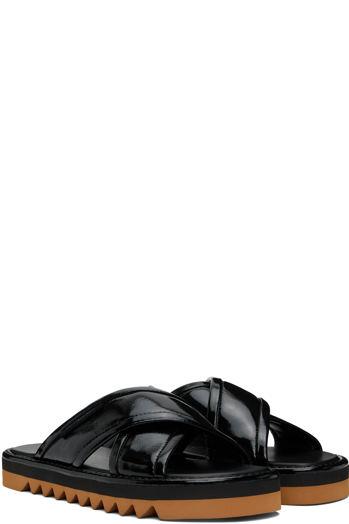 Handcrafted patent faux-leather flat sandals in black.