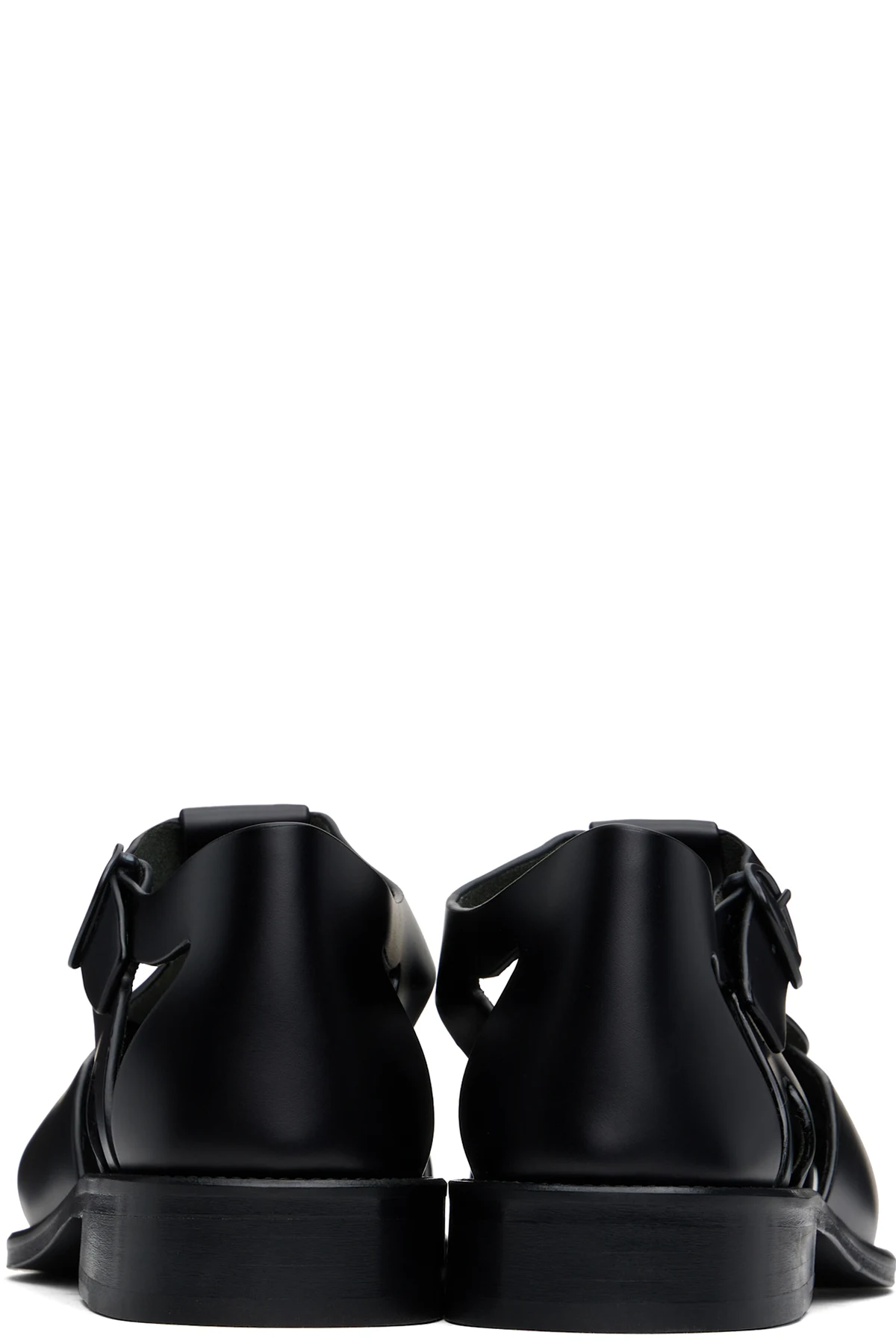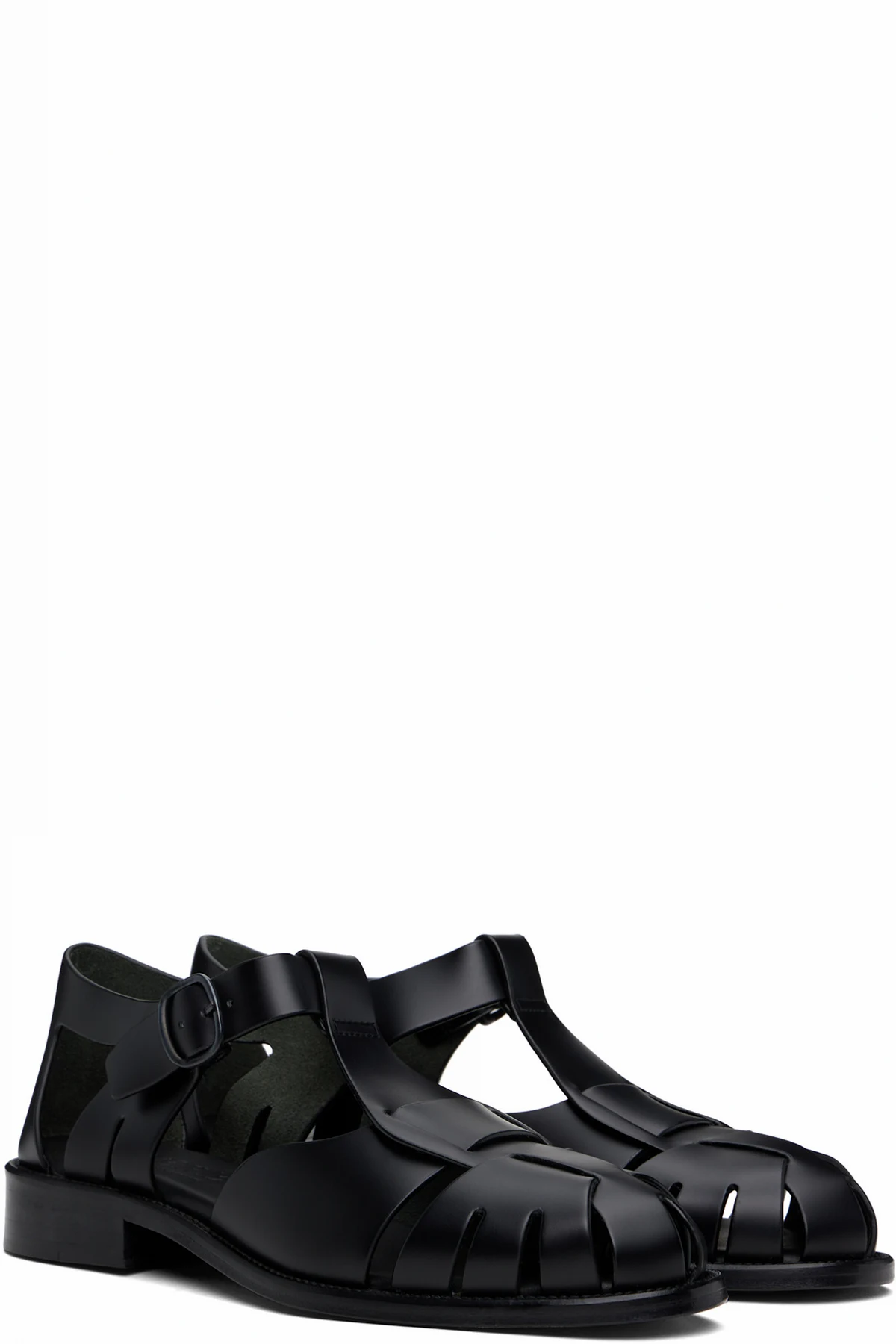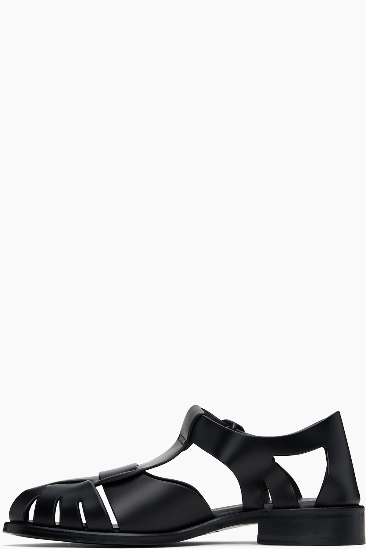 Handcrafted polished calfskin flat sandals in black.