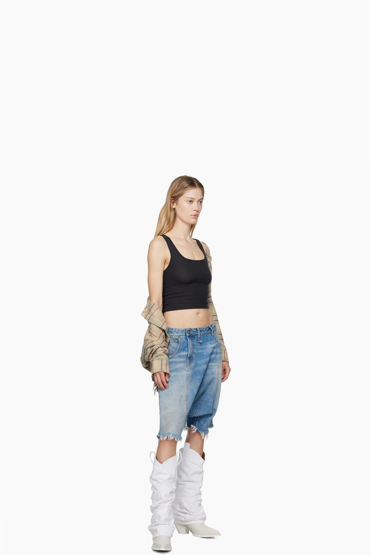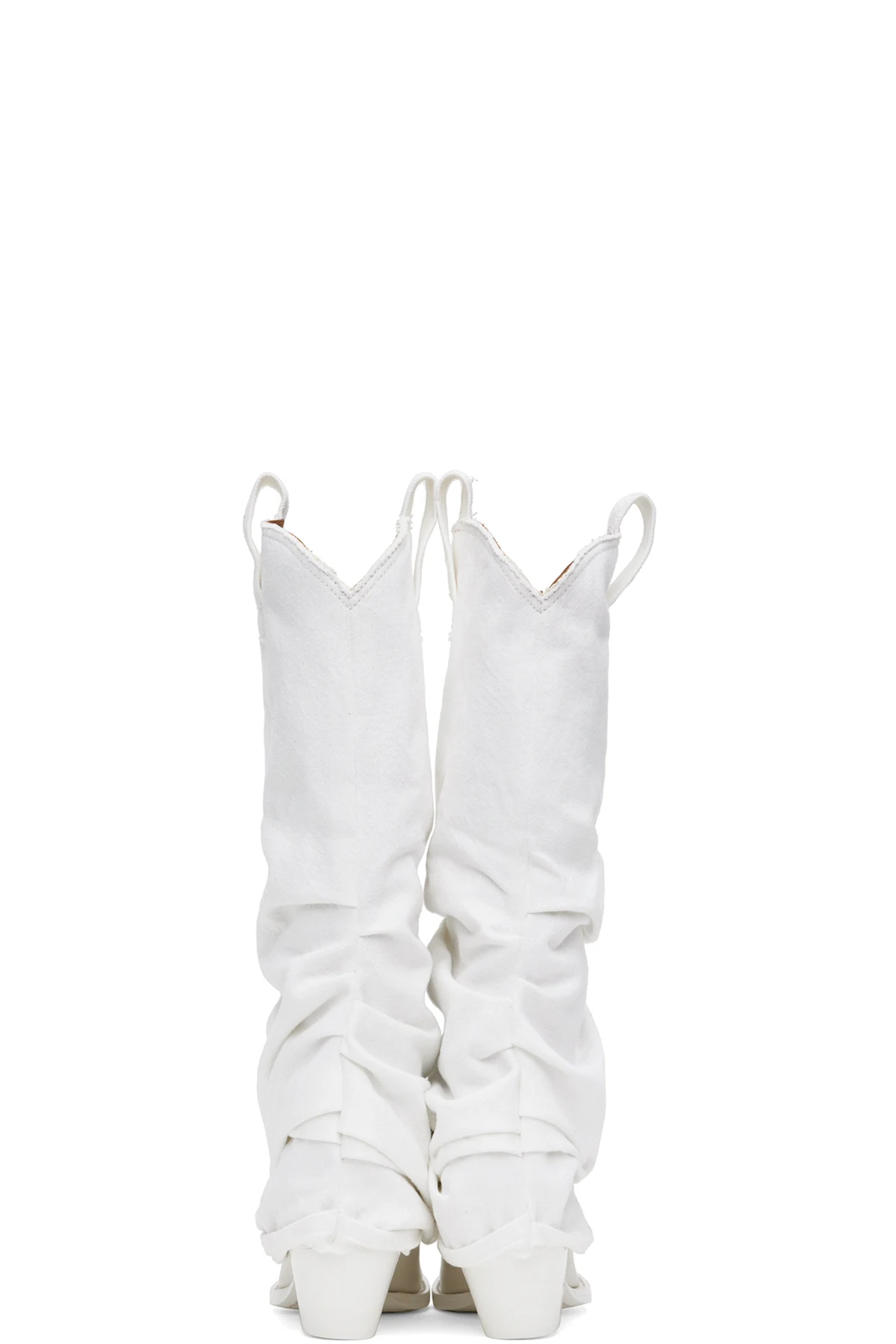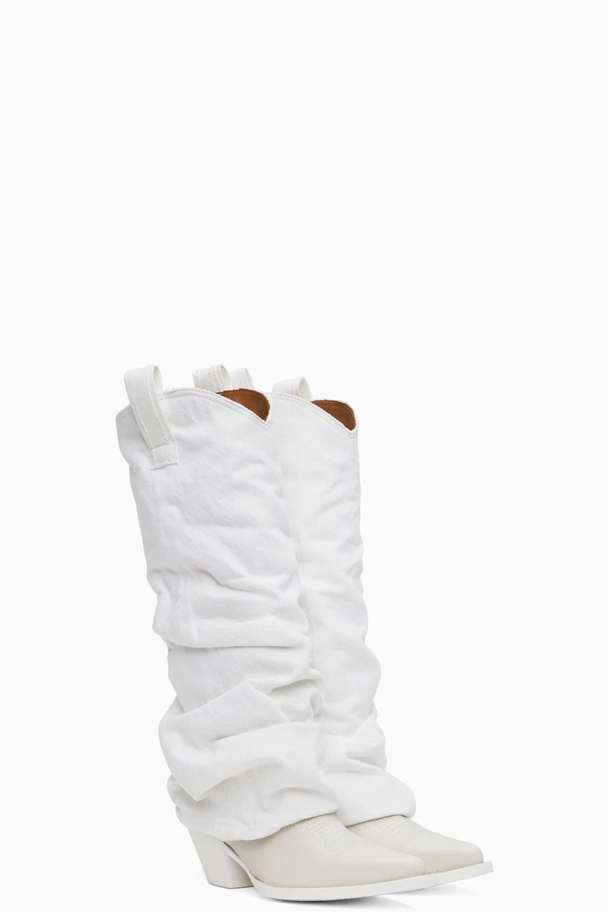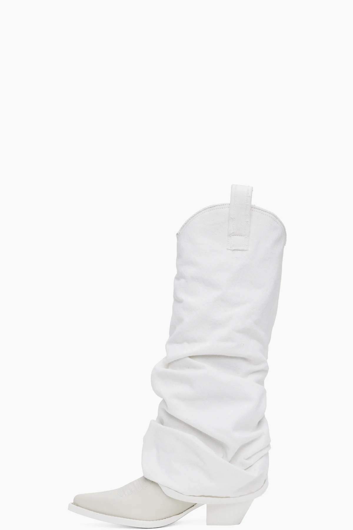 Knee-high non-stretch denim and buffed leather boots in white.