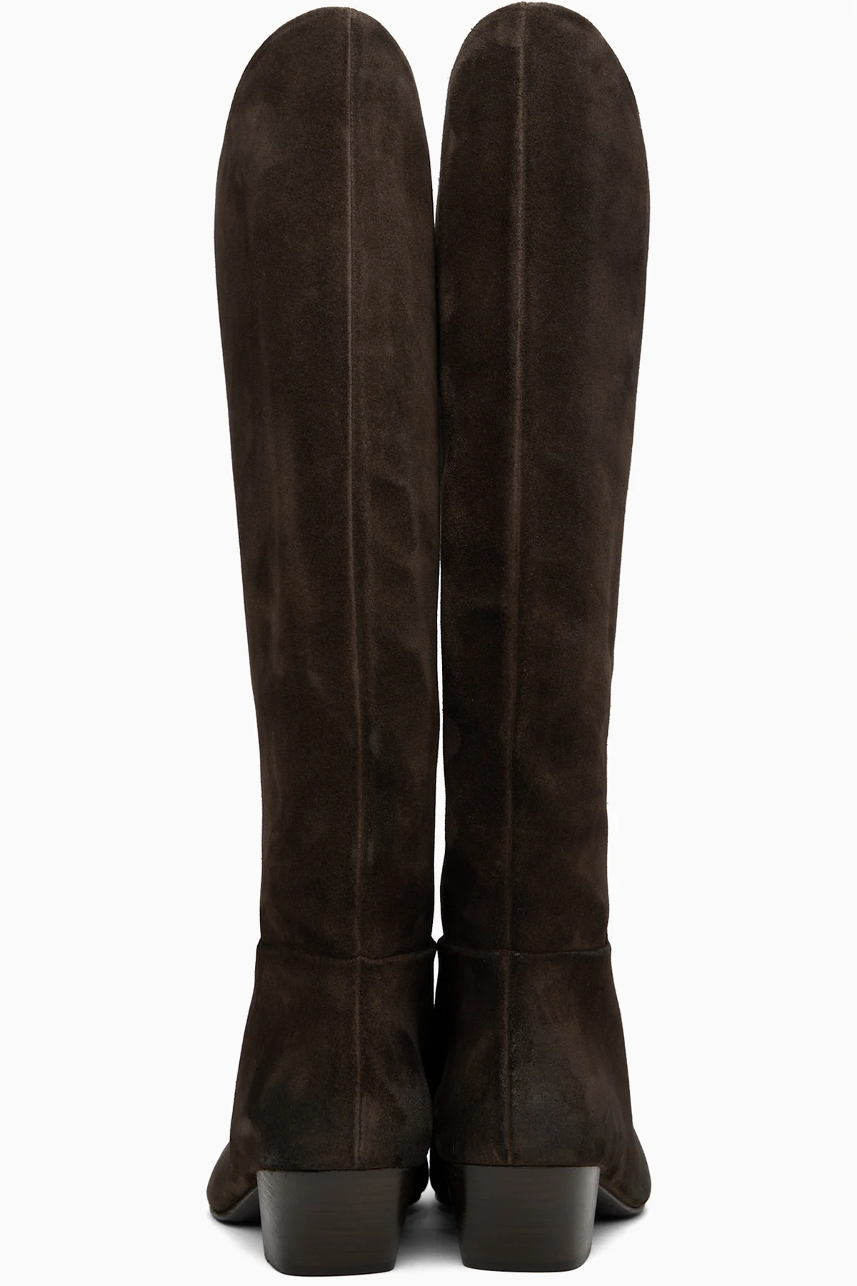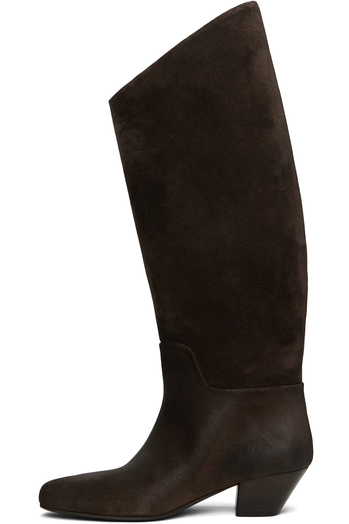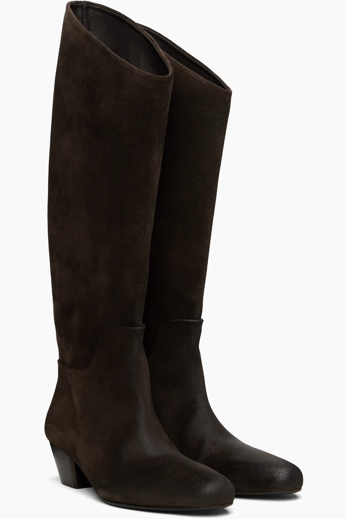 Knee-high calfskin suede boots. Subtle distressing throughout.