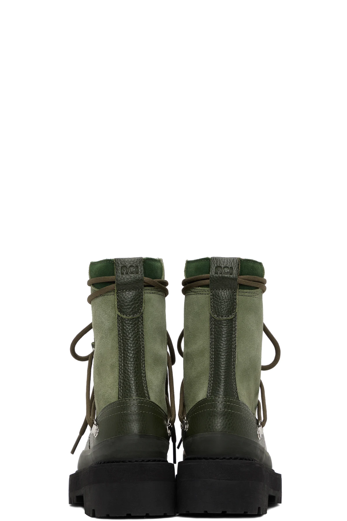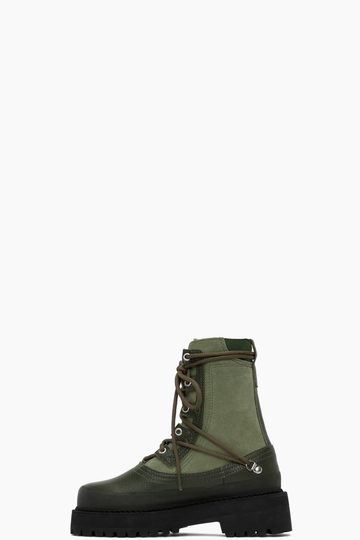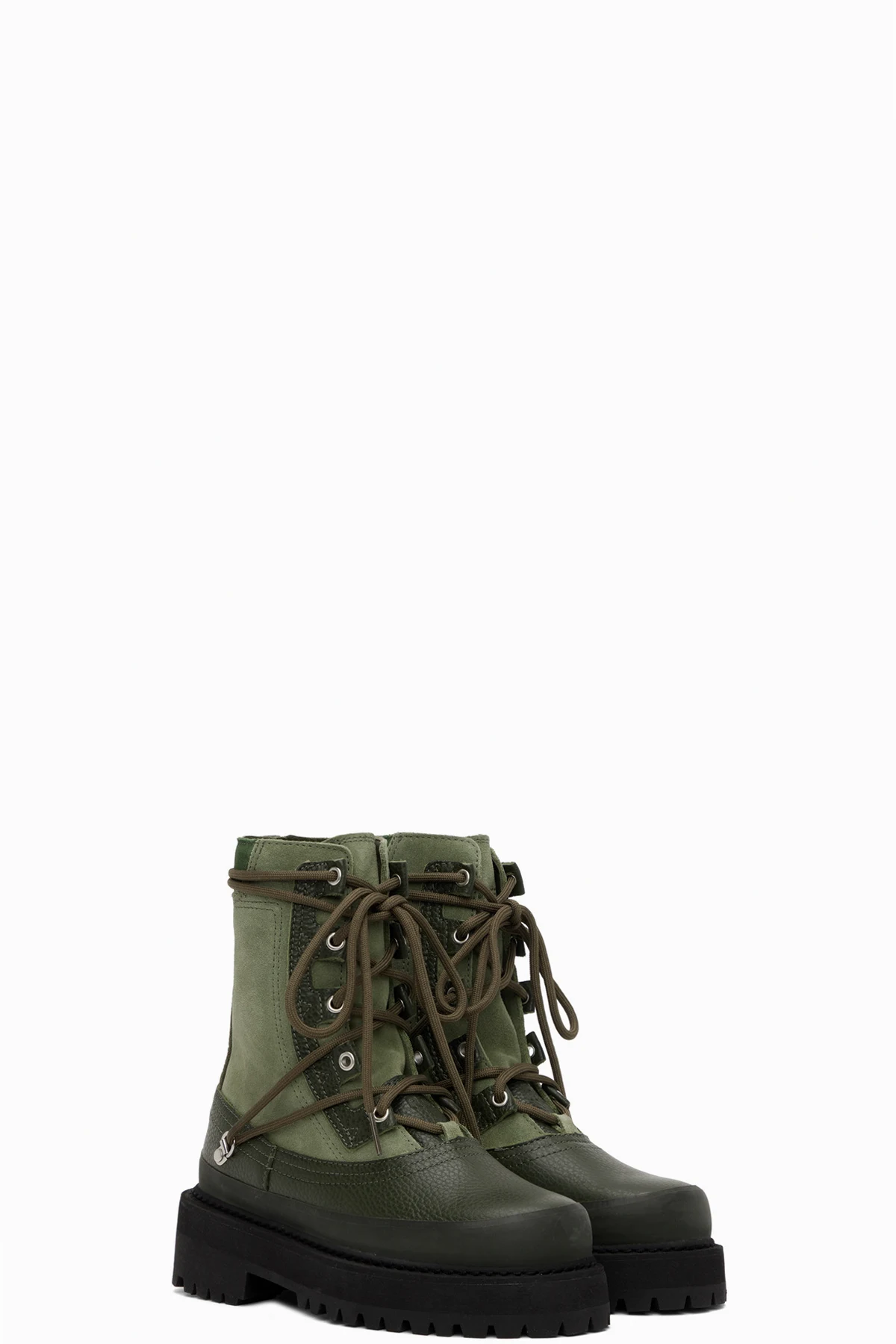Handcrafted ankle-high paneled grained leather and suede boots in green.