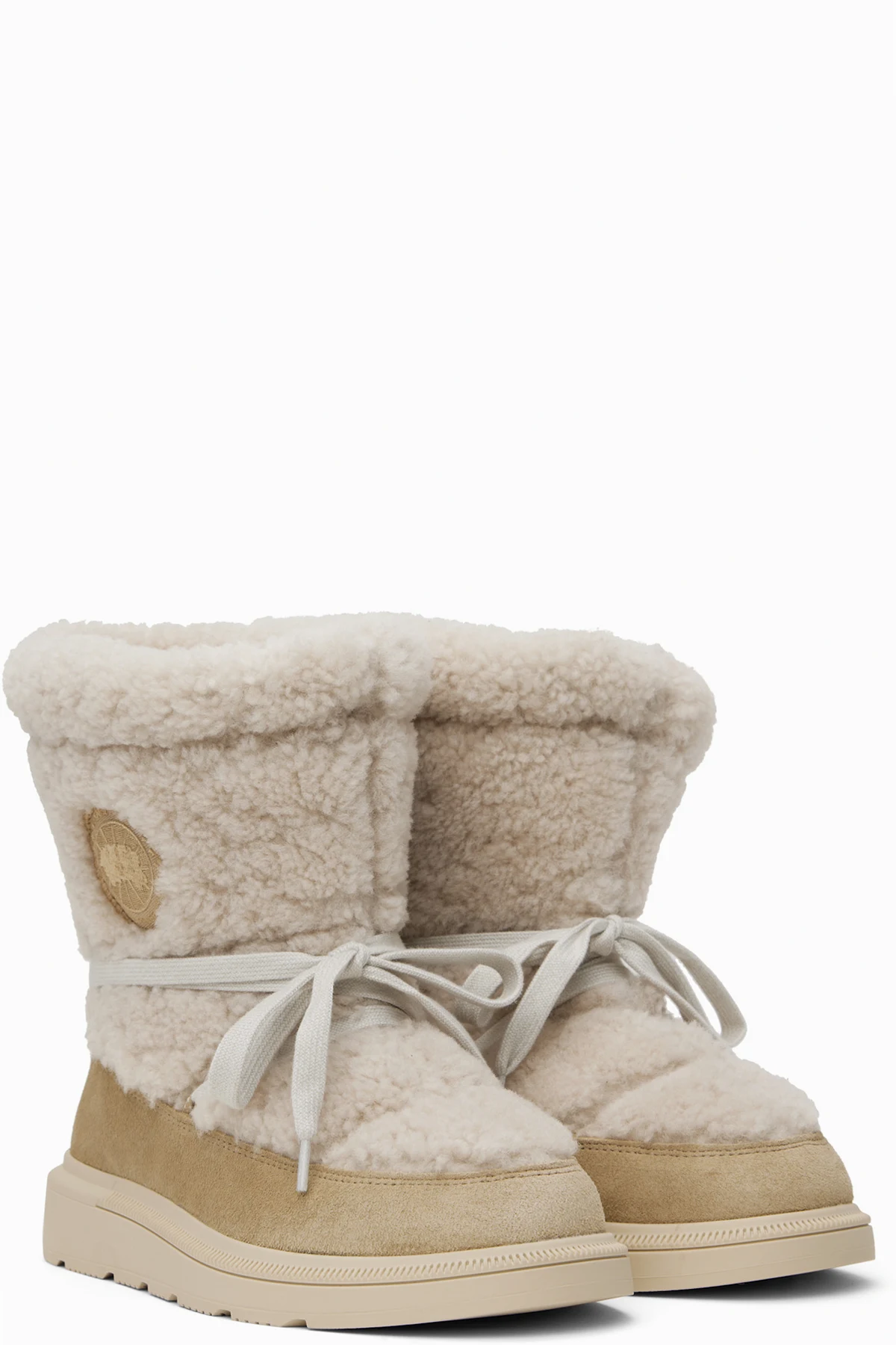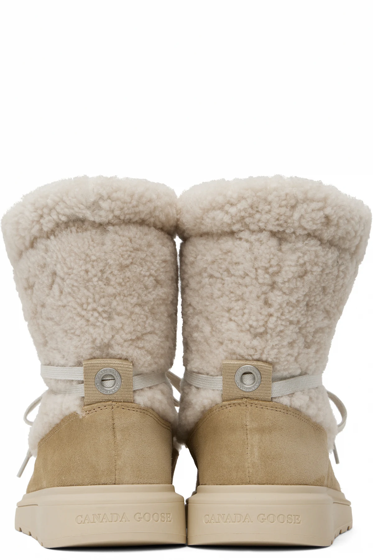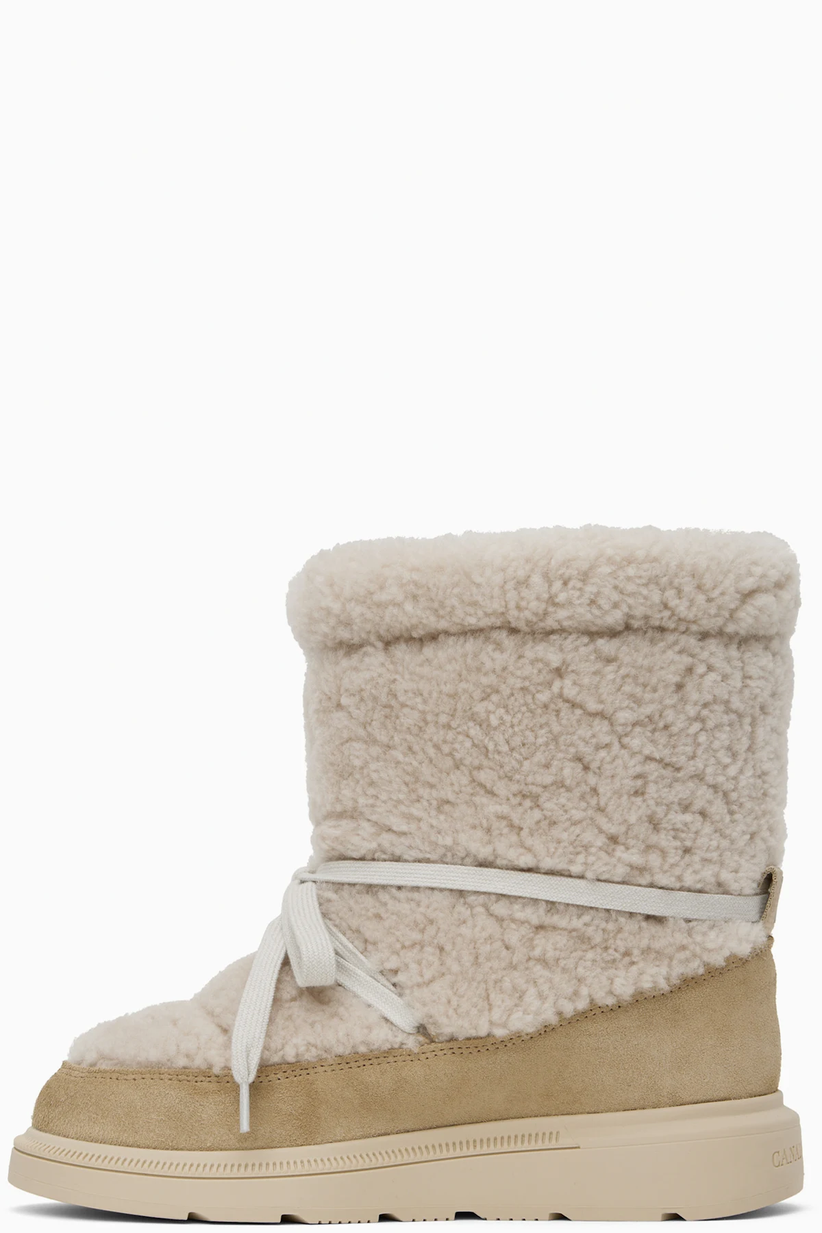Ankle-high insulated sheepskin shearling and suede boots in beige.