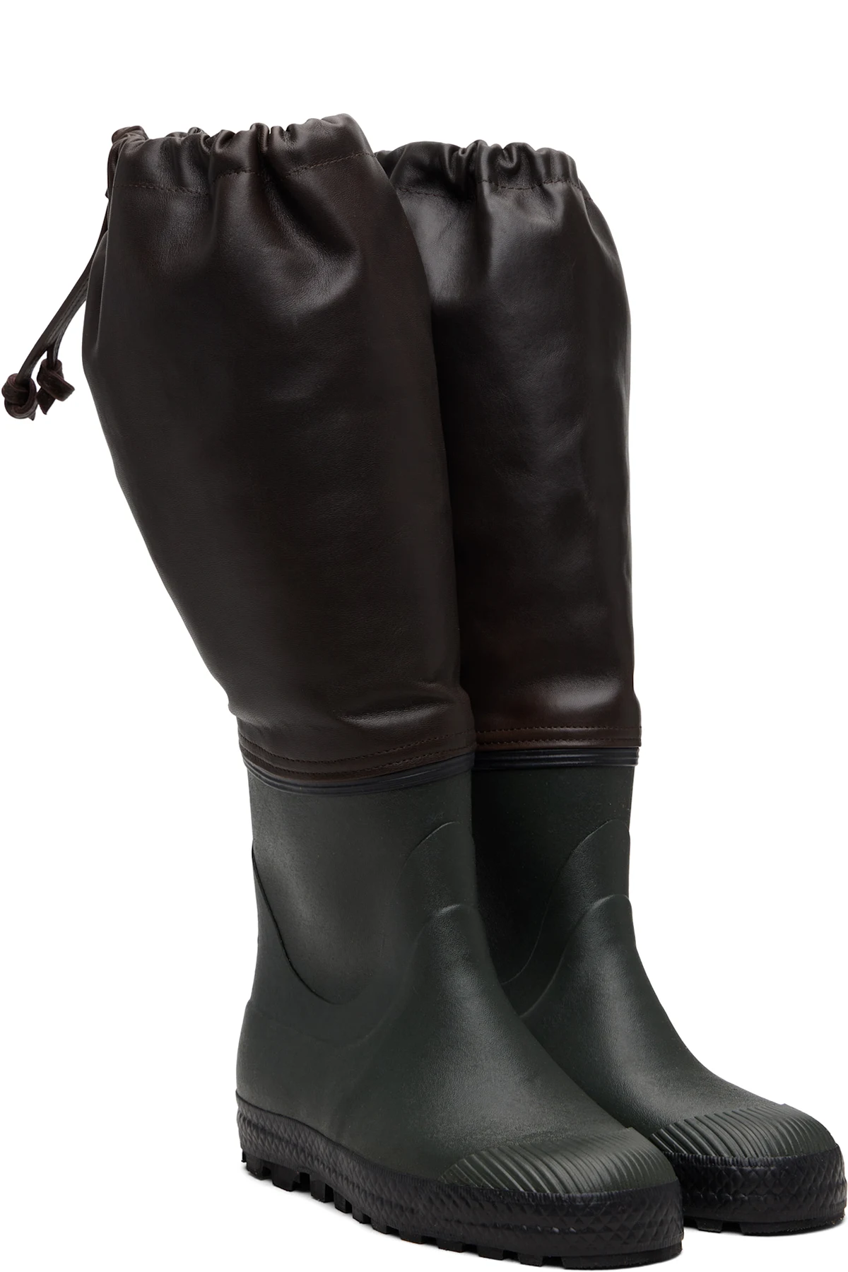 Knee-high paneled rubber and grained leather boots.