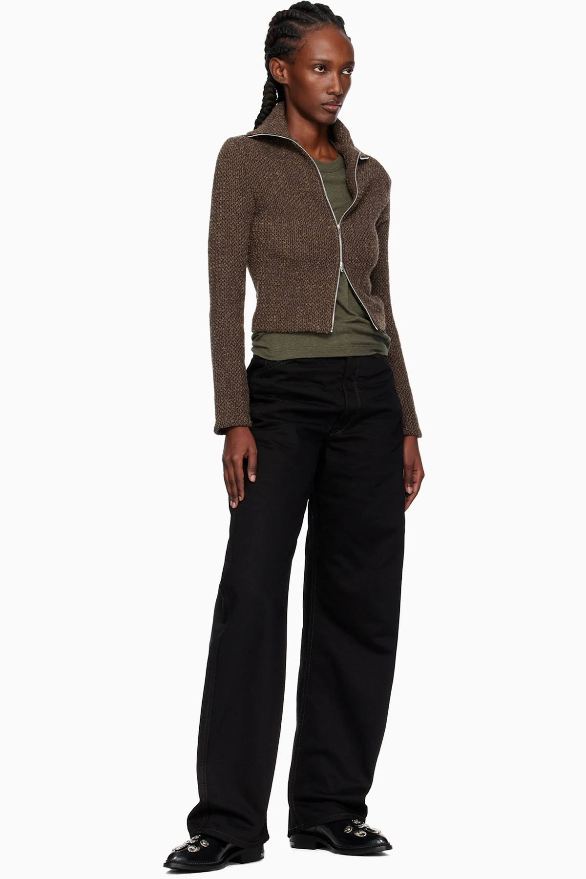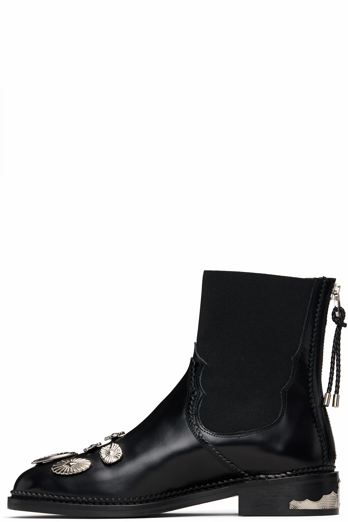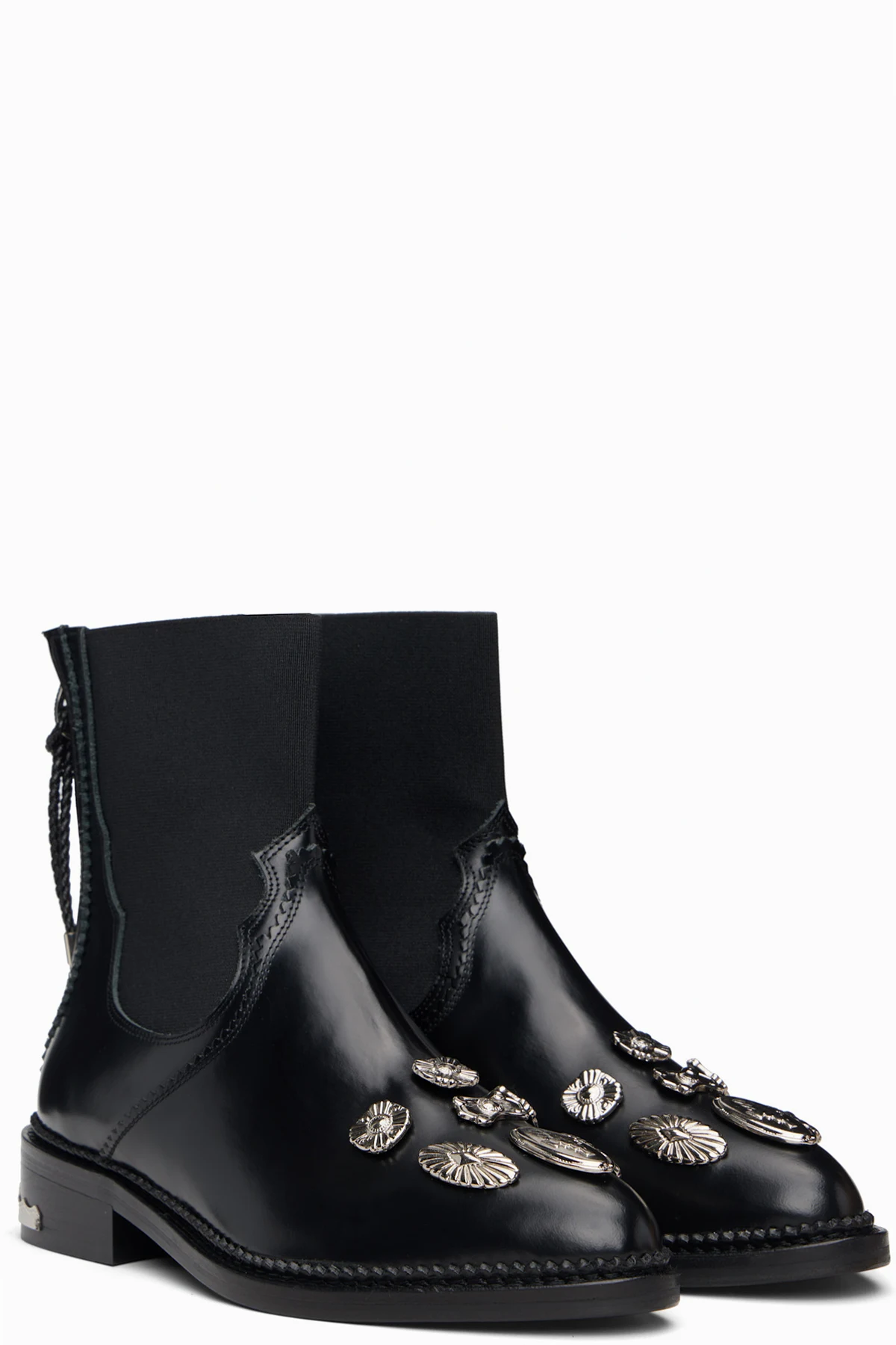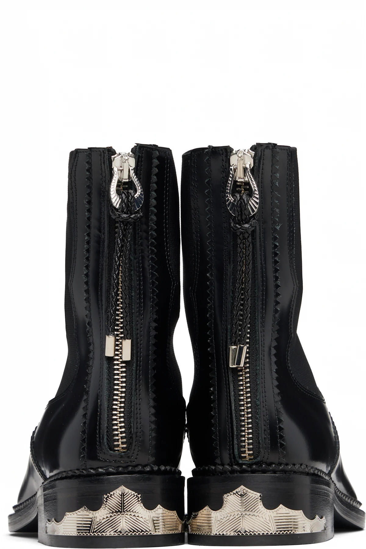 Ankle-high polished leather boots.