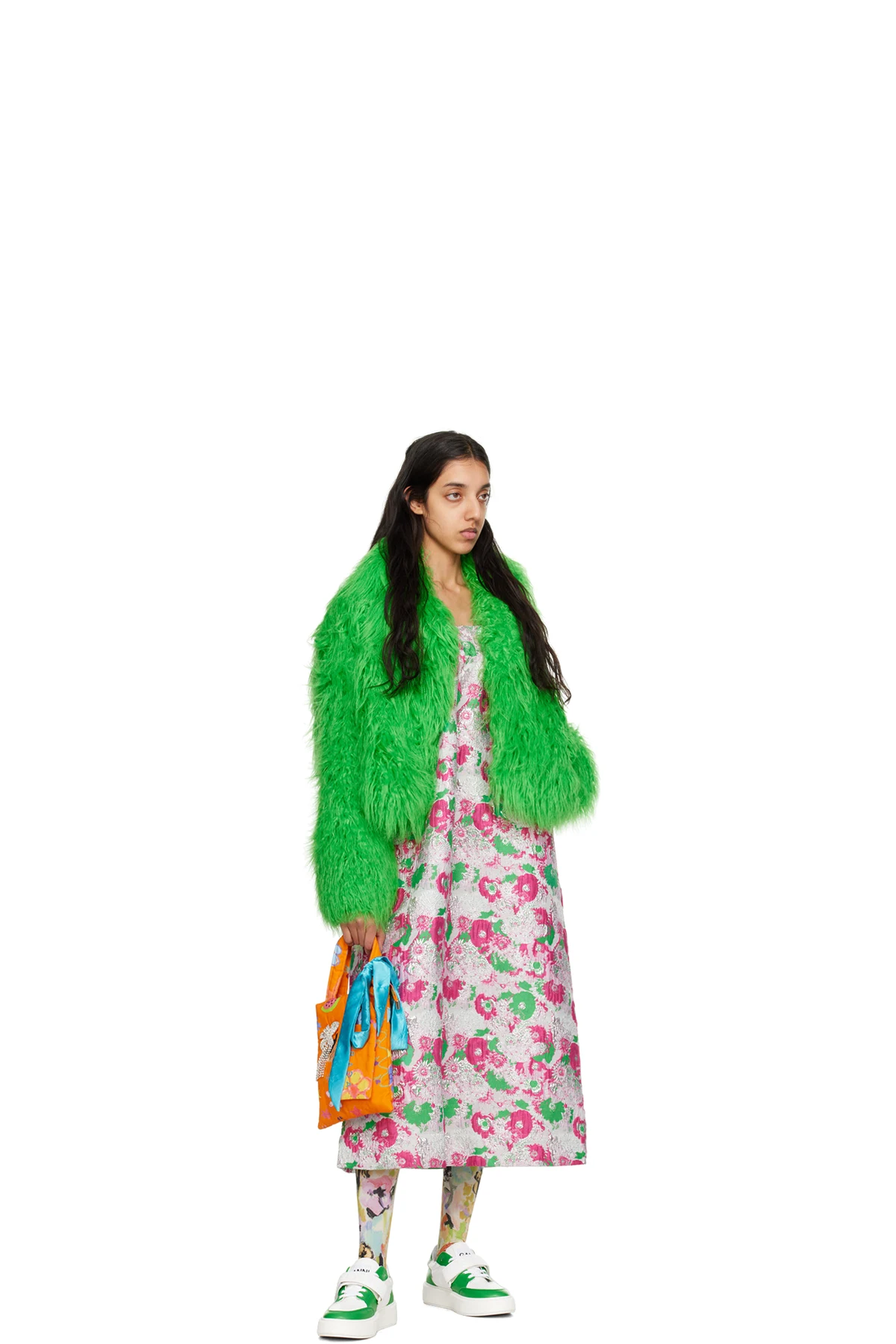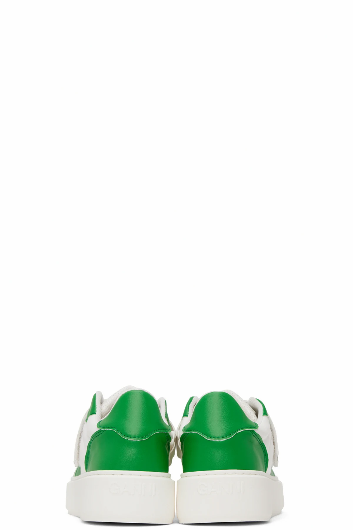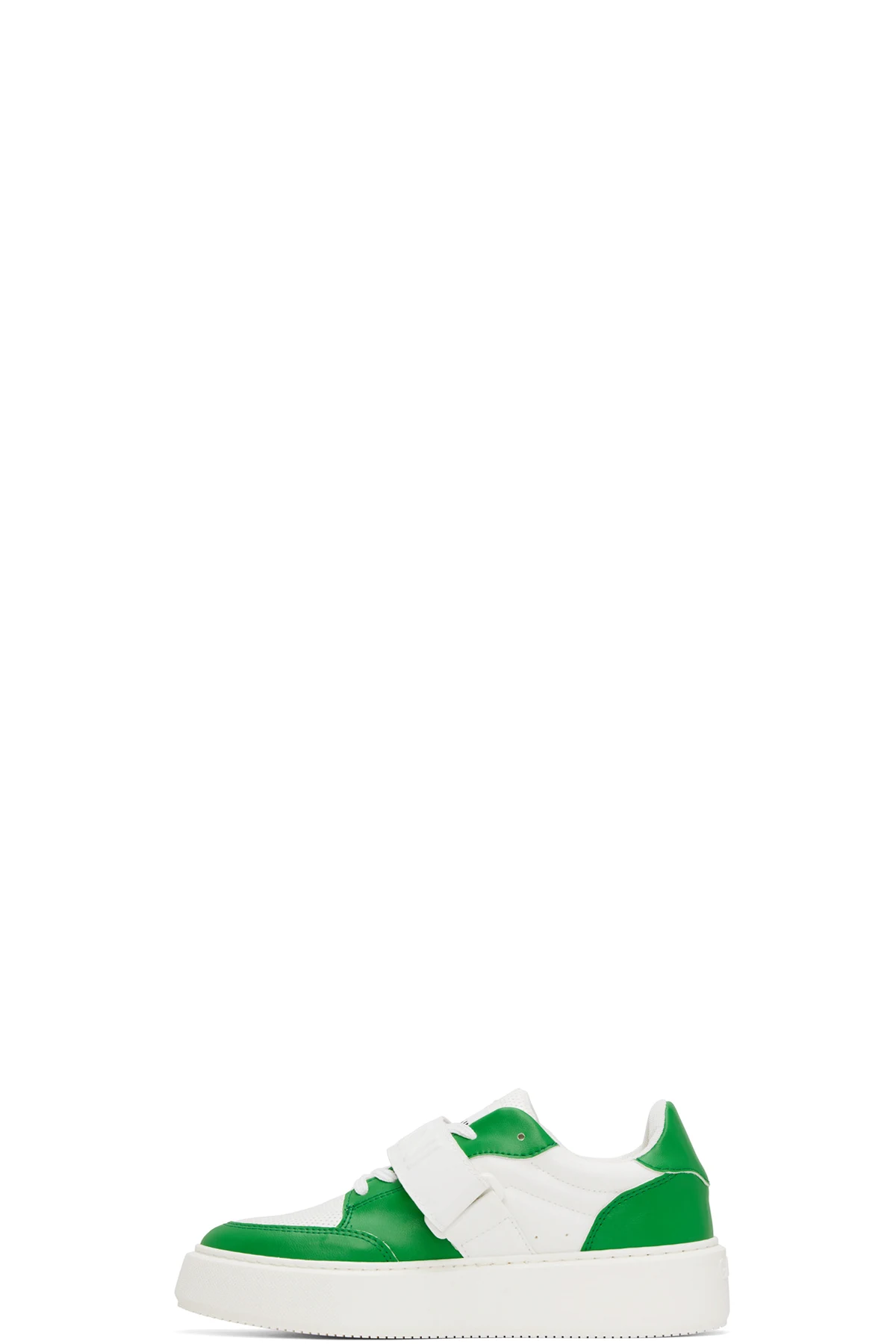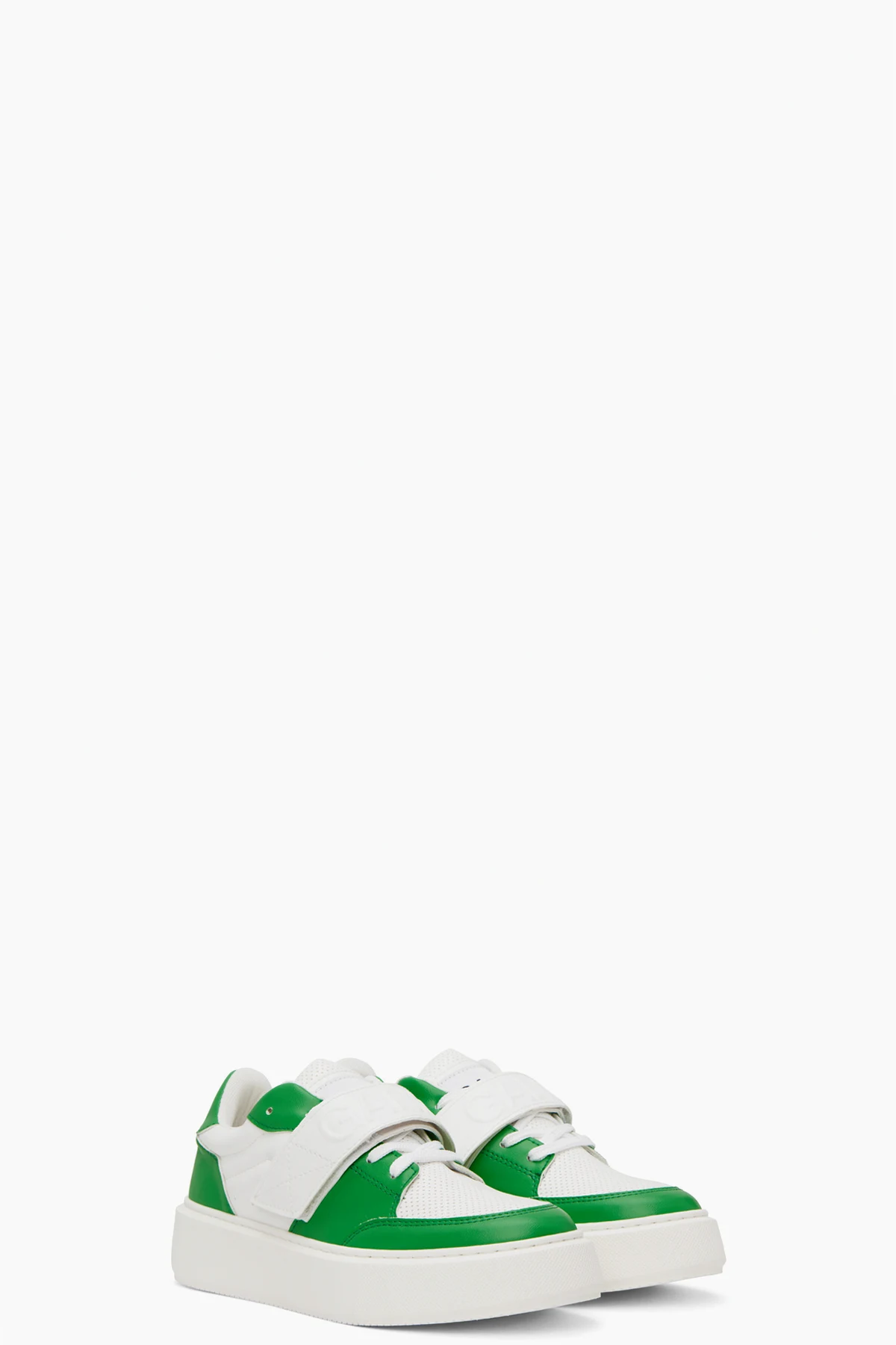 Low-top paneled buffed faux-leather sneakers in green and white. Perforated detailing throughout.