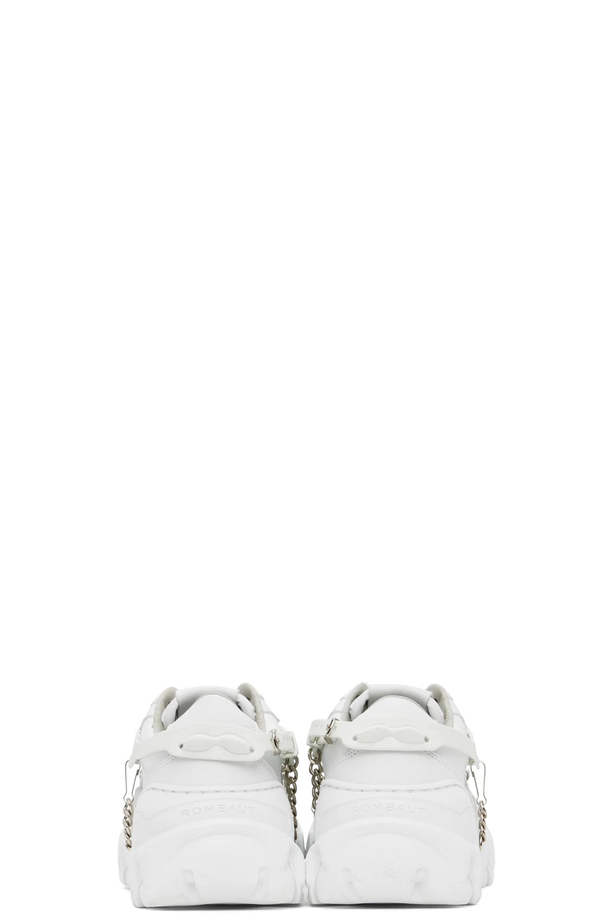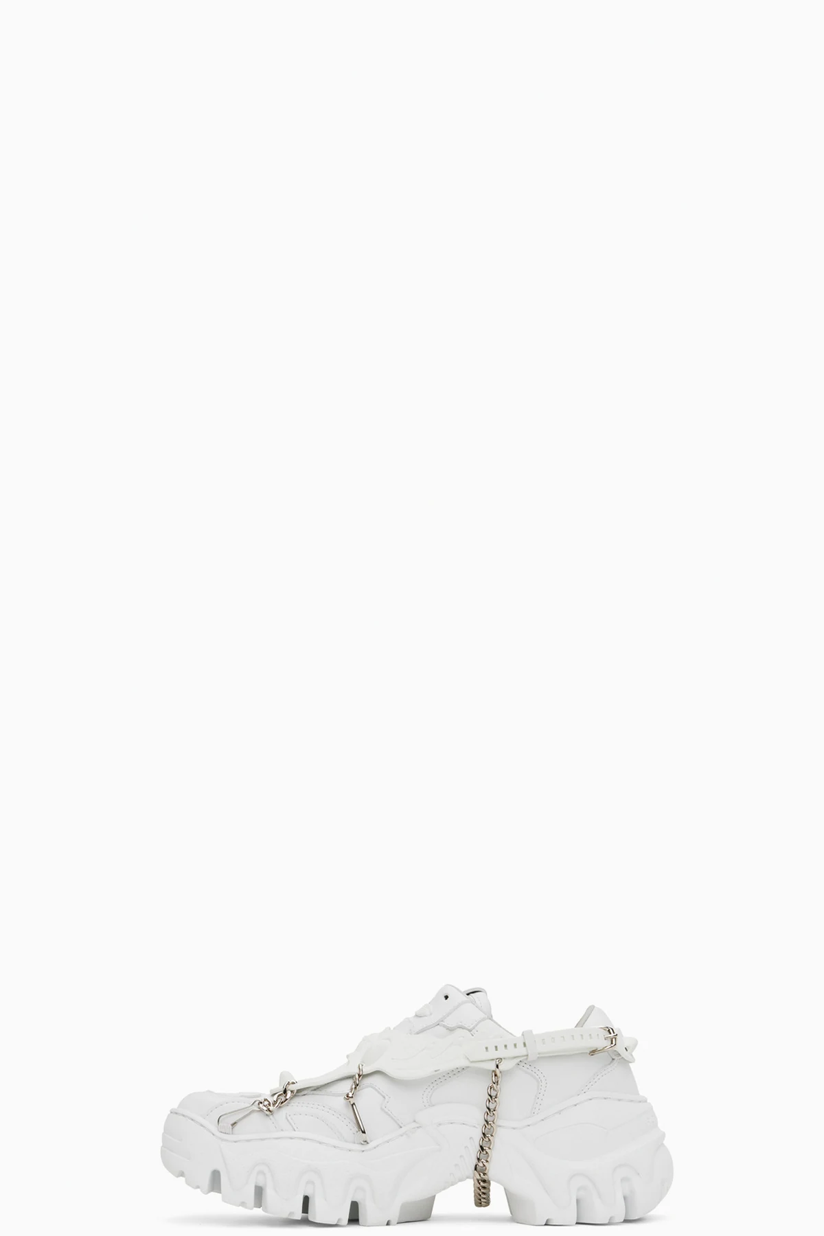 Handcrafted low-top buffed faux-leather sneakers in white. Detachable rubber and curb chain harness-style overlay.