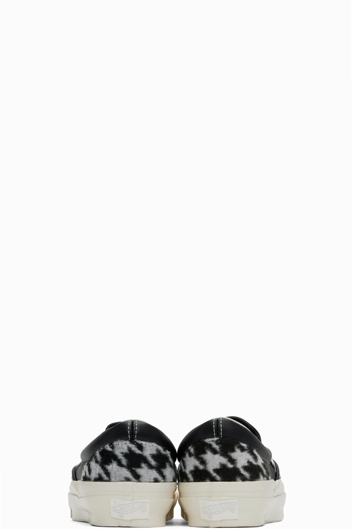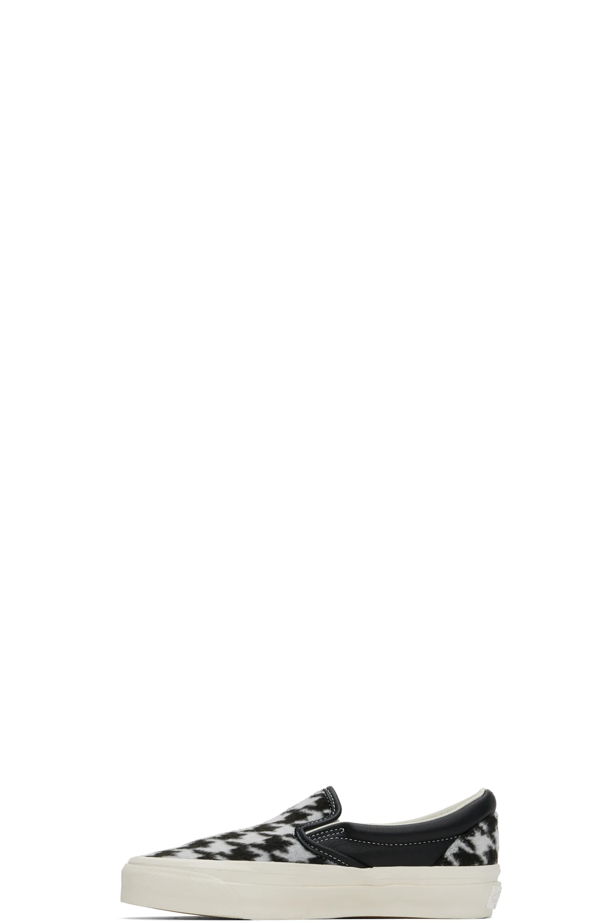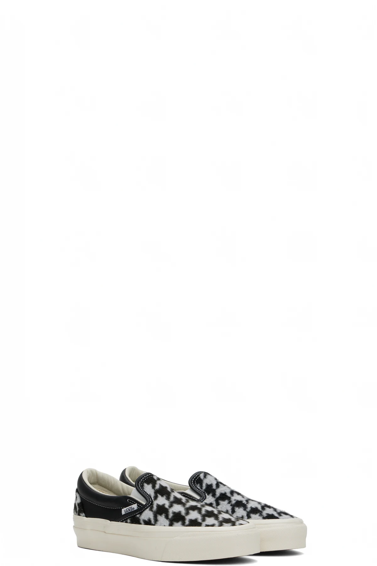 Low-top flocked 8 oz canvas slip-on sneakers in off-white and black.