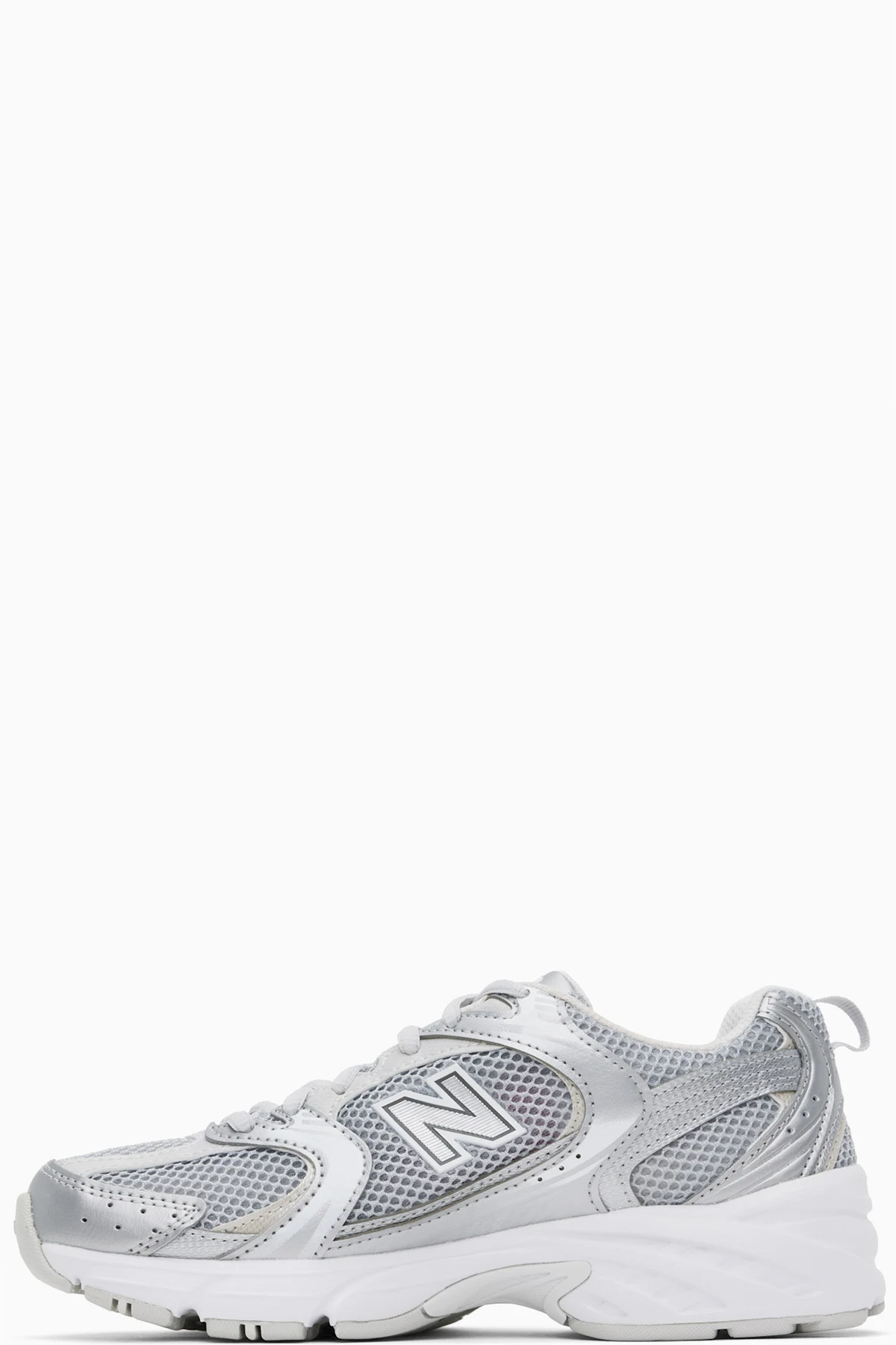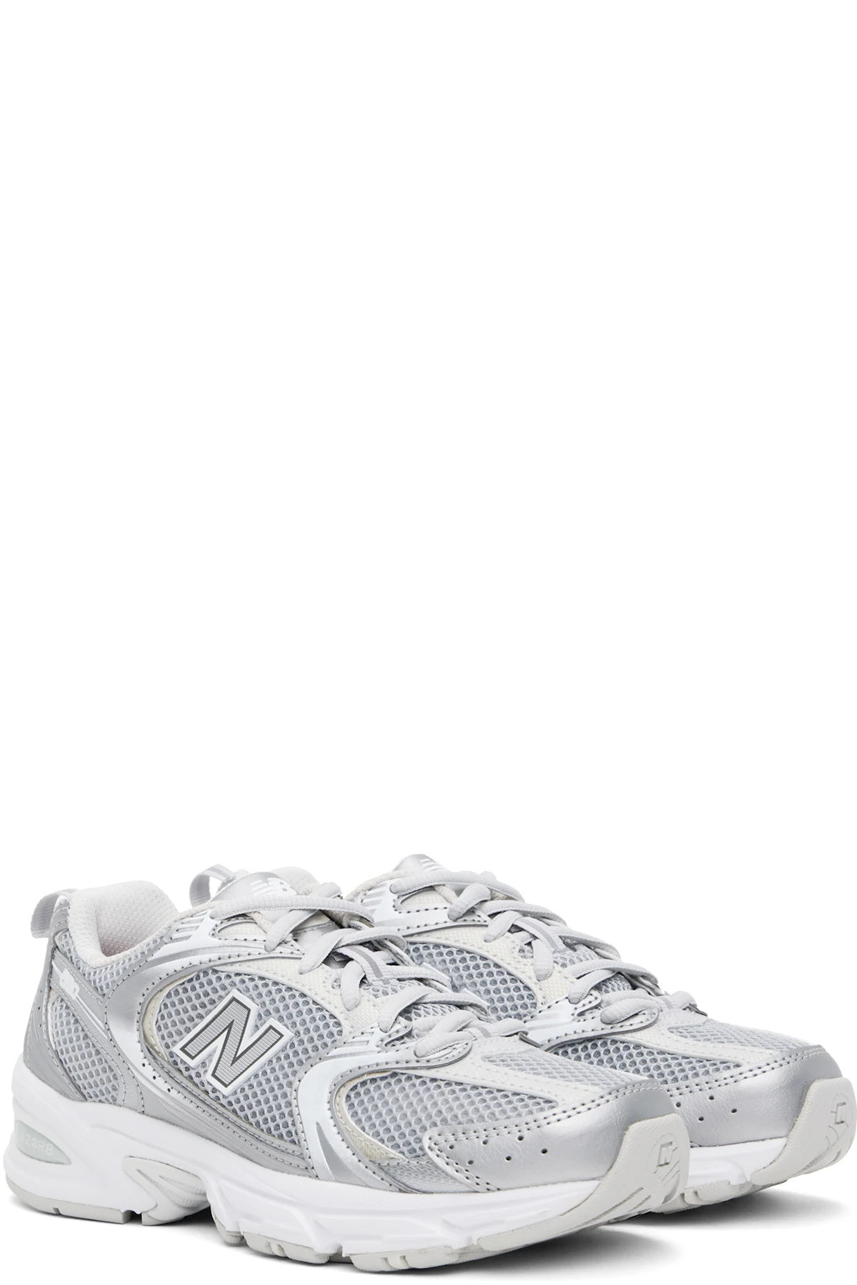 Low-top semi-transparent mesh sneakers in silver tone. Faux-leather trim and perforated detailing throughout.