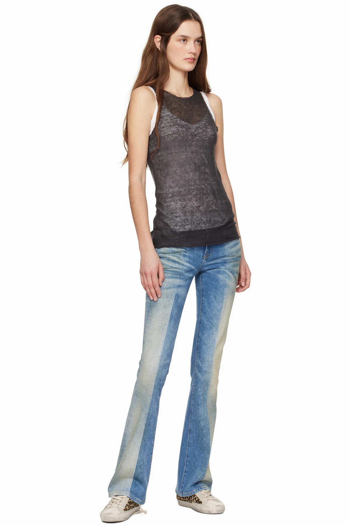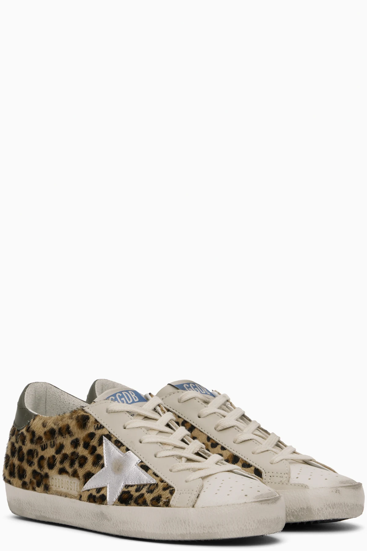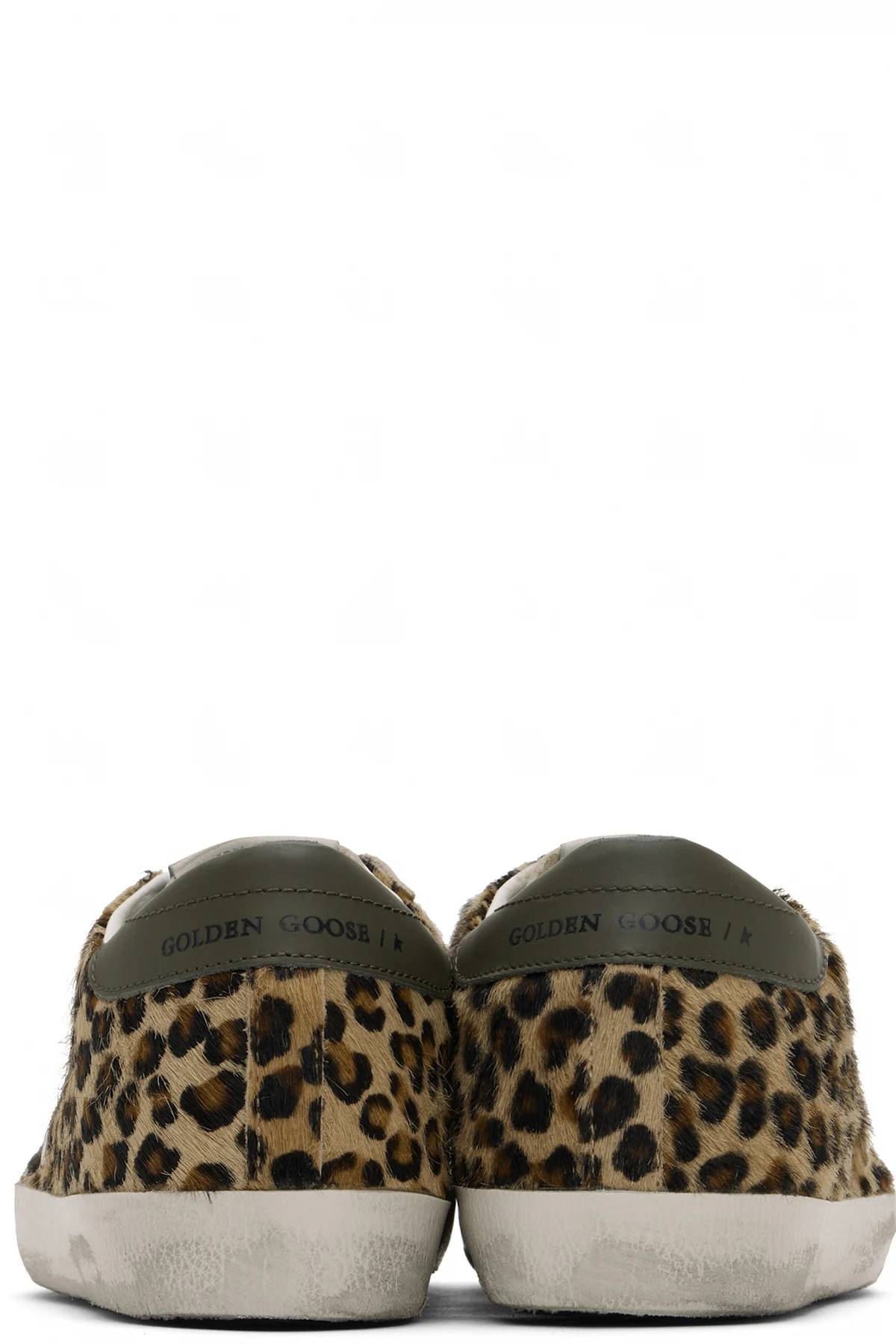 Handcrafted low-top paneled hair-on leather and buffed leather sneakers in tan. Smudging, perforated detailing, and leopard pattern printed throughout.