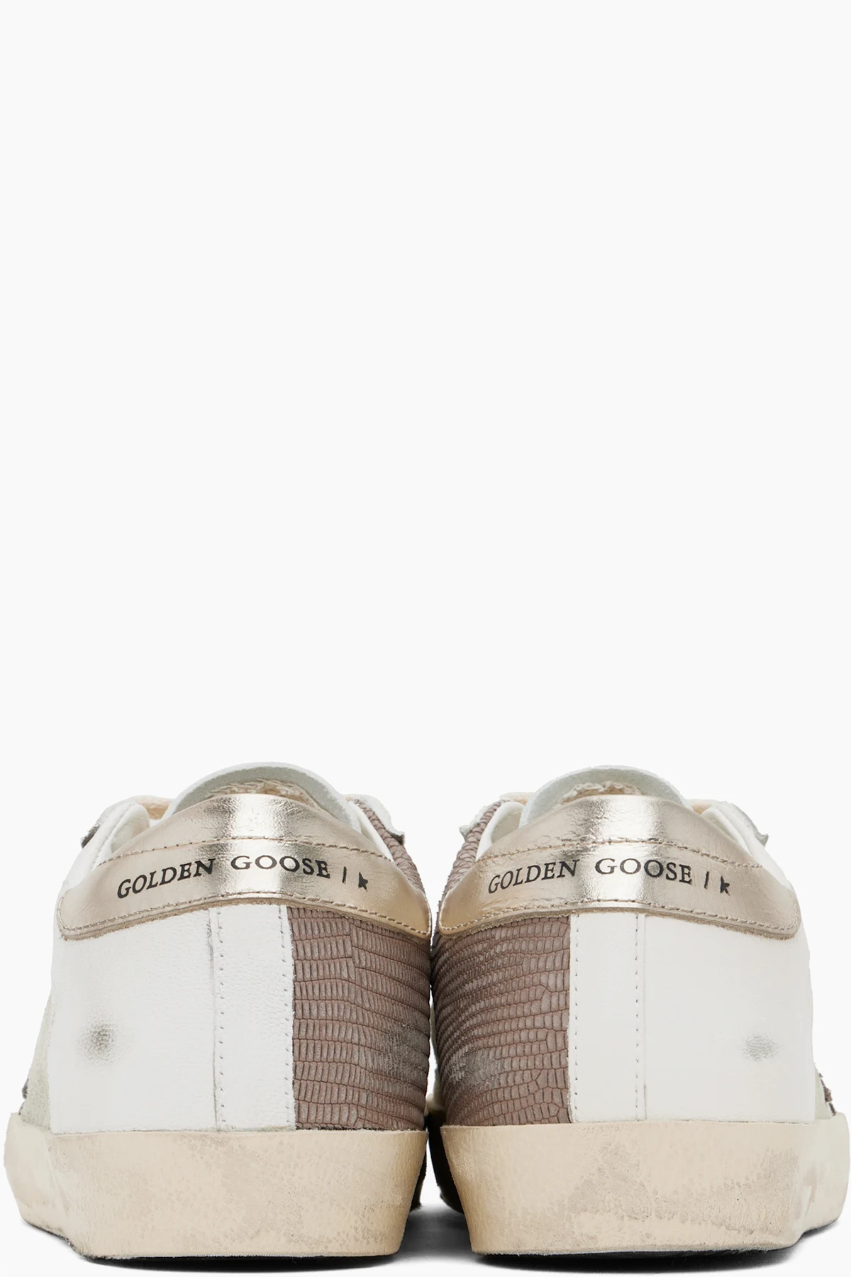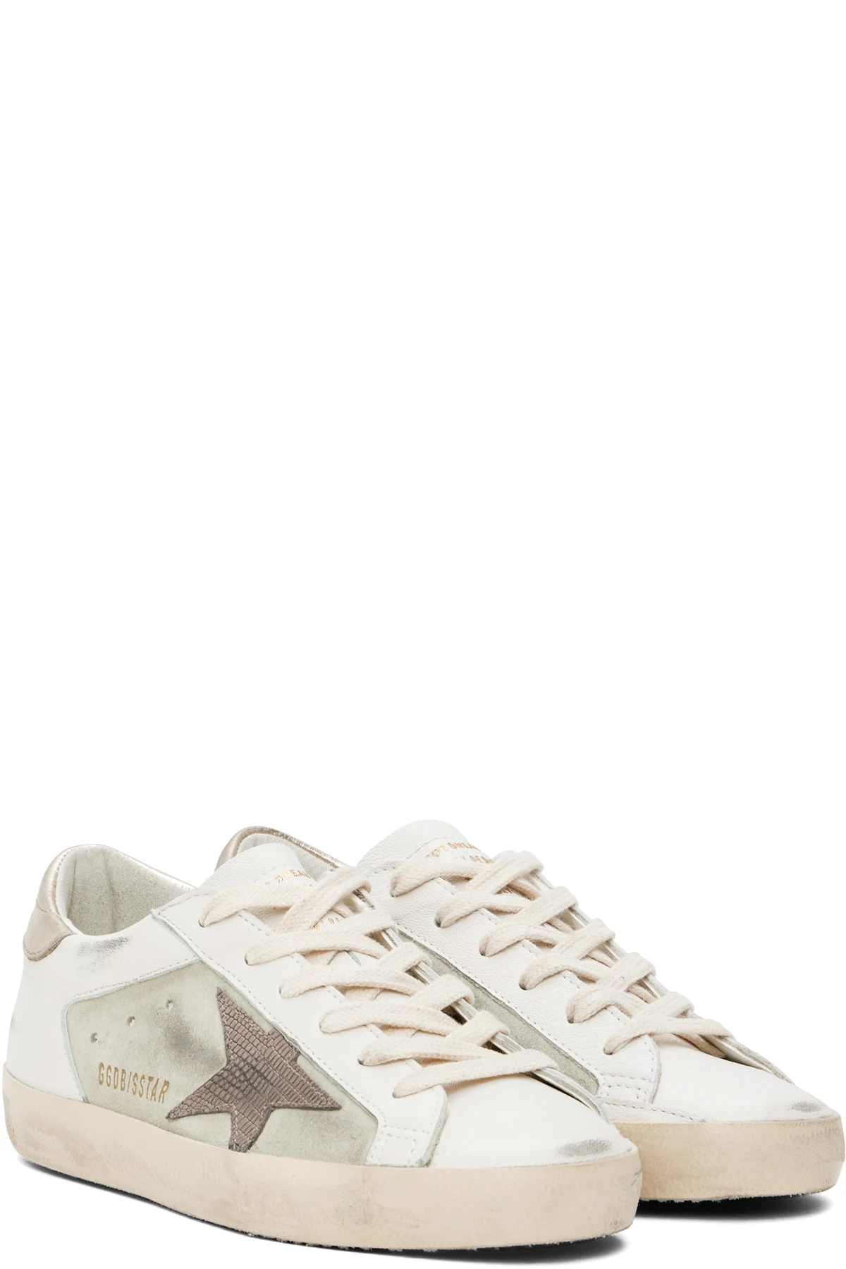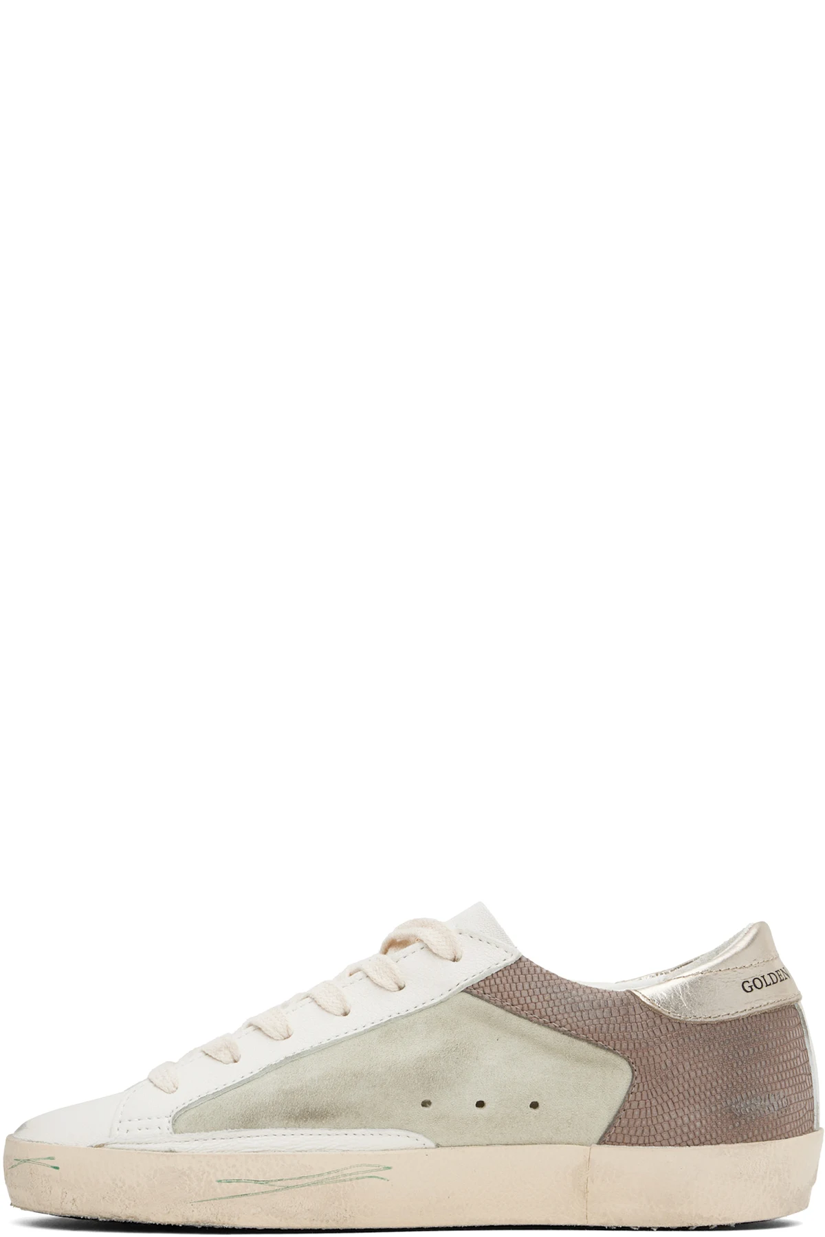 Handcrafted low-top buffed leather, suede, and snake-embossed leather sneakers in white and beige.