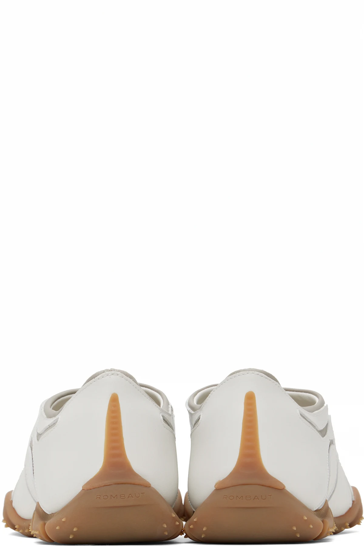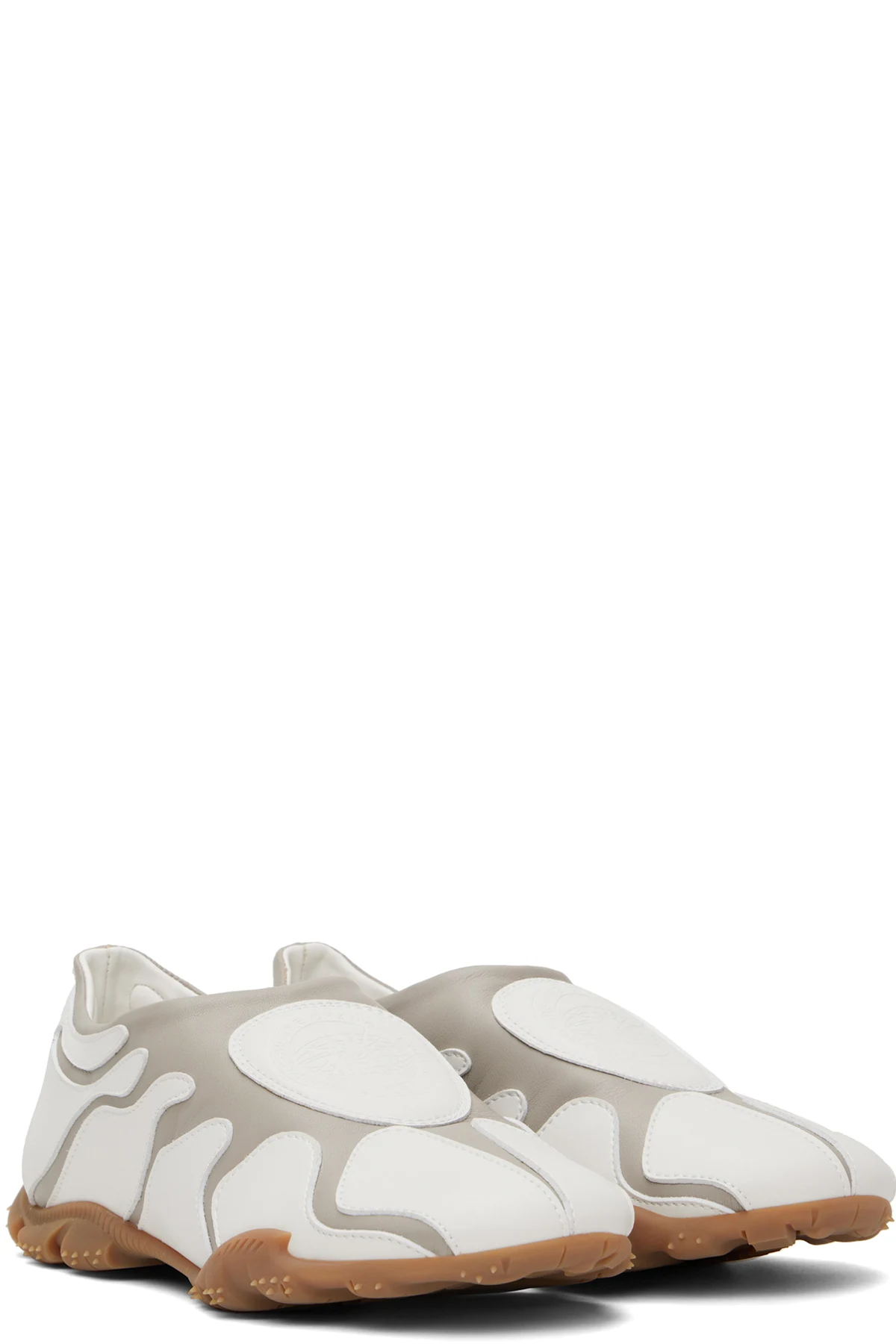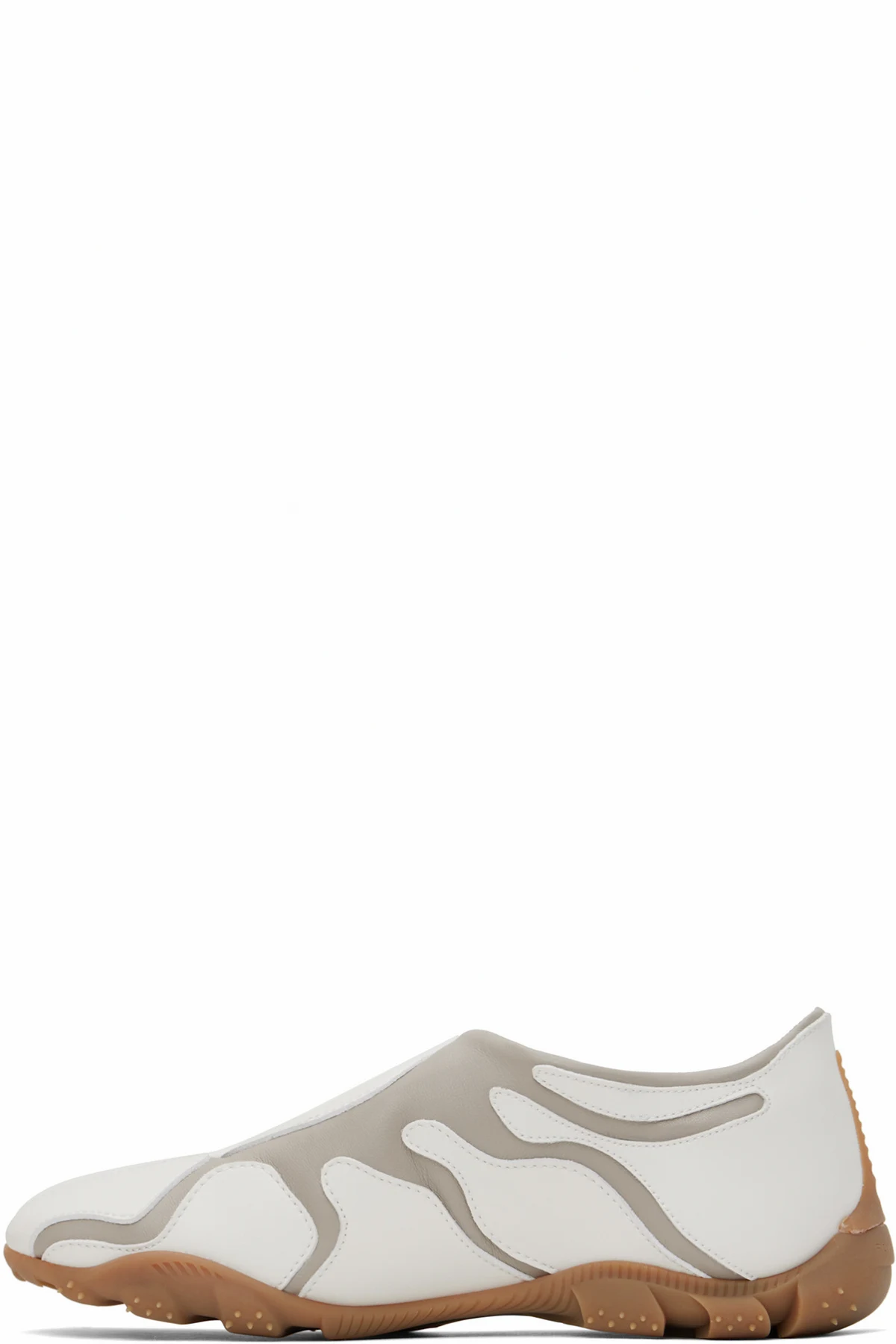 Low-top buffed faux-leather slip-on sneakers in white and gray.