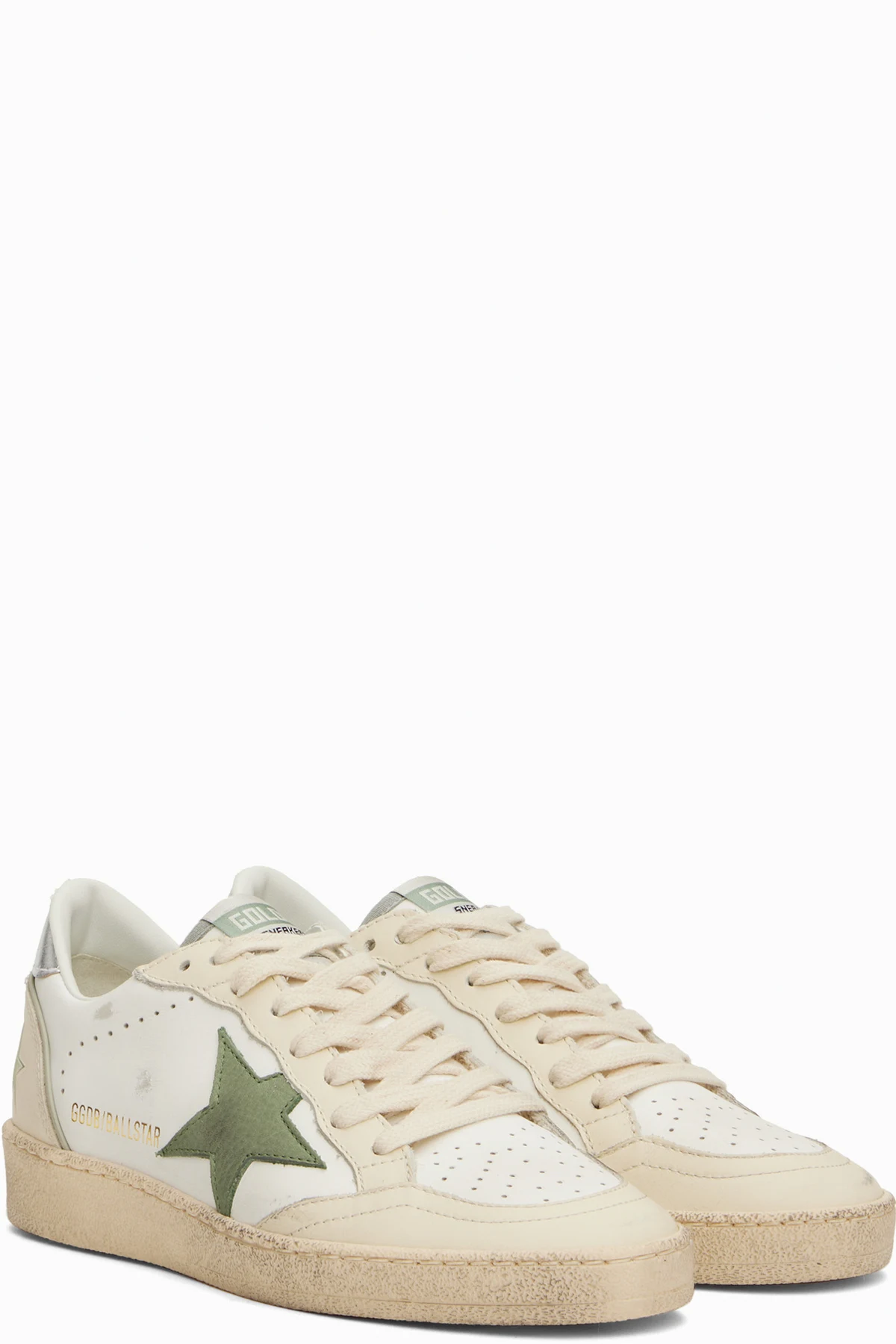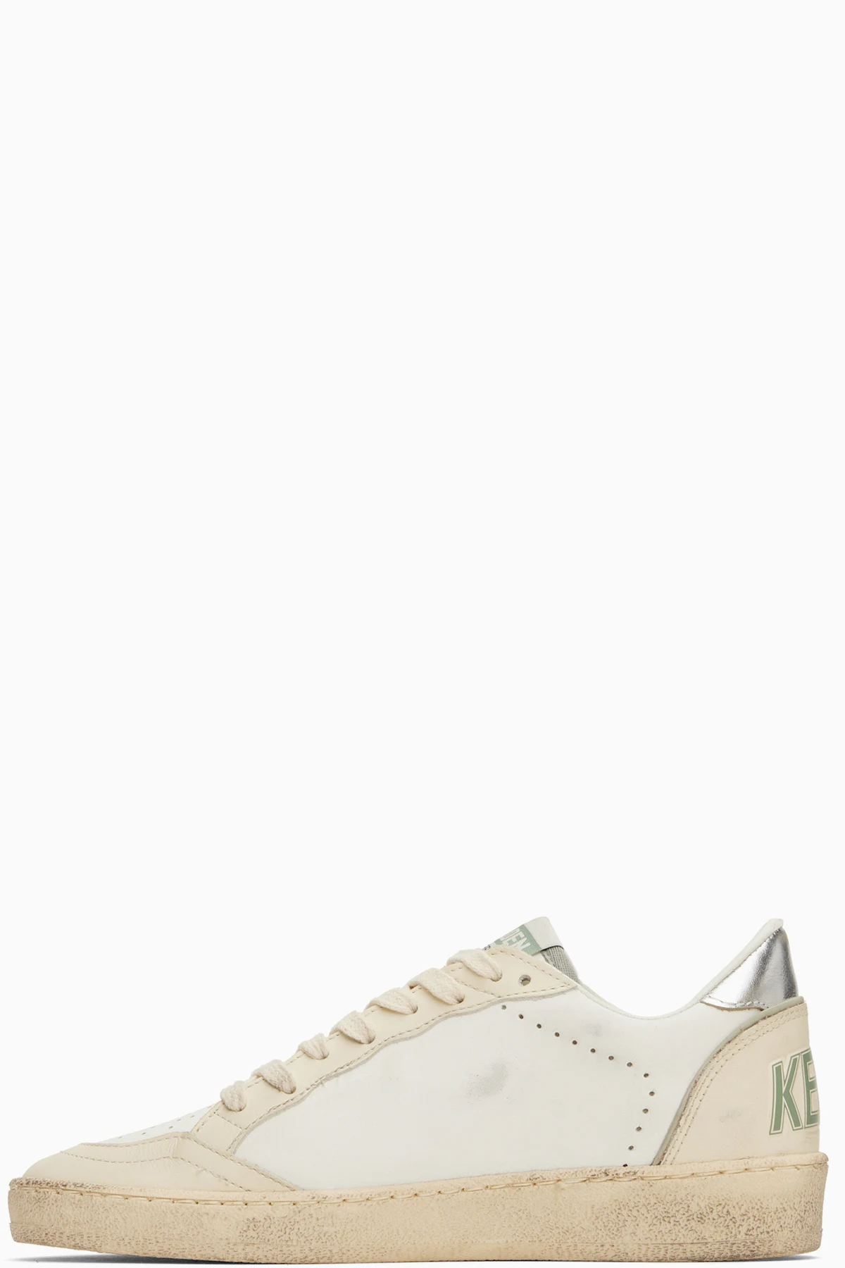 Handcrafted low-top buffed leather sneakers in off-white and khaki.
