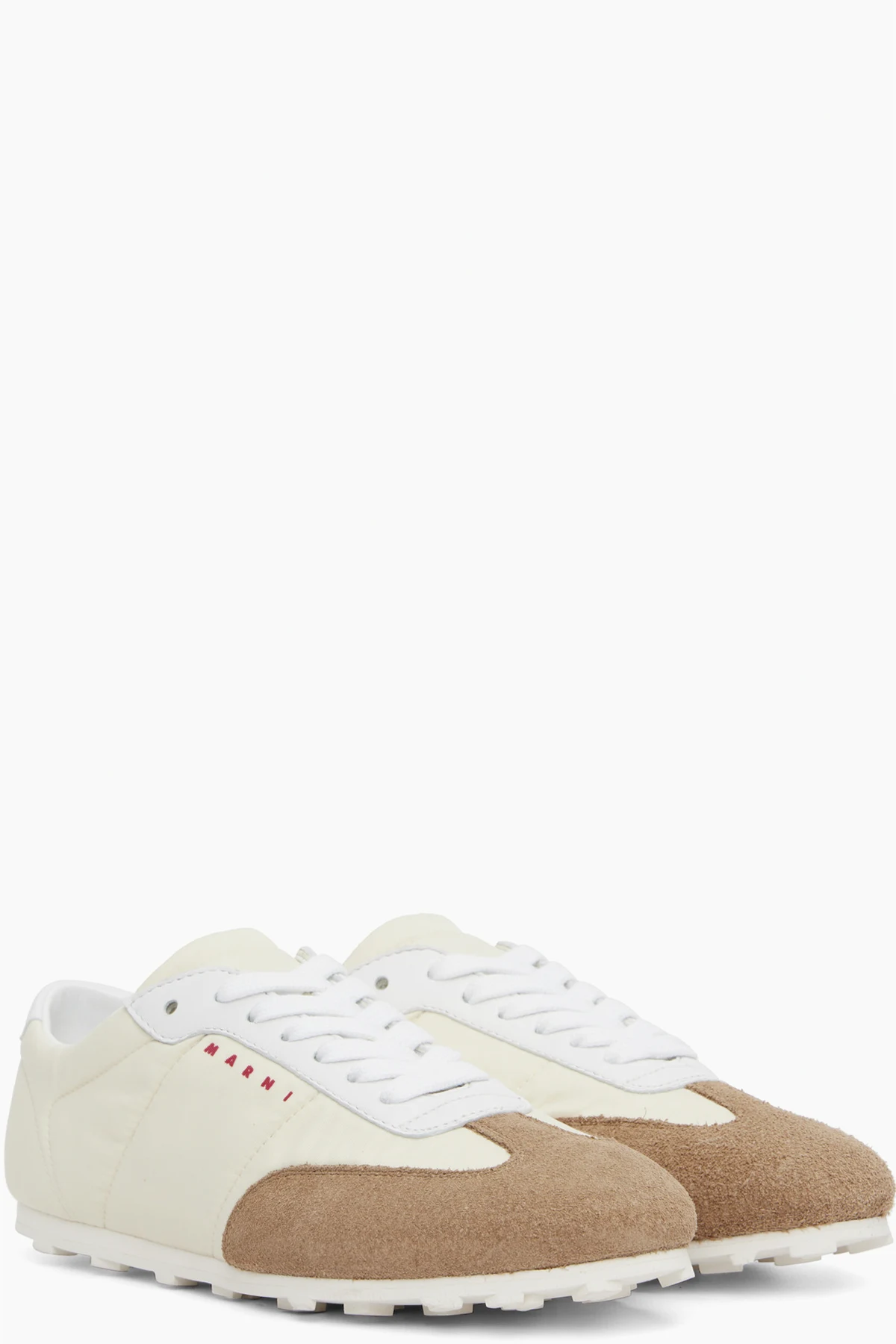 Low-top nylon canvas, calfskin suede, and grained sheepskin sneakers.