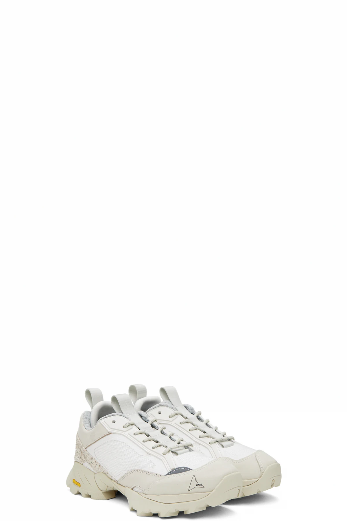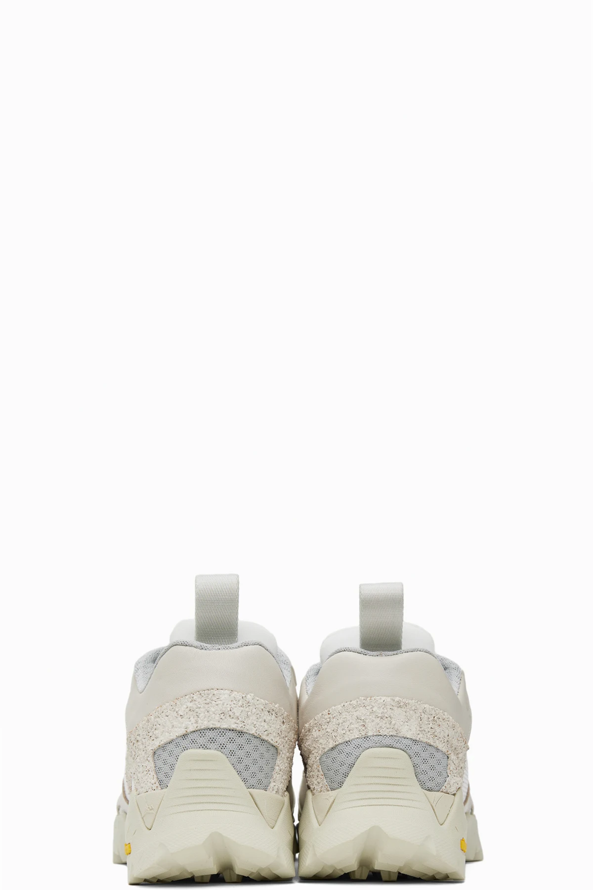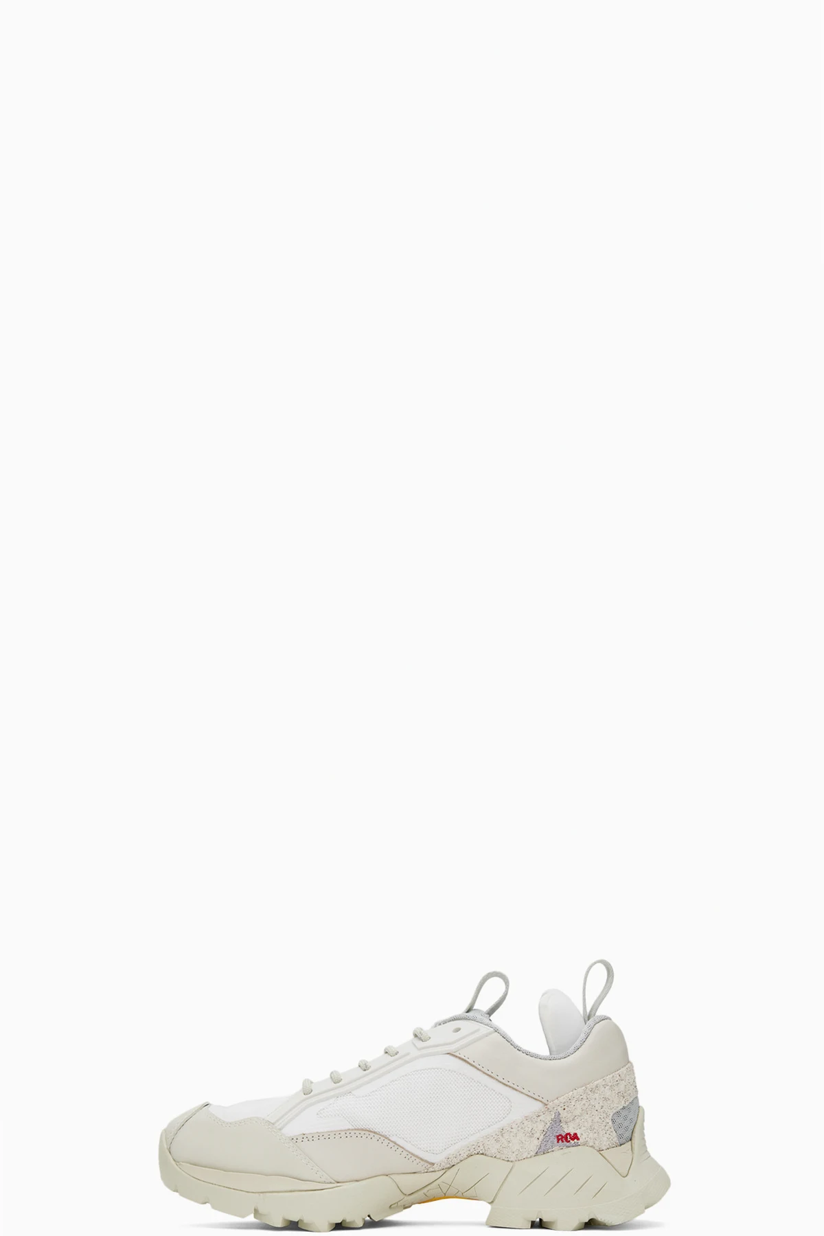 Low-top paneled nylon mesh and buffed calfskin sneakers in off-white.