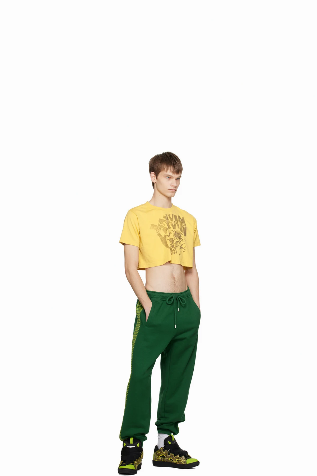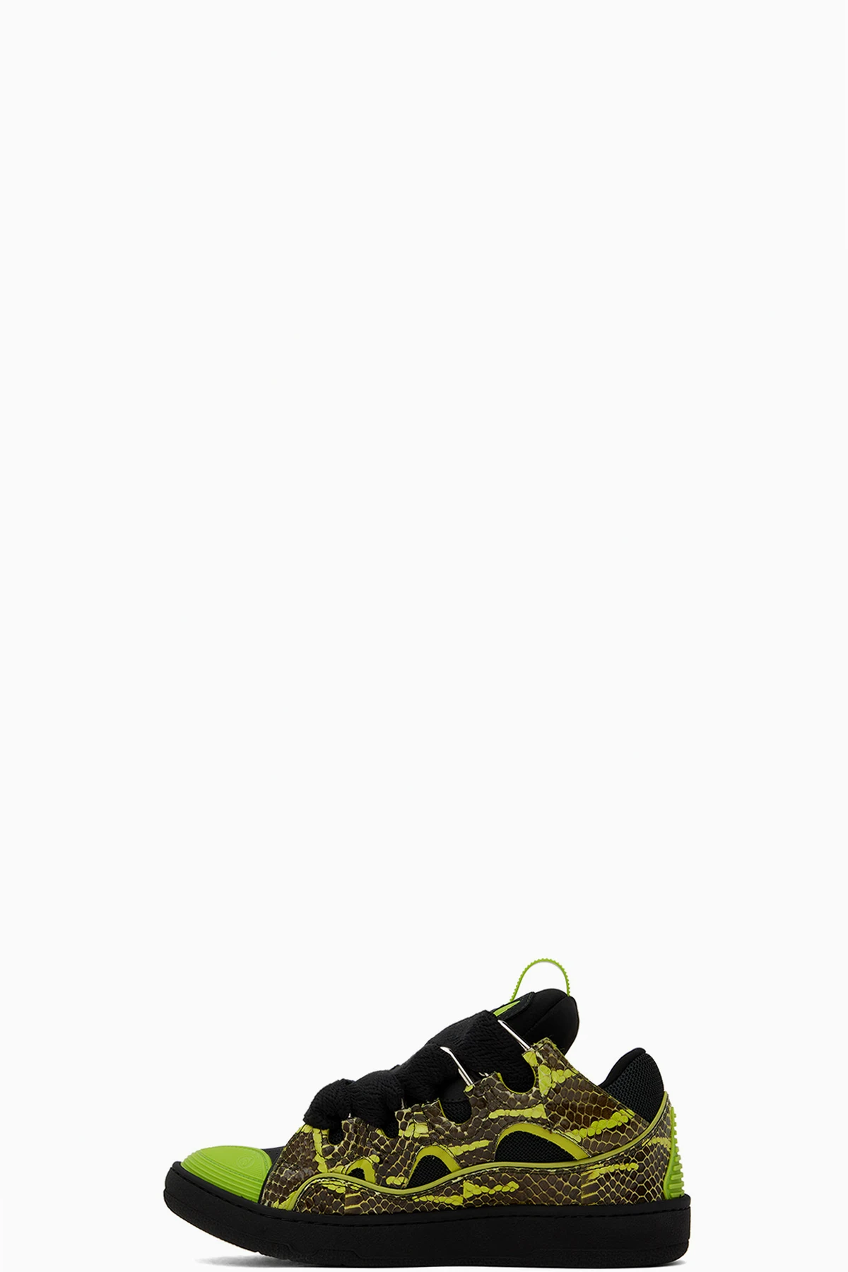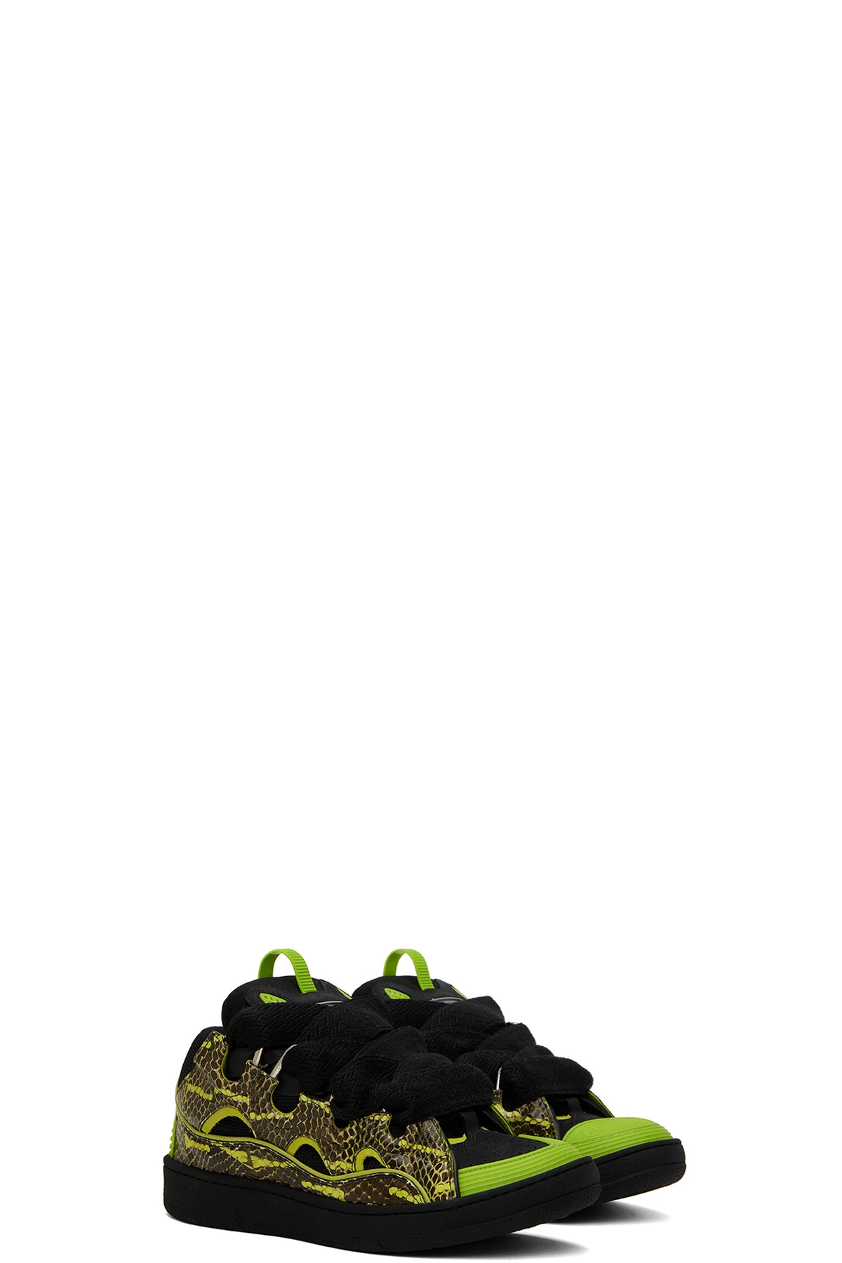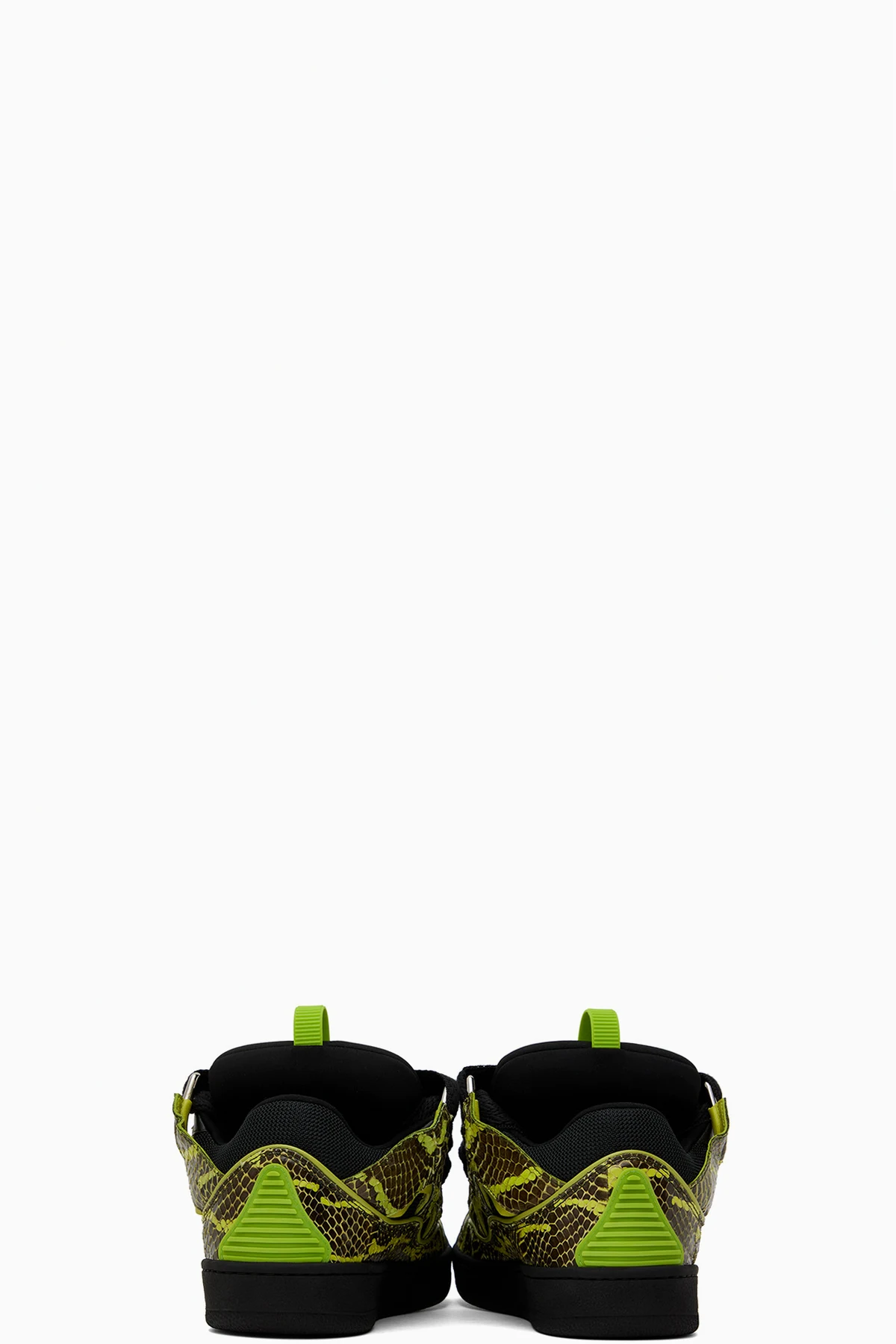Low-top mangrove snakeskin, suede, and mesh sneakers in green and black.