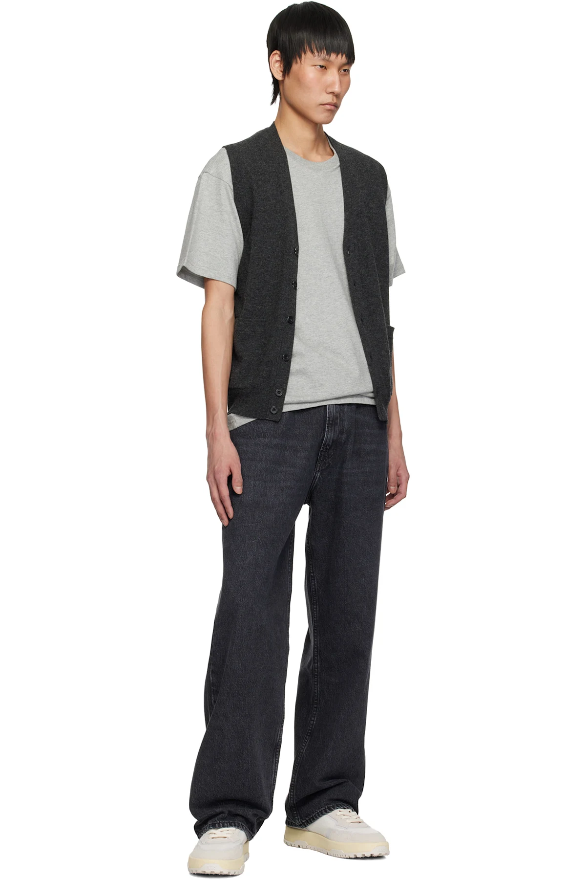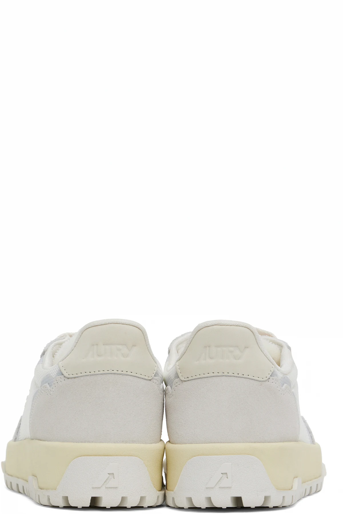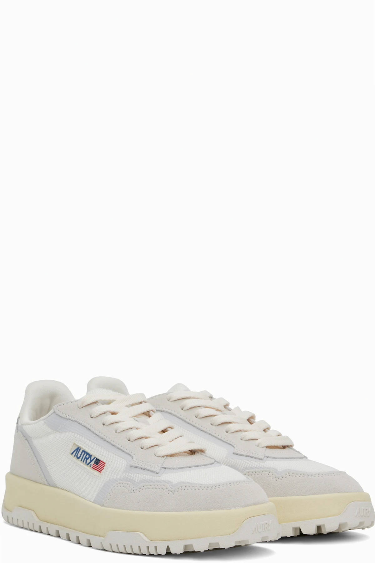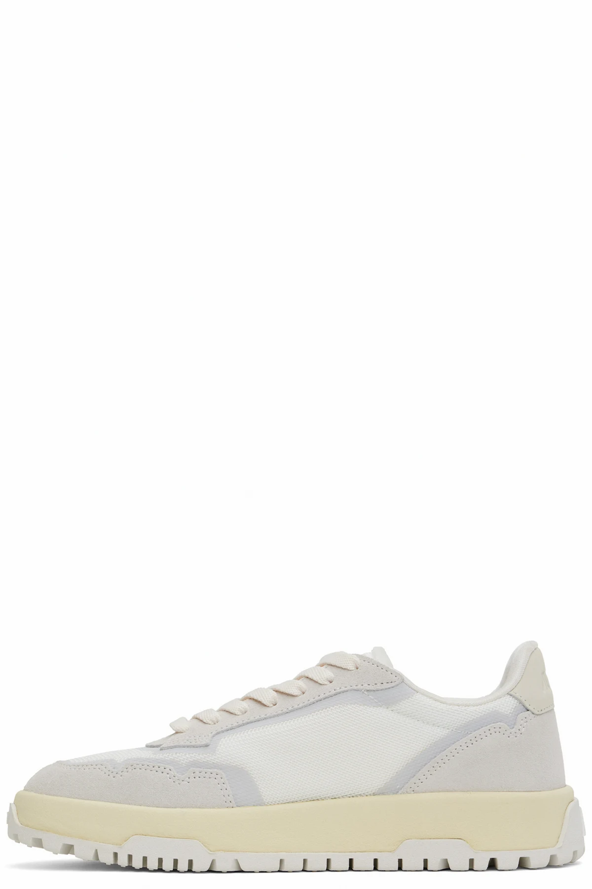 Low-top mesh and suede sneakers in white and gray.