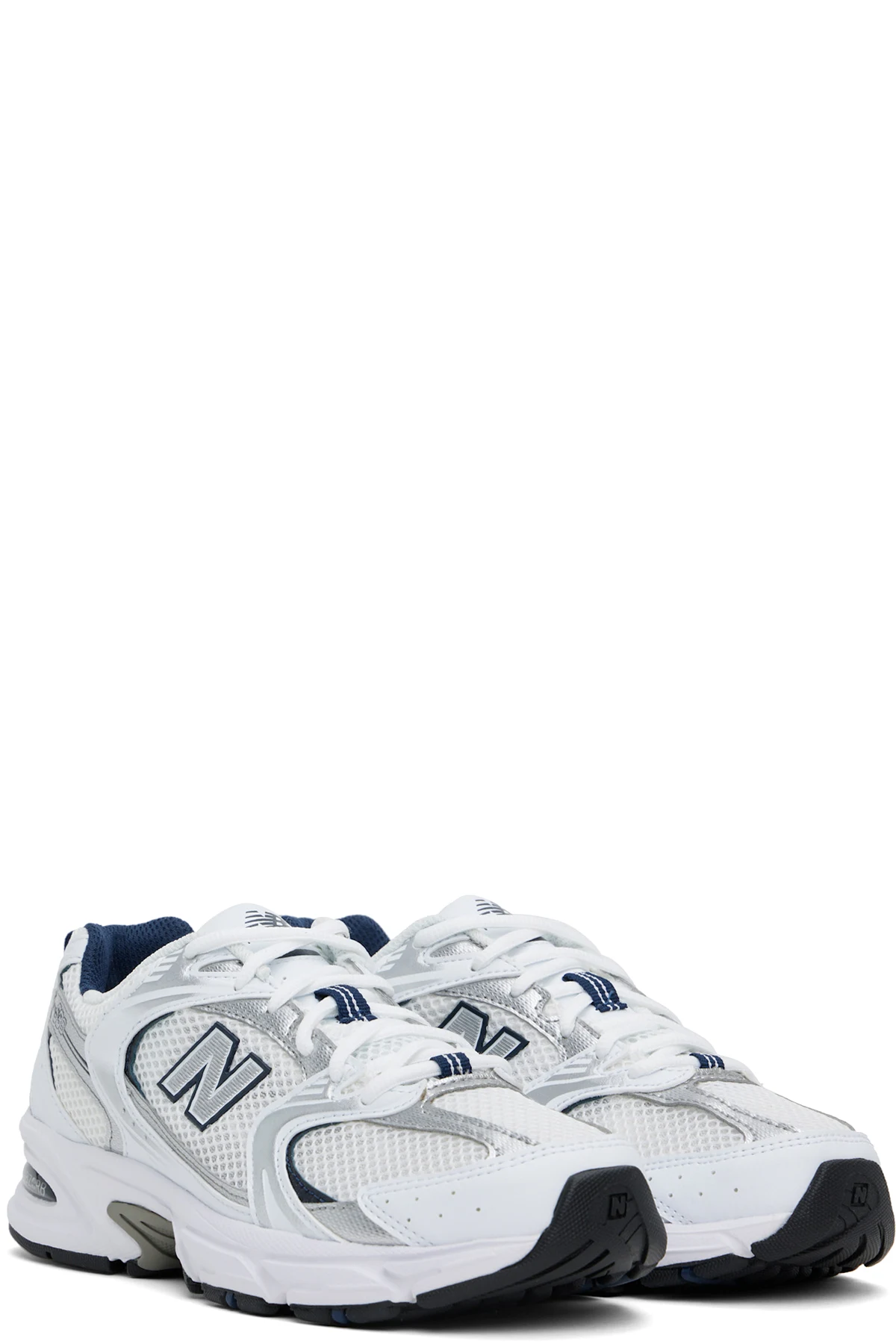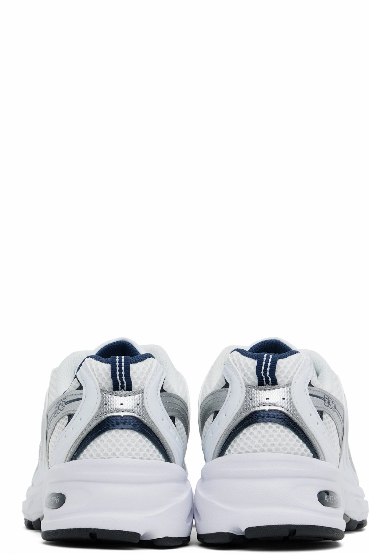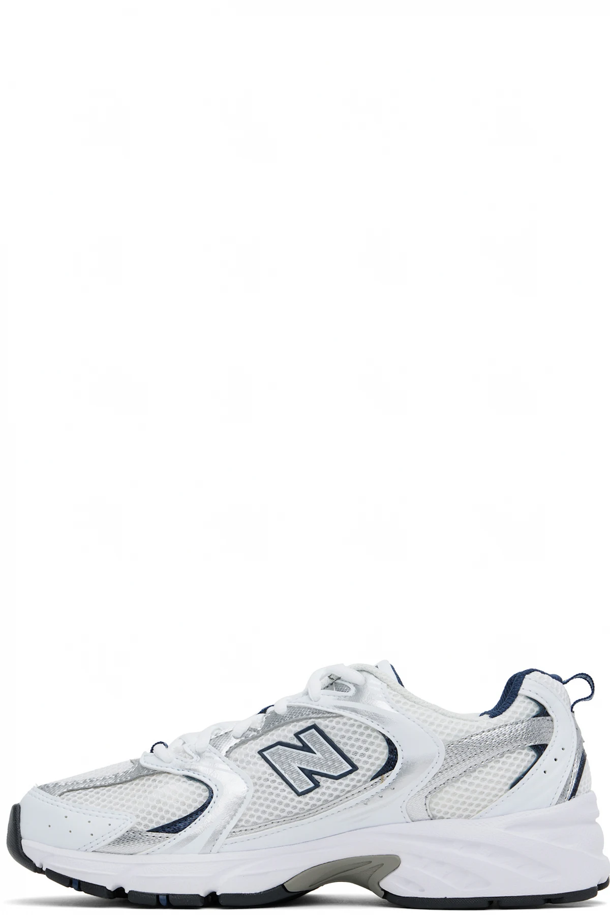 Low-top mesh and grained faux-leather sneakers in white and silver tone.
