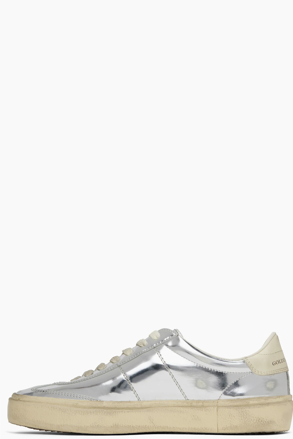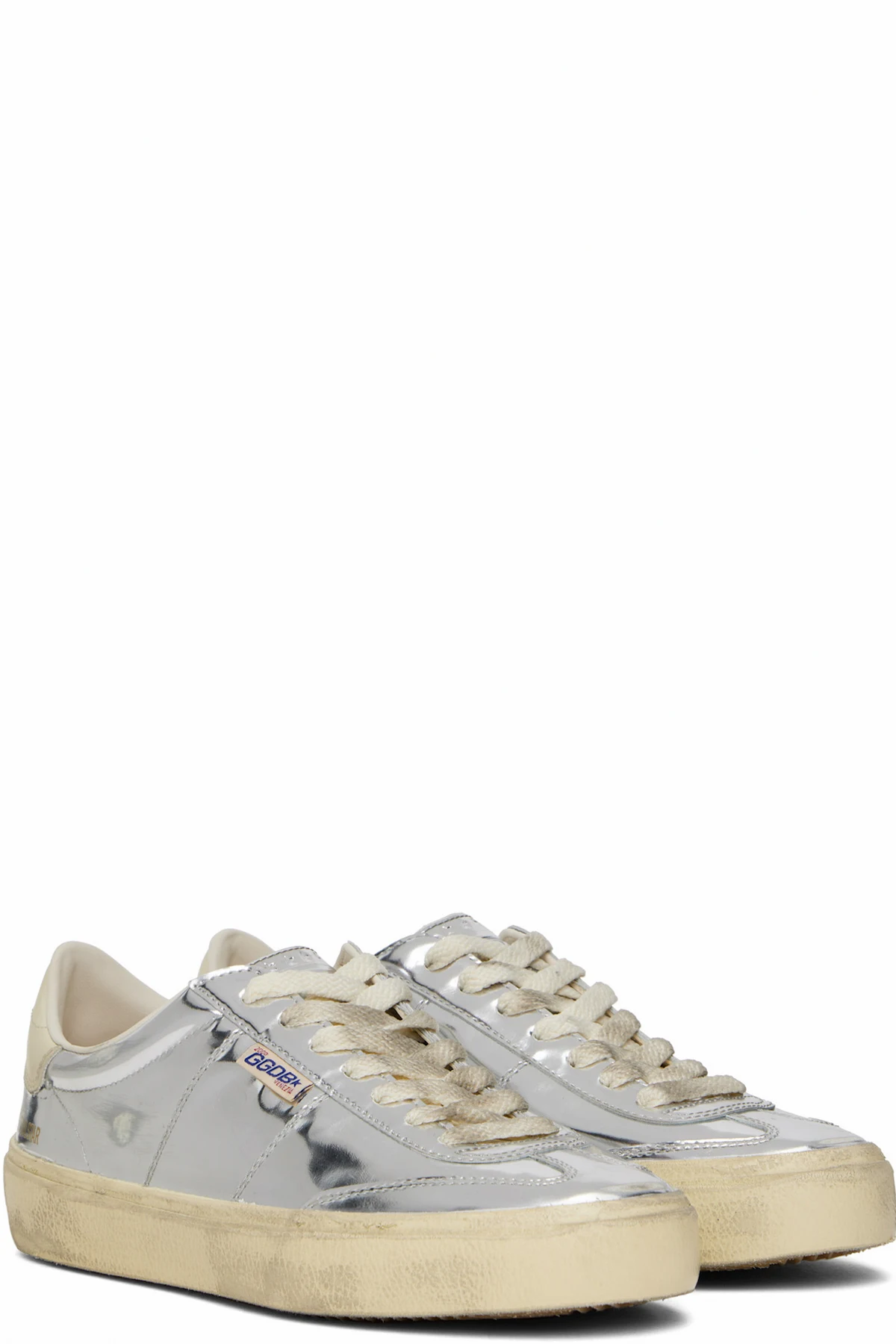 Handcrafted low-top patent leather sneakers in metallic silver tone.