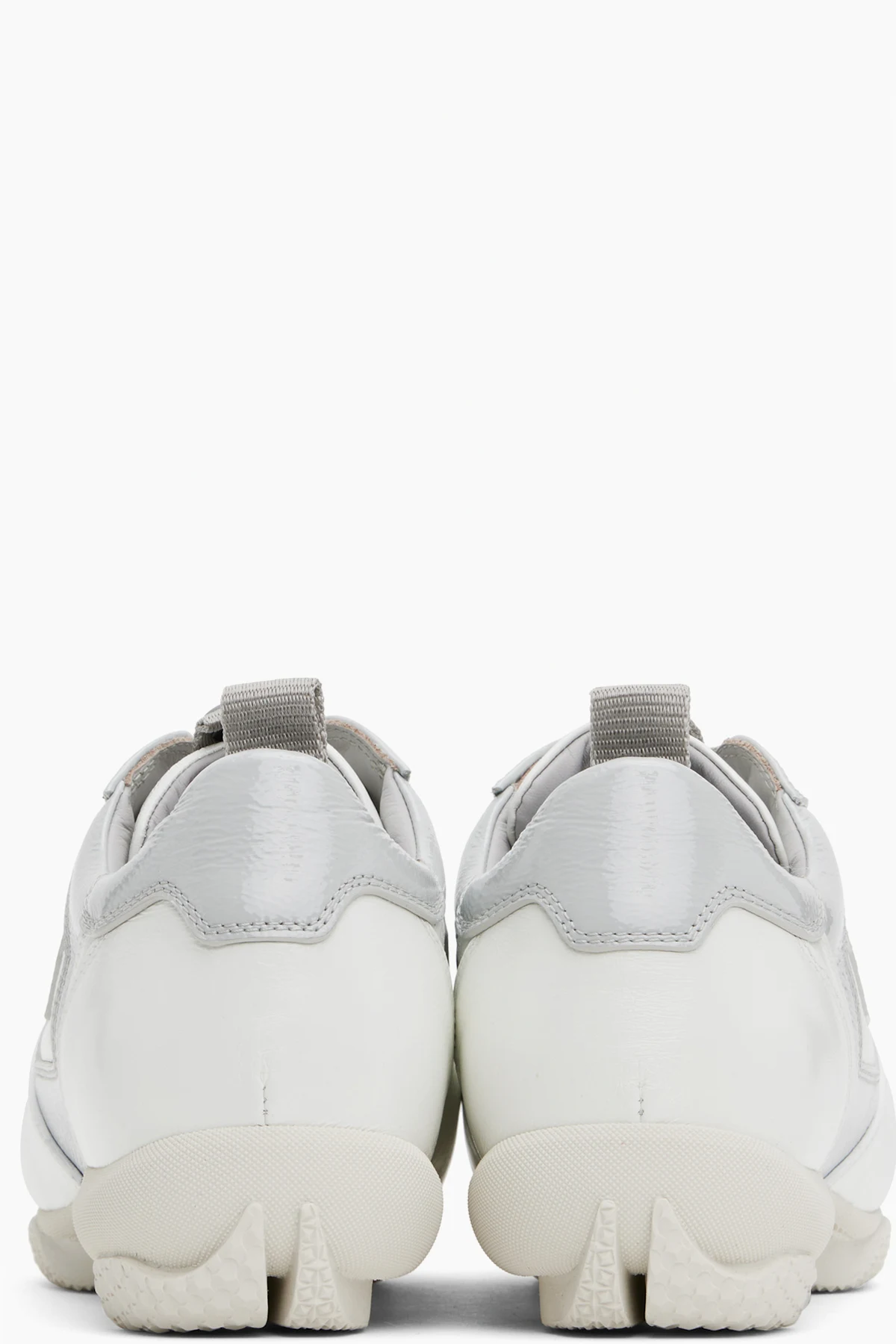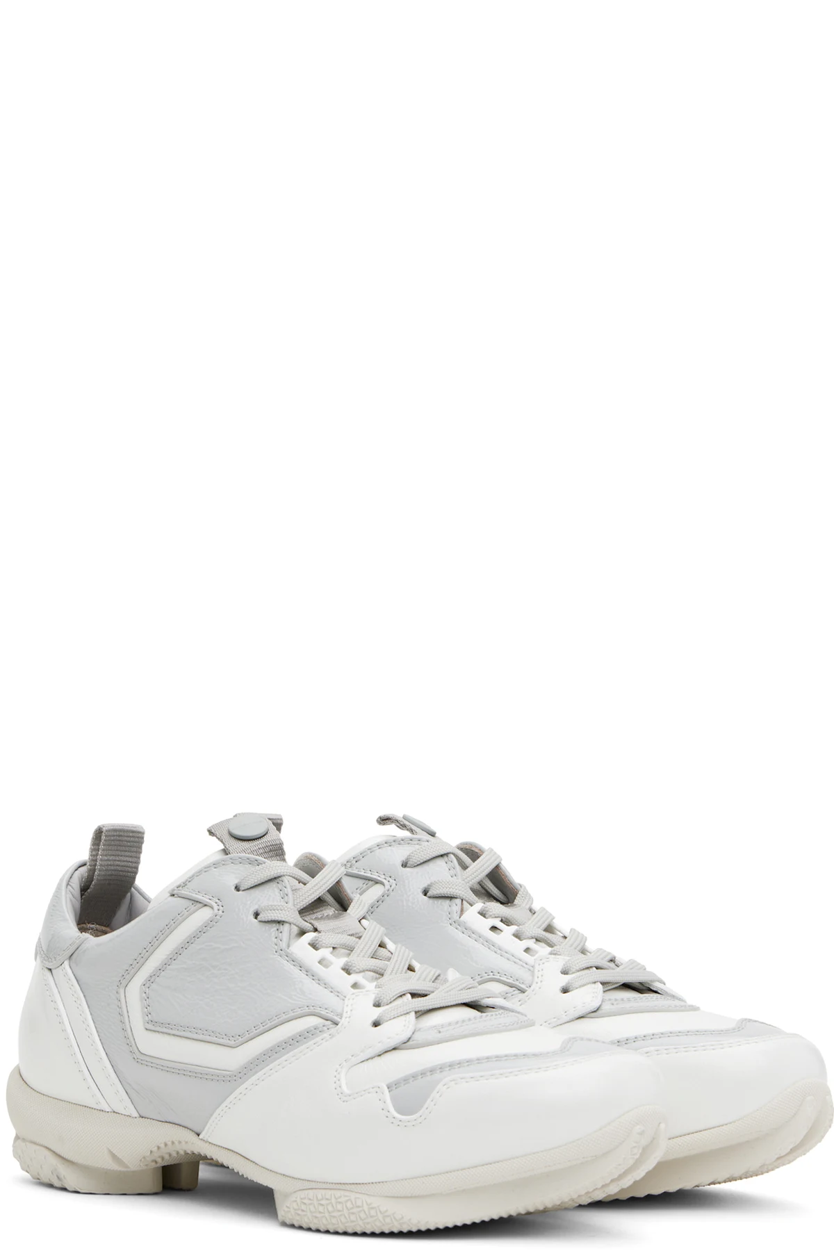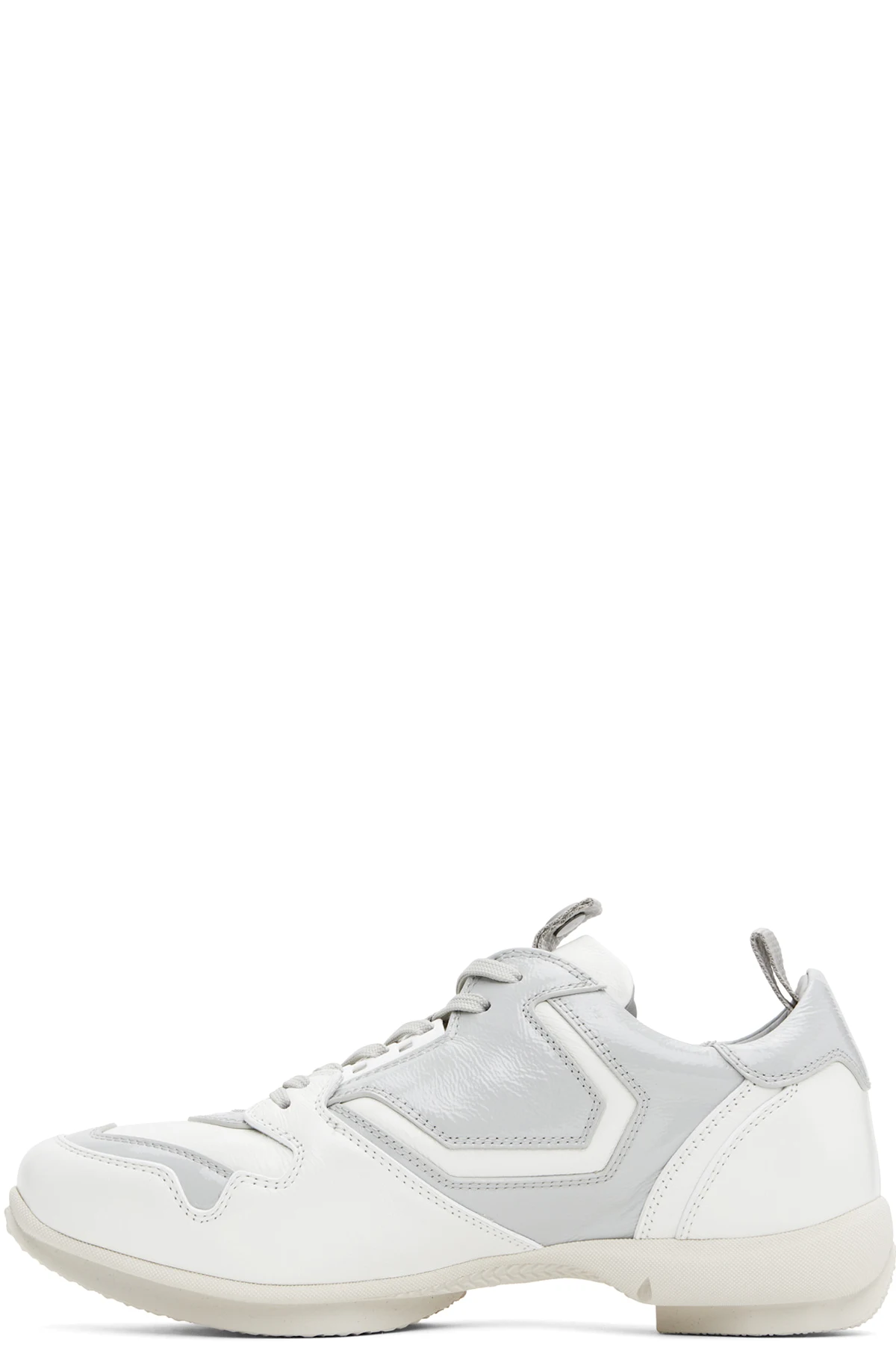 Low-top polished leather and patent calfskin sneakers in white and gray.