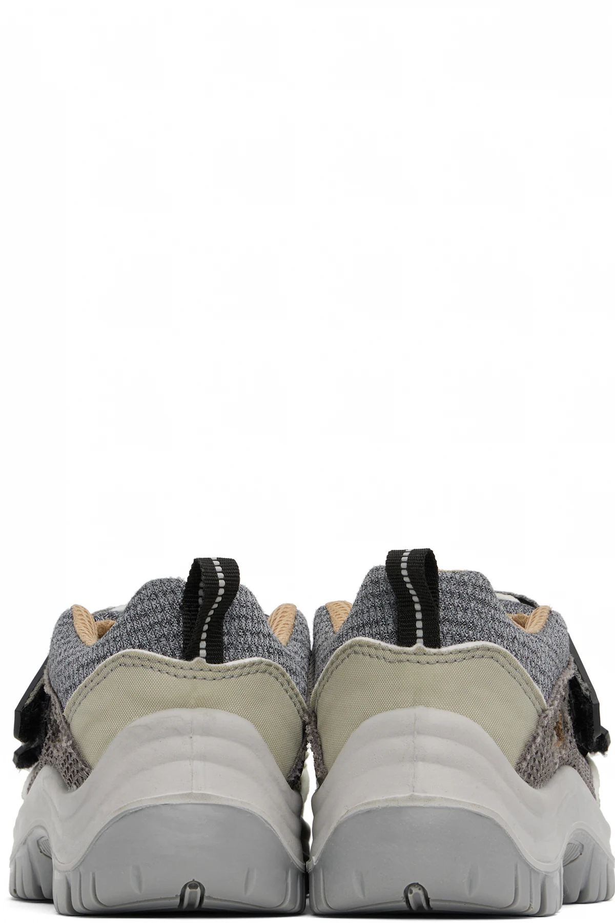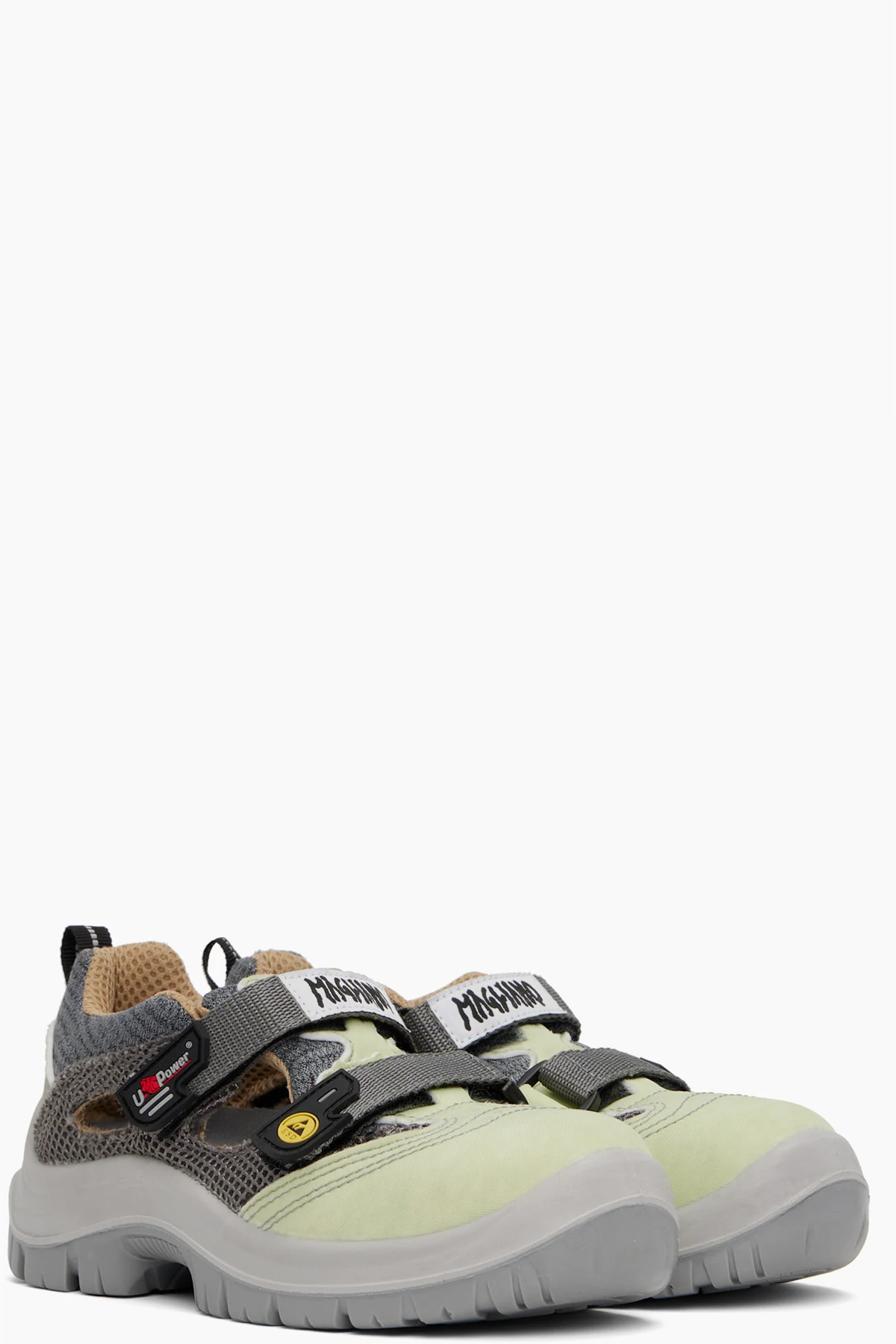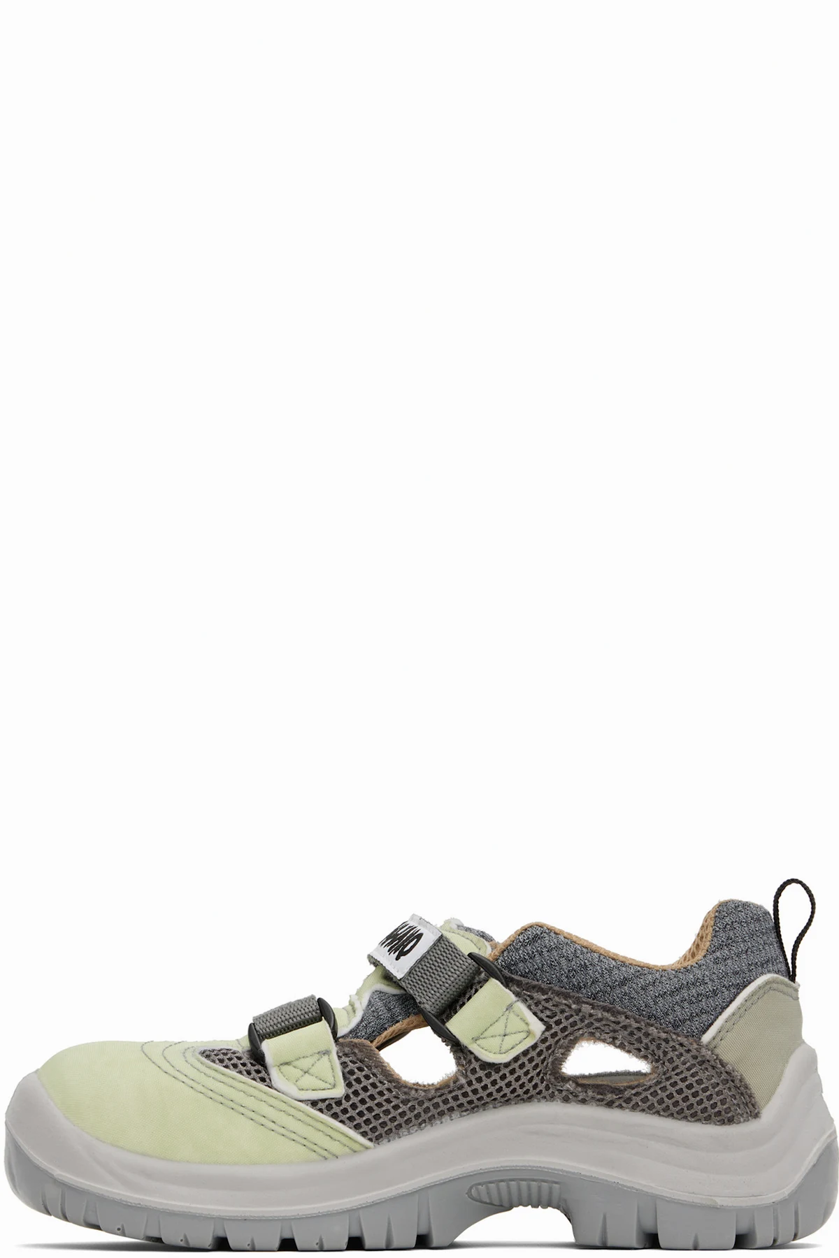 Low-top canvas and mesh Mary Jane-style sneakers in green and gray.