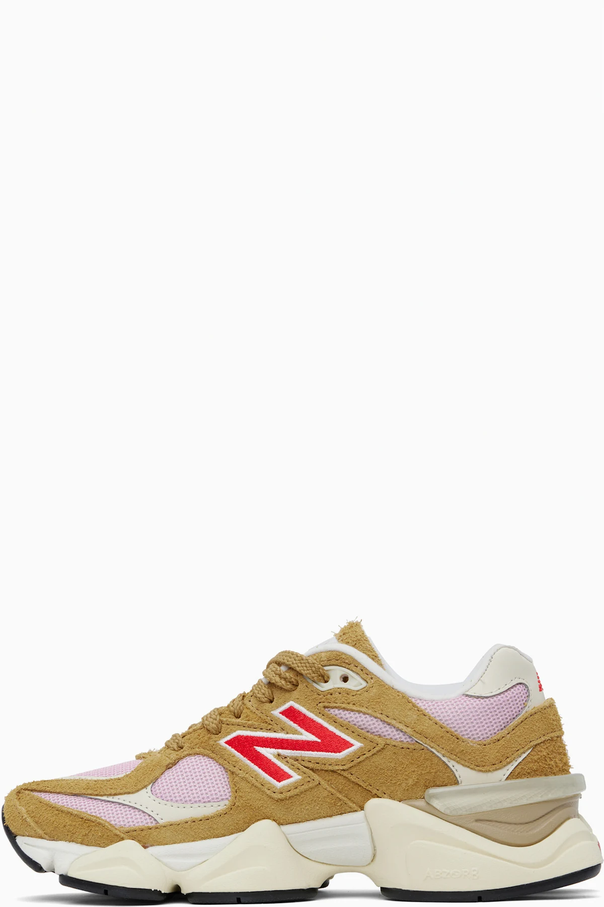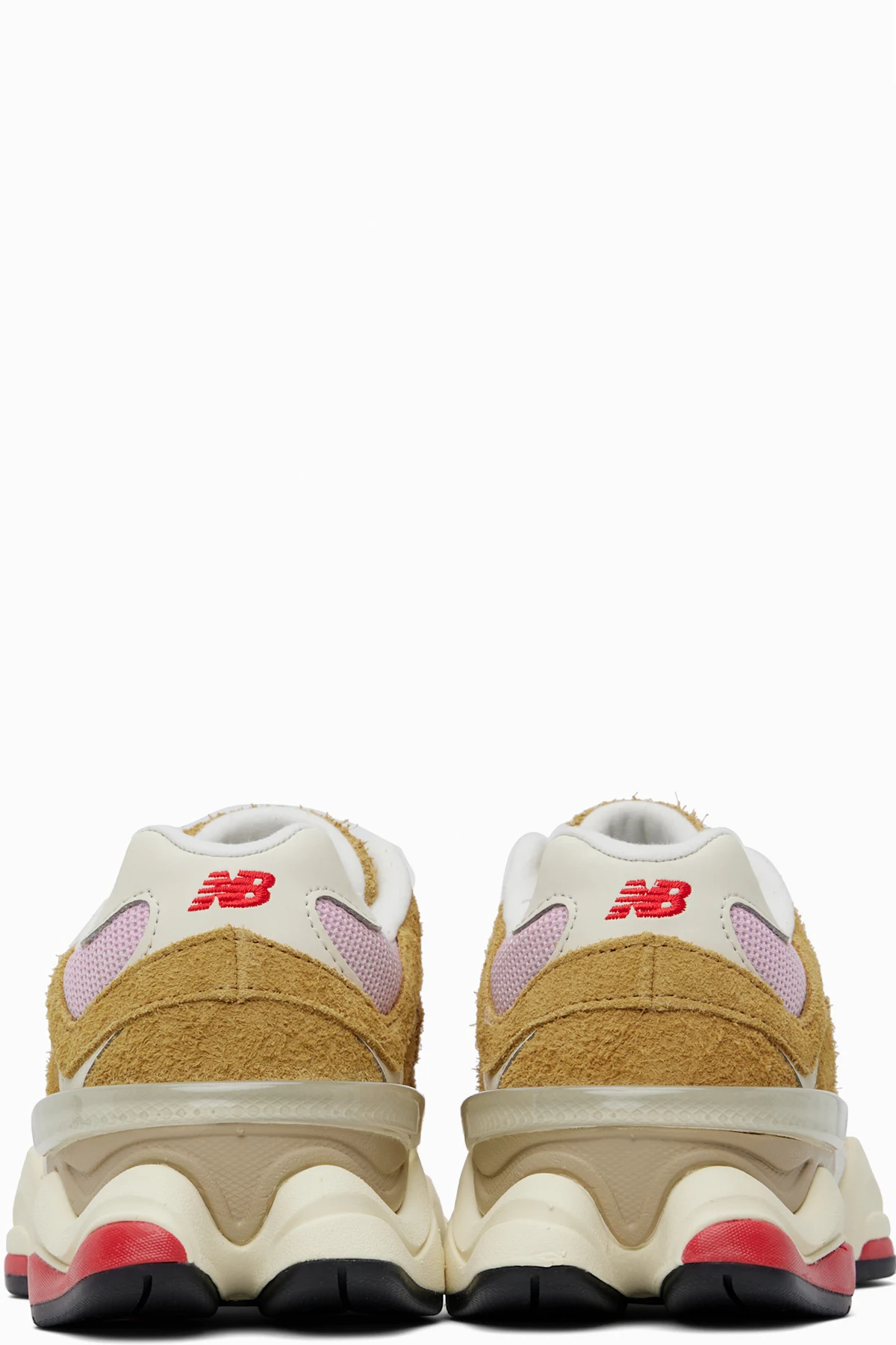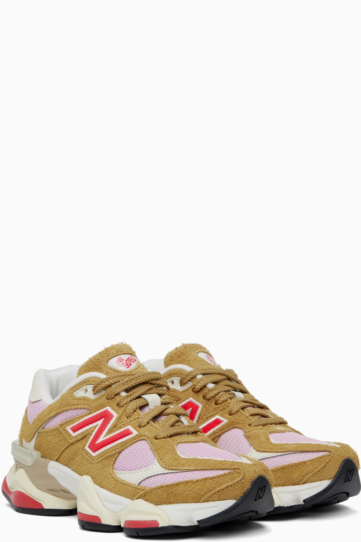 Low-top mesh and pigskin suede sneakers in tan and pink.