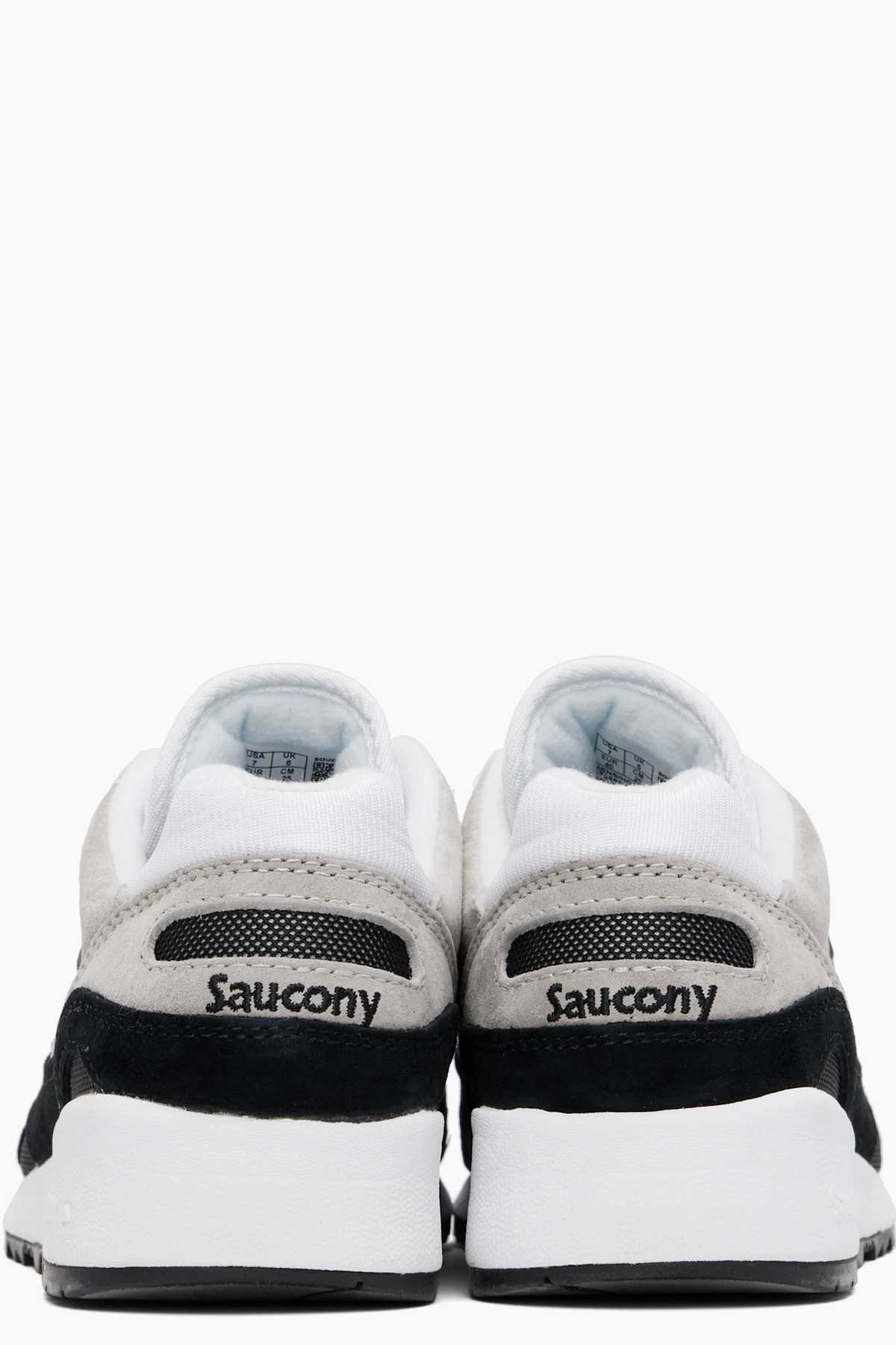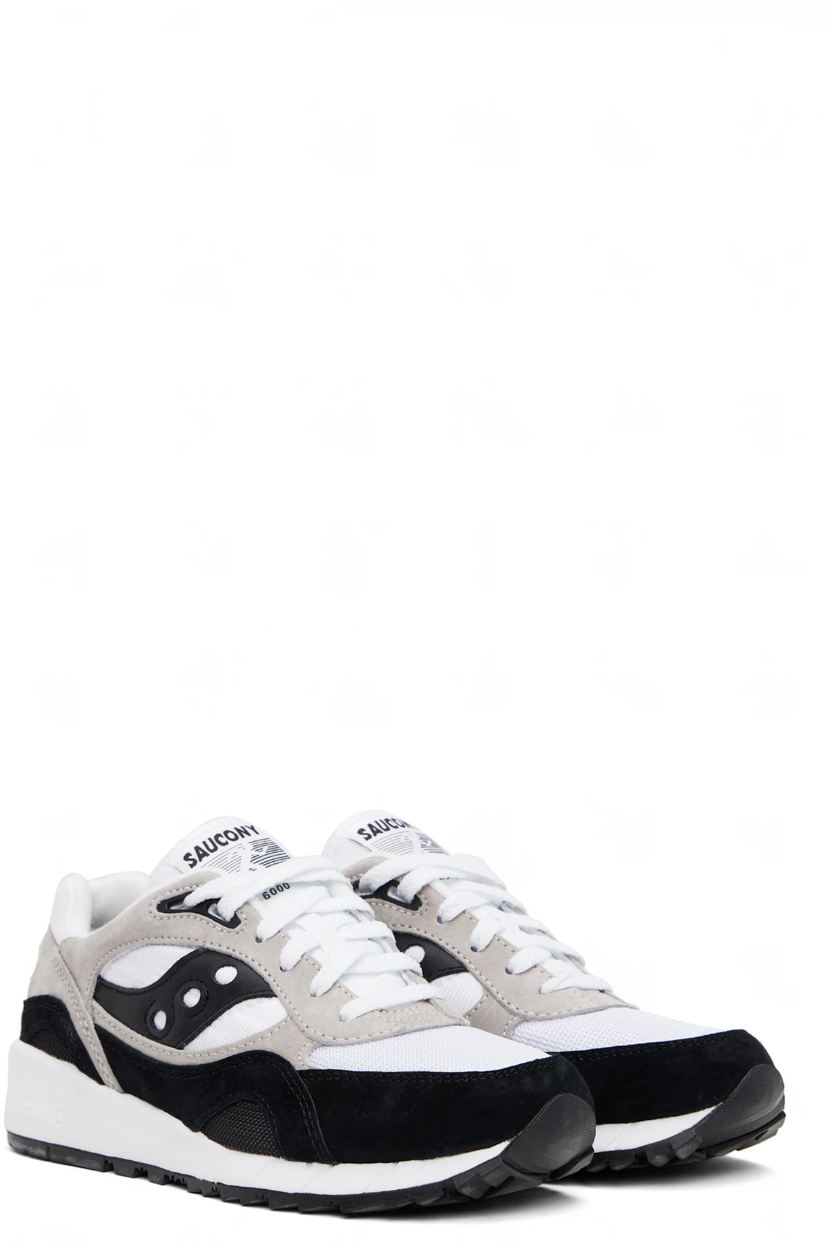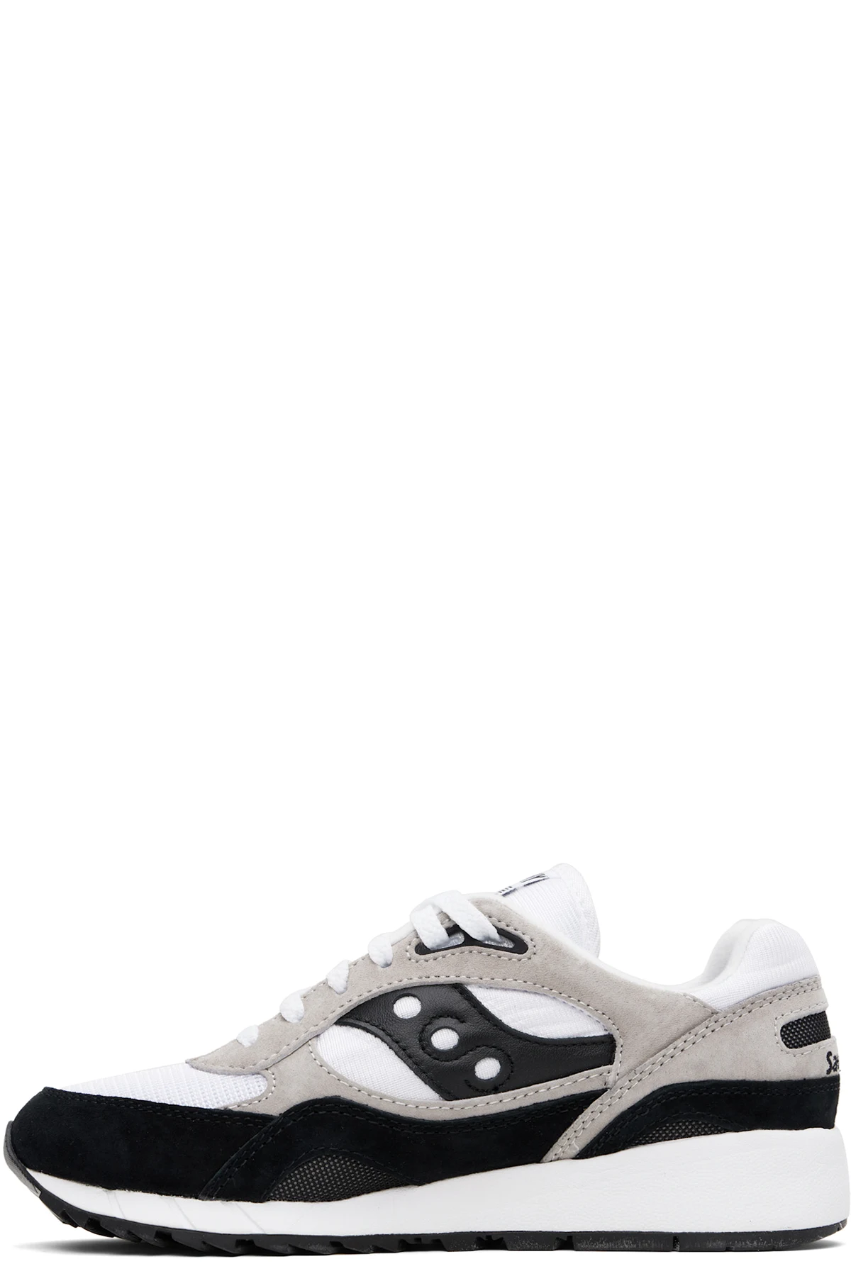 Low-top mesh and suede sneakers in white, black, and taupe.