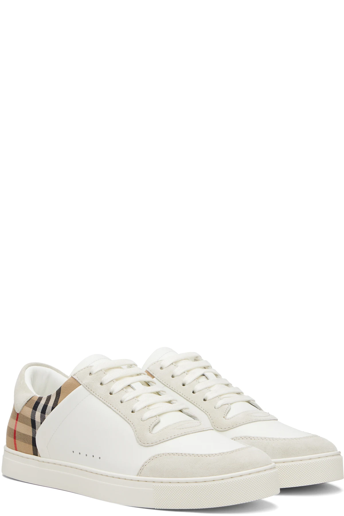 Low-top buffed calfskin, calfskin suede, and twill sneakers.