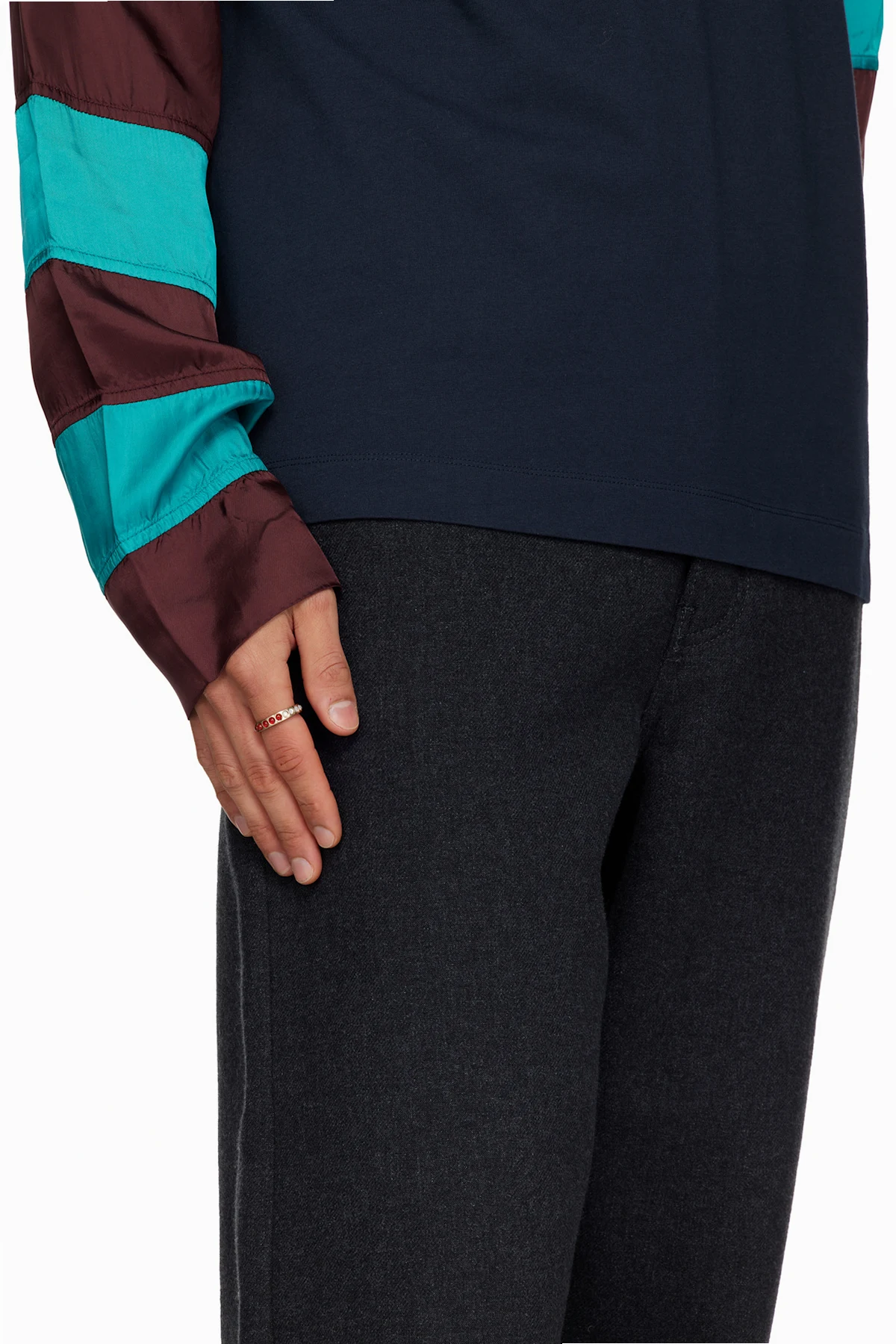 Handcrafted band ring in gold-tone brass. Bezel-set stones and mother-of-pearl throughout.