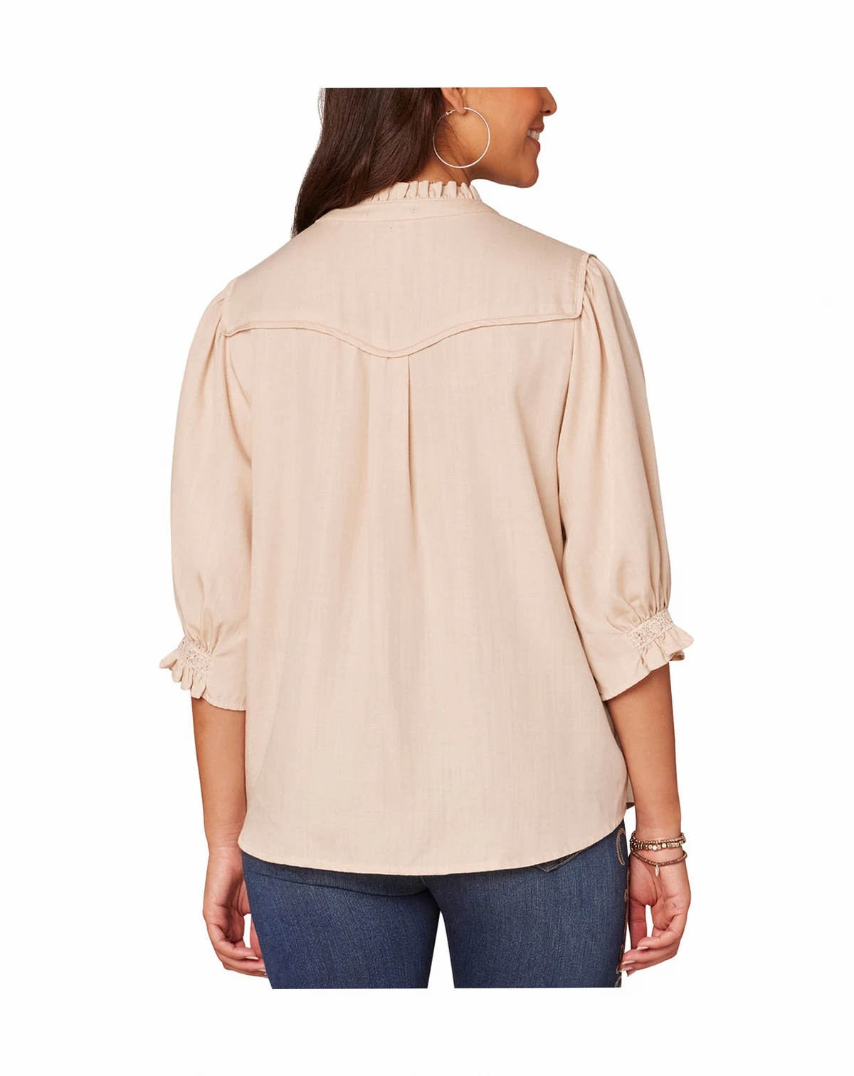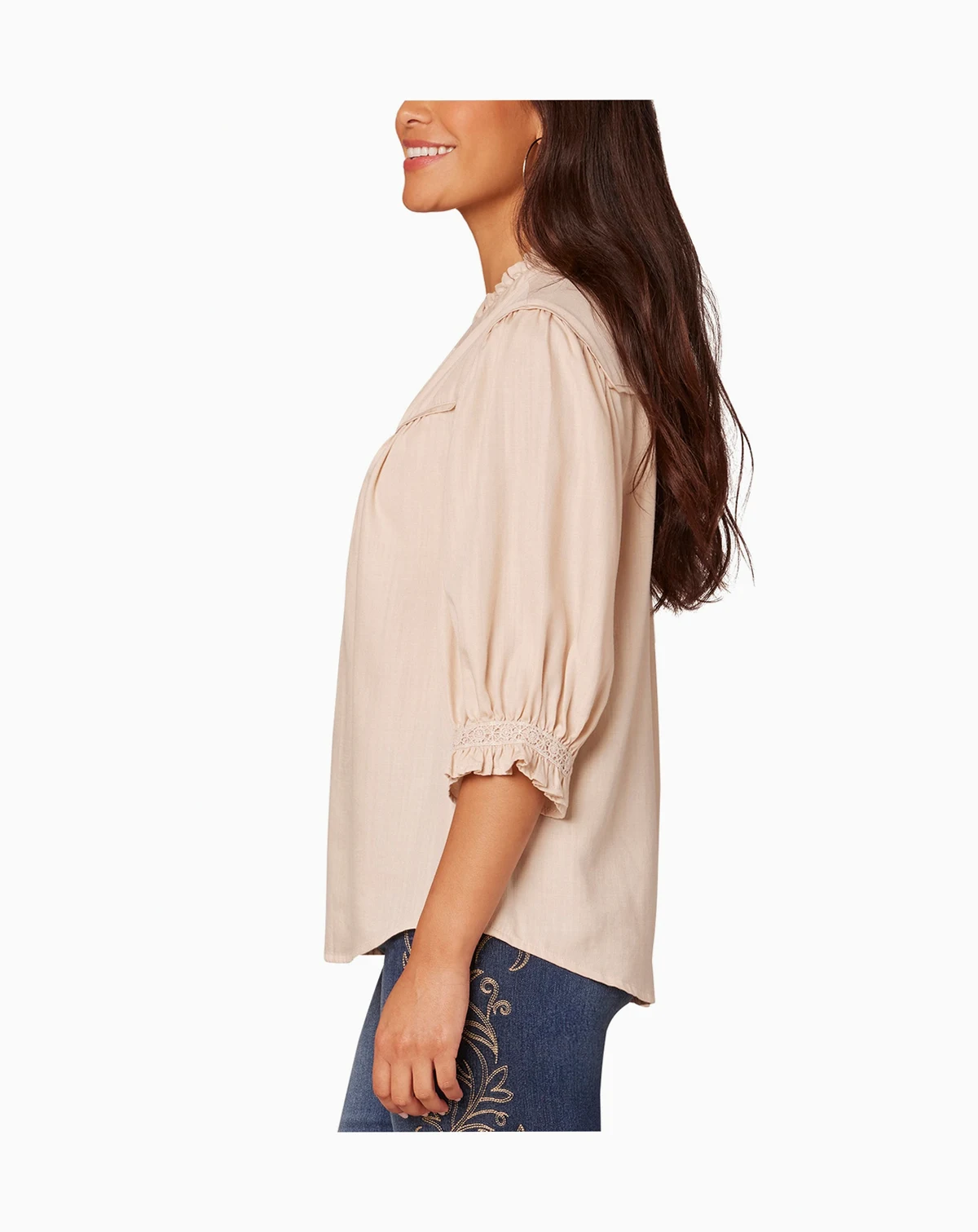 Perfect for pairing with your favorite denim, this charming 3/4-sleeve shirt from Democracy features subtle ruffle detailing and crochet trim.