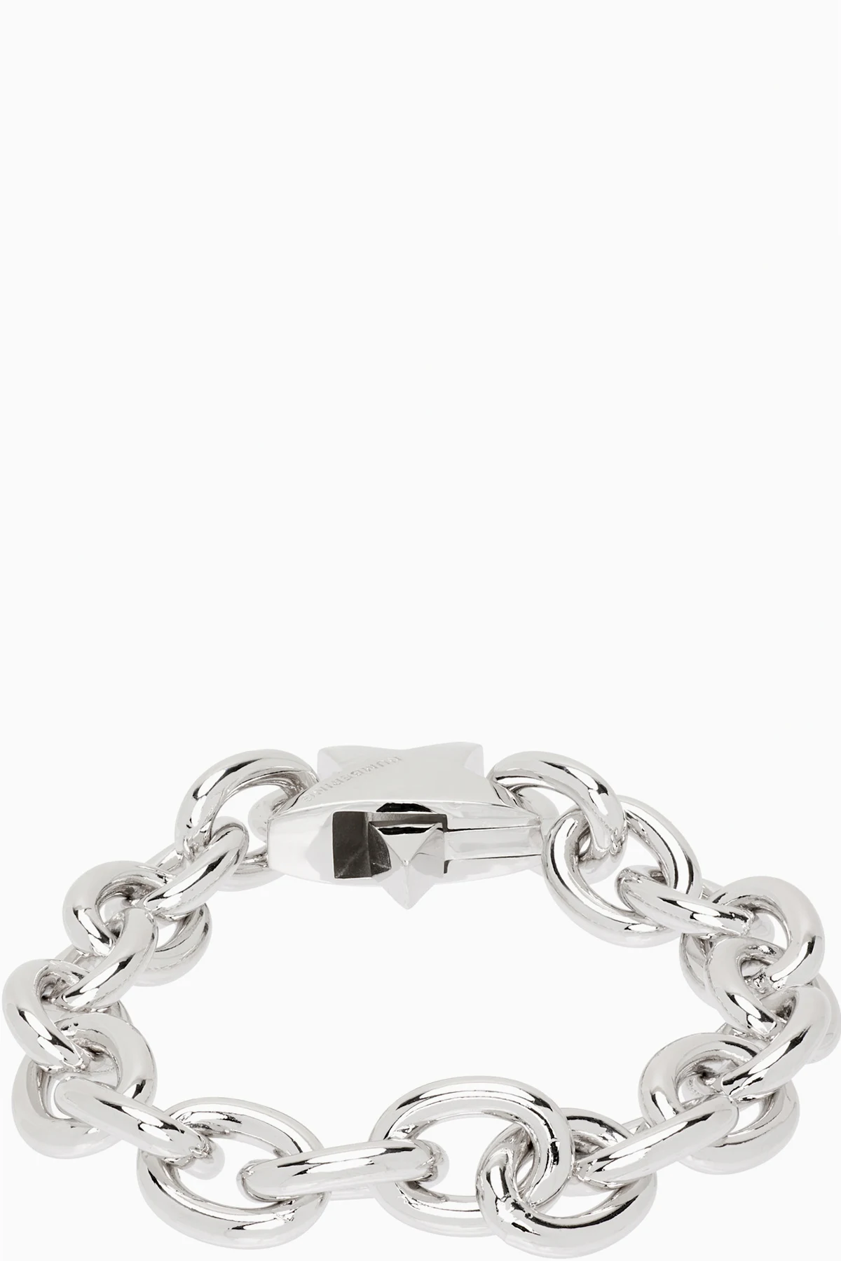 Cable chain bracelet in rhodium-plated brass. Logo-engraved modified clasp fastening.
