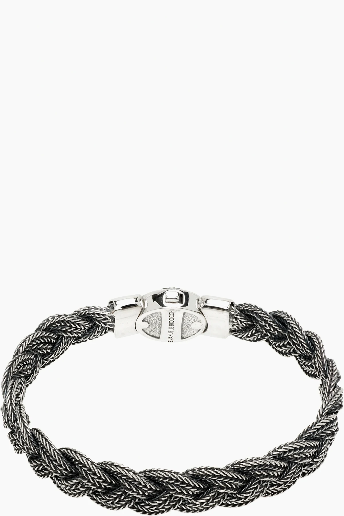 Handcrafted braided foxtail chain bracelet in sterling silver. Graphic engraved at box-clasp fastening.