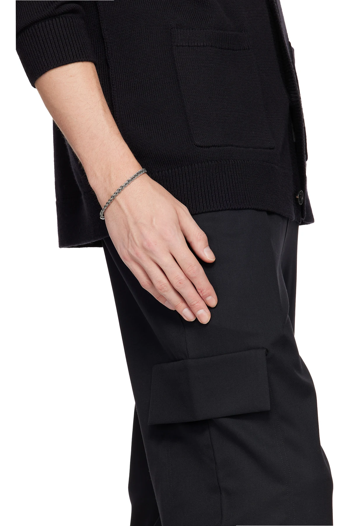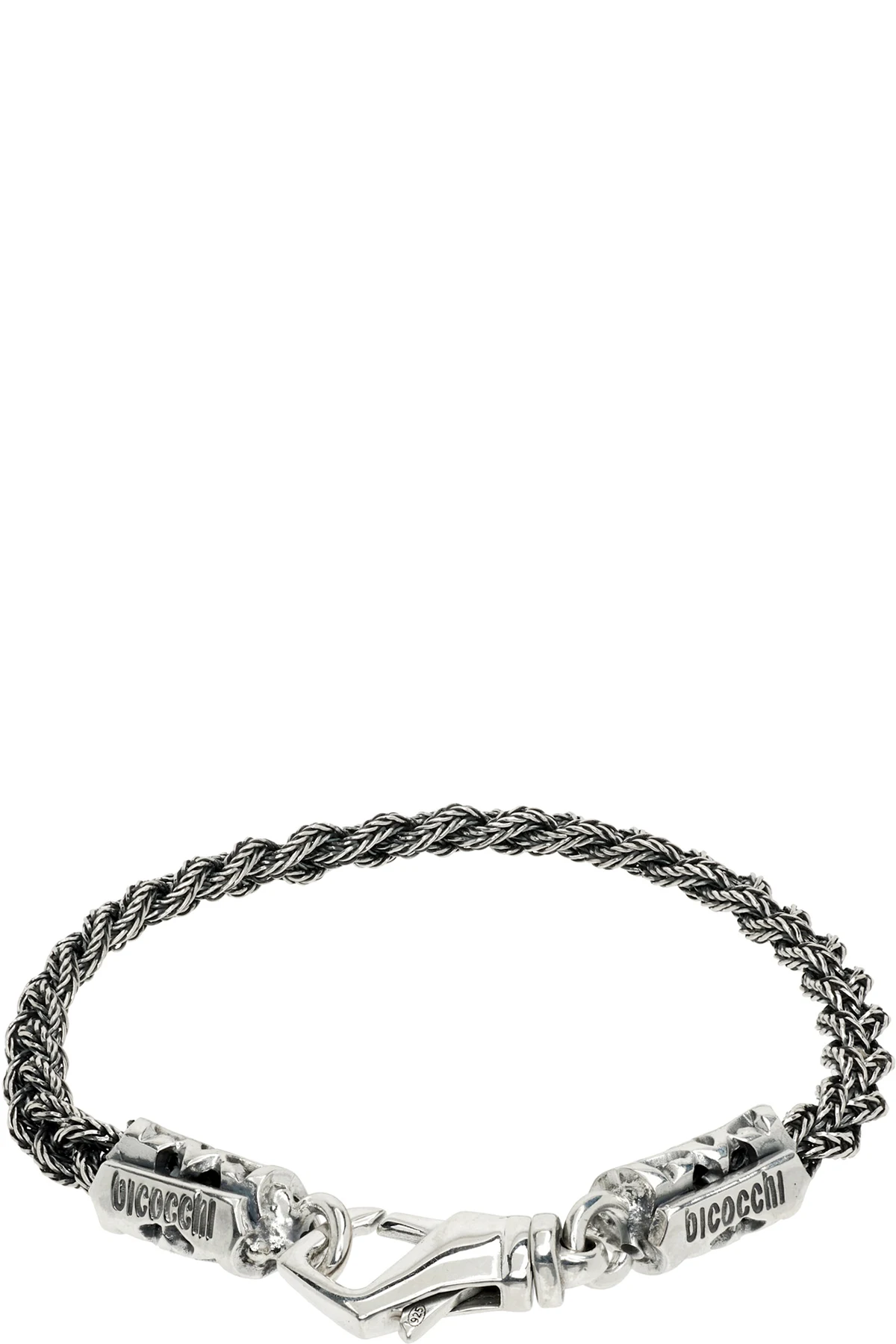 Handcrafted braided foxtail chain bracelet in sterling silver. Logo and graphic engraved at lobster-clasp fastening.