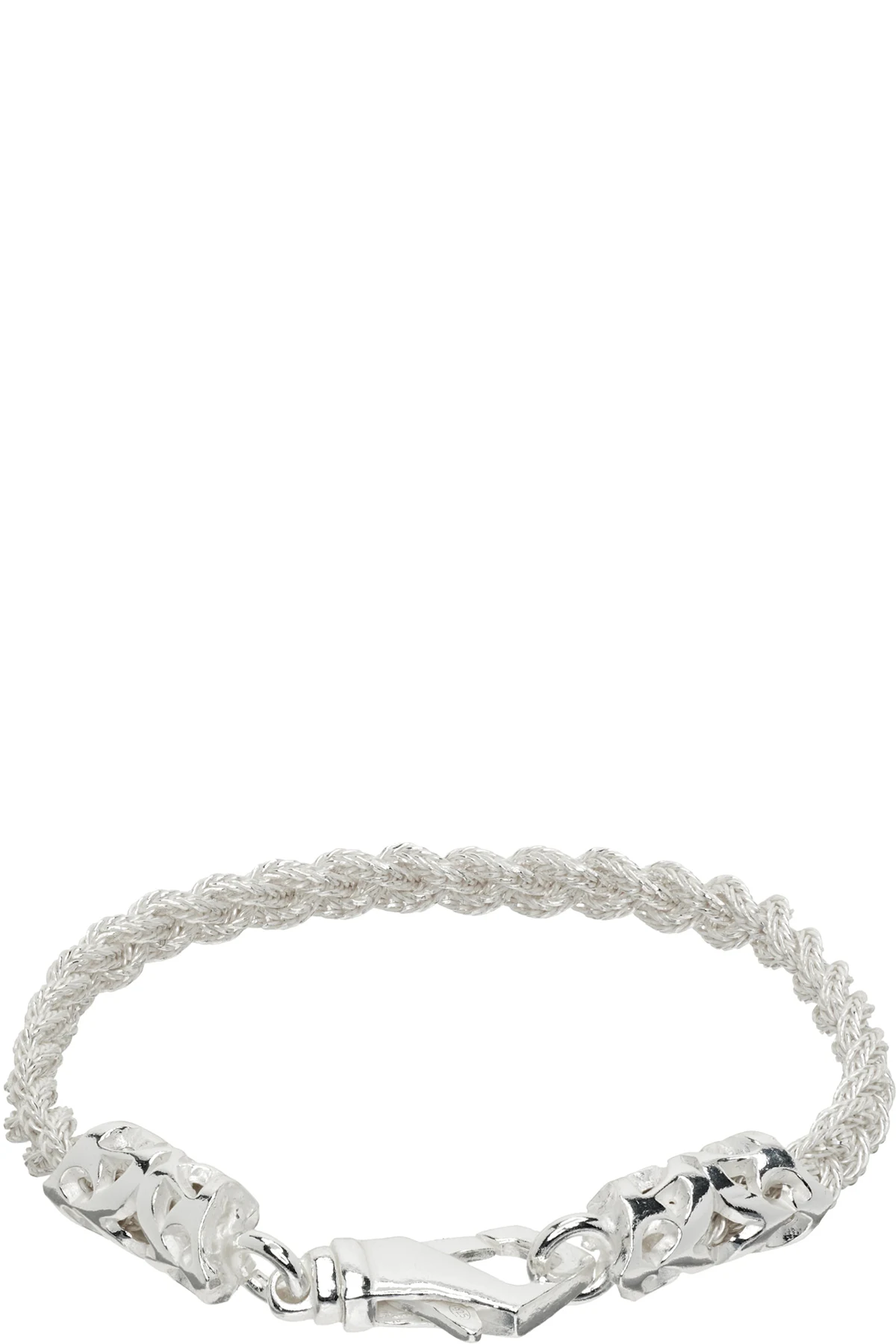 Handcrafted braided foxtail chain bracelet in sterling silver. Logo and graphic engraved at lobster-clasp fastening.