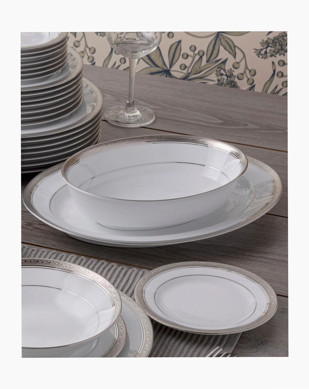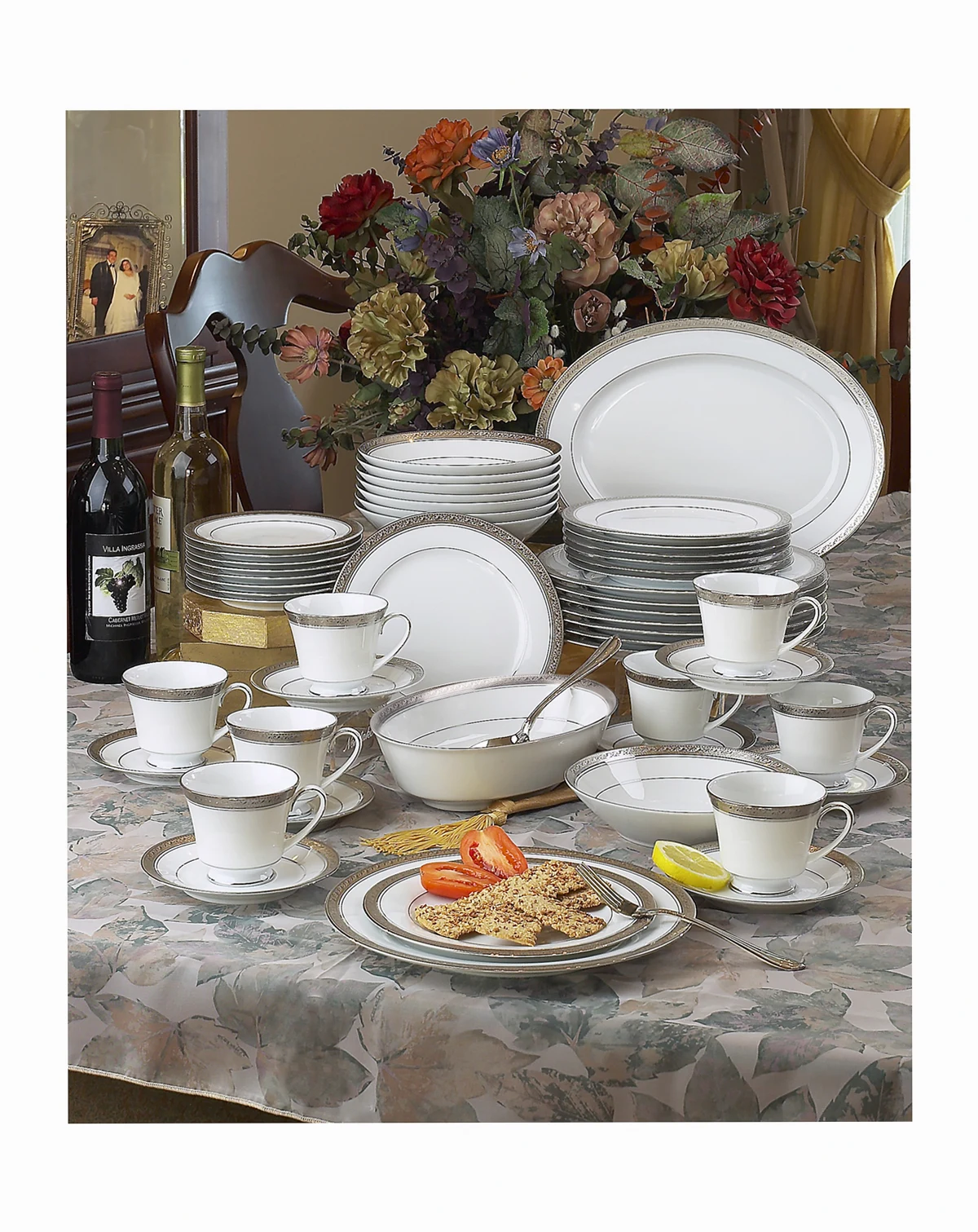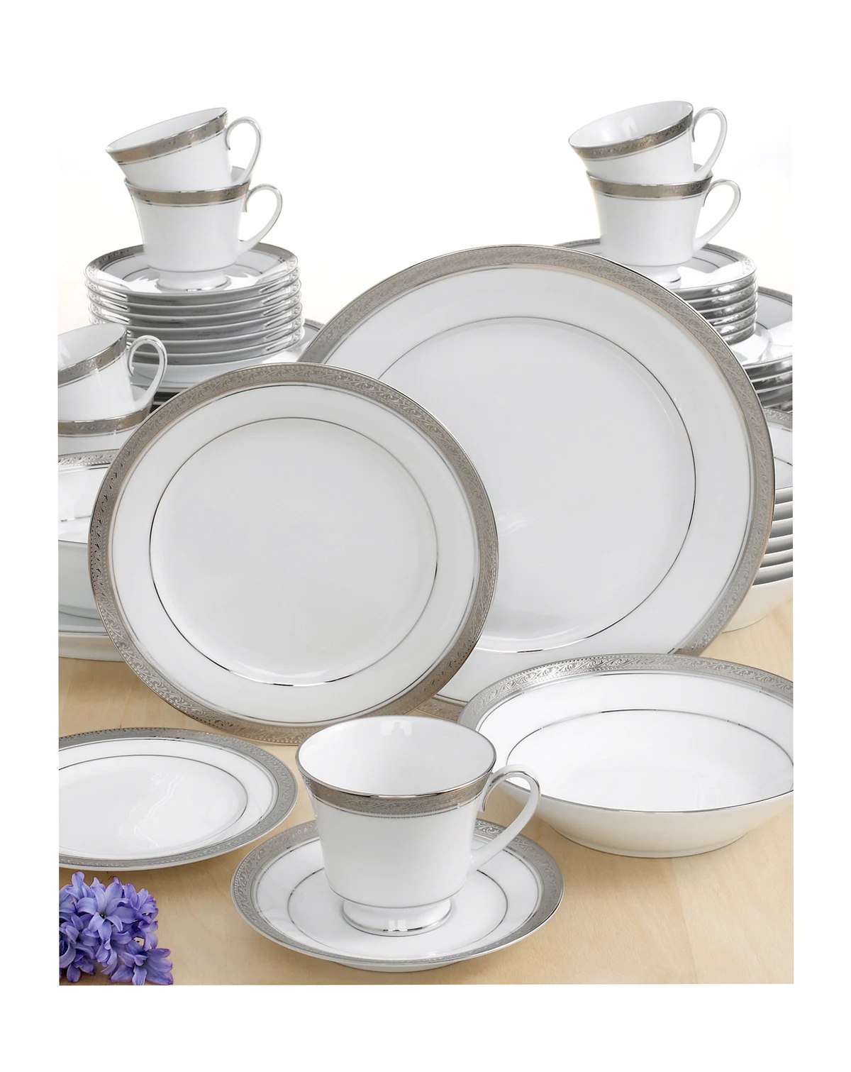 The exquisite craftsmanship of Noritake has transformed formal tables into dazzling displays for more than 100 years. The Crestwood Platinum 50-piece set is a stunning example of porcelain design. Delicate yet durable, each piece is dishwasher safe and with service for eight, the set is as affordable as it is elegant. Polished platinum scintillates against dark tablecloths and brings out the sparkle of your best crystal. In crisp white China framed by fine foliage details, the pattern can even do double duty at family dinners and formal occasions.