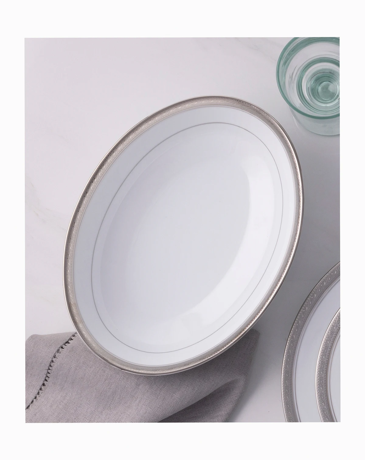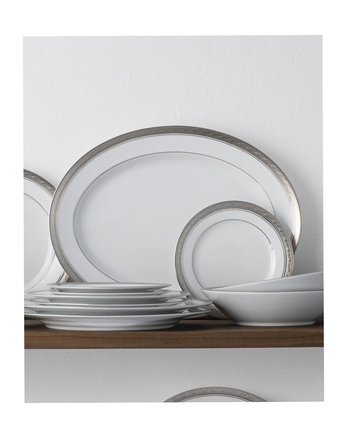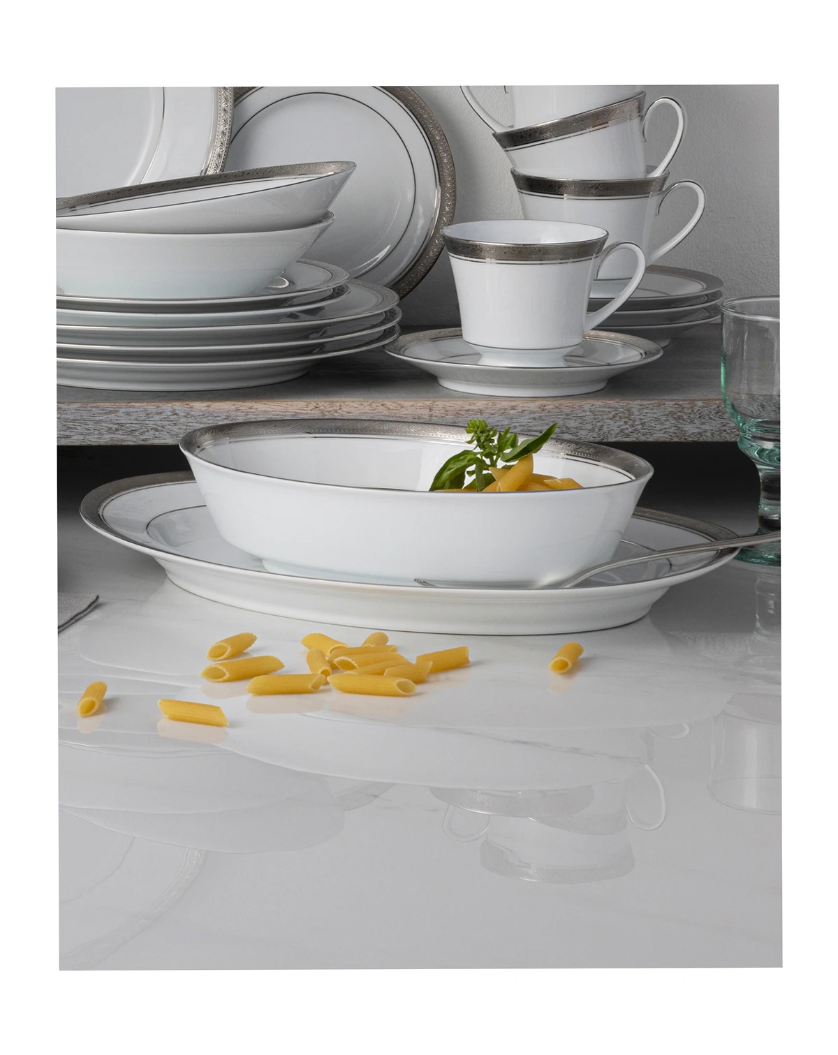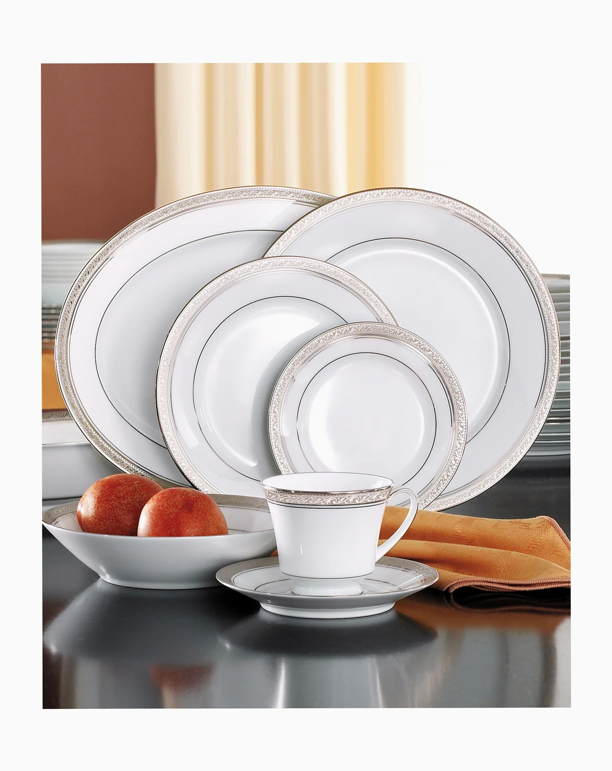 The exquisite craftsmanship of Noritake has transformed formal tables into dazzling displays for more than 100 years. The Crestwood Platinum 50-piece set is a stunning example of porcelain design. Delicate yet durable, each piece is dishwasher safe and with service for eight, the set is as affordable as it is elegant. Polished platinum scintillates against dark tablecloths and brings out the sparkle of your best crystal. In crisp white China framed by fine foliage details, the pattern can even do double duty at family dinners and formal occasions.