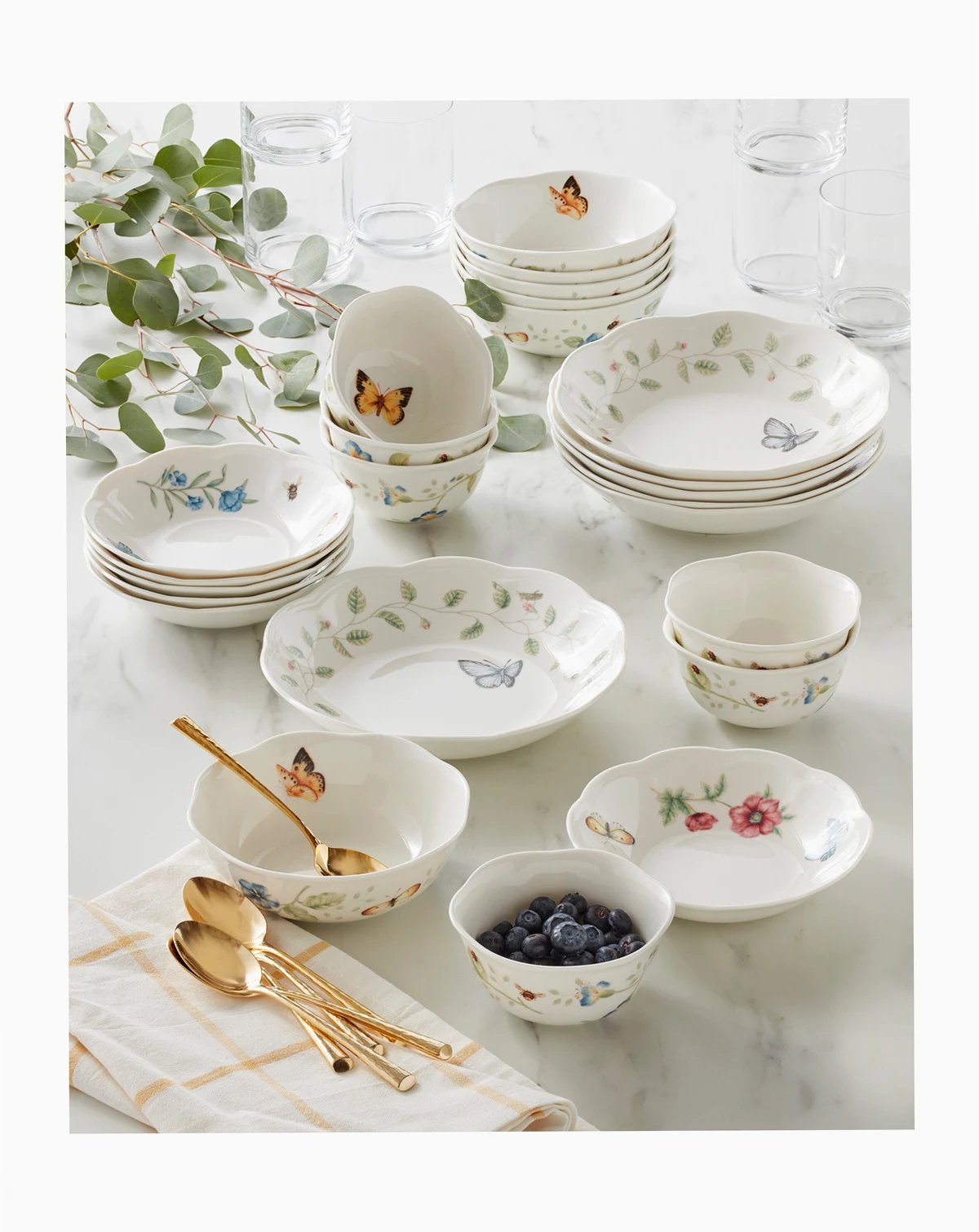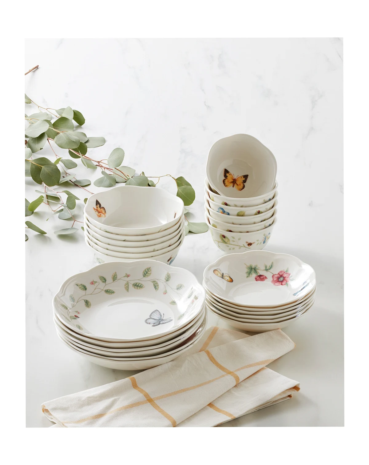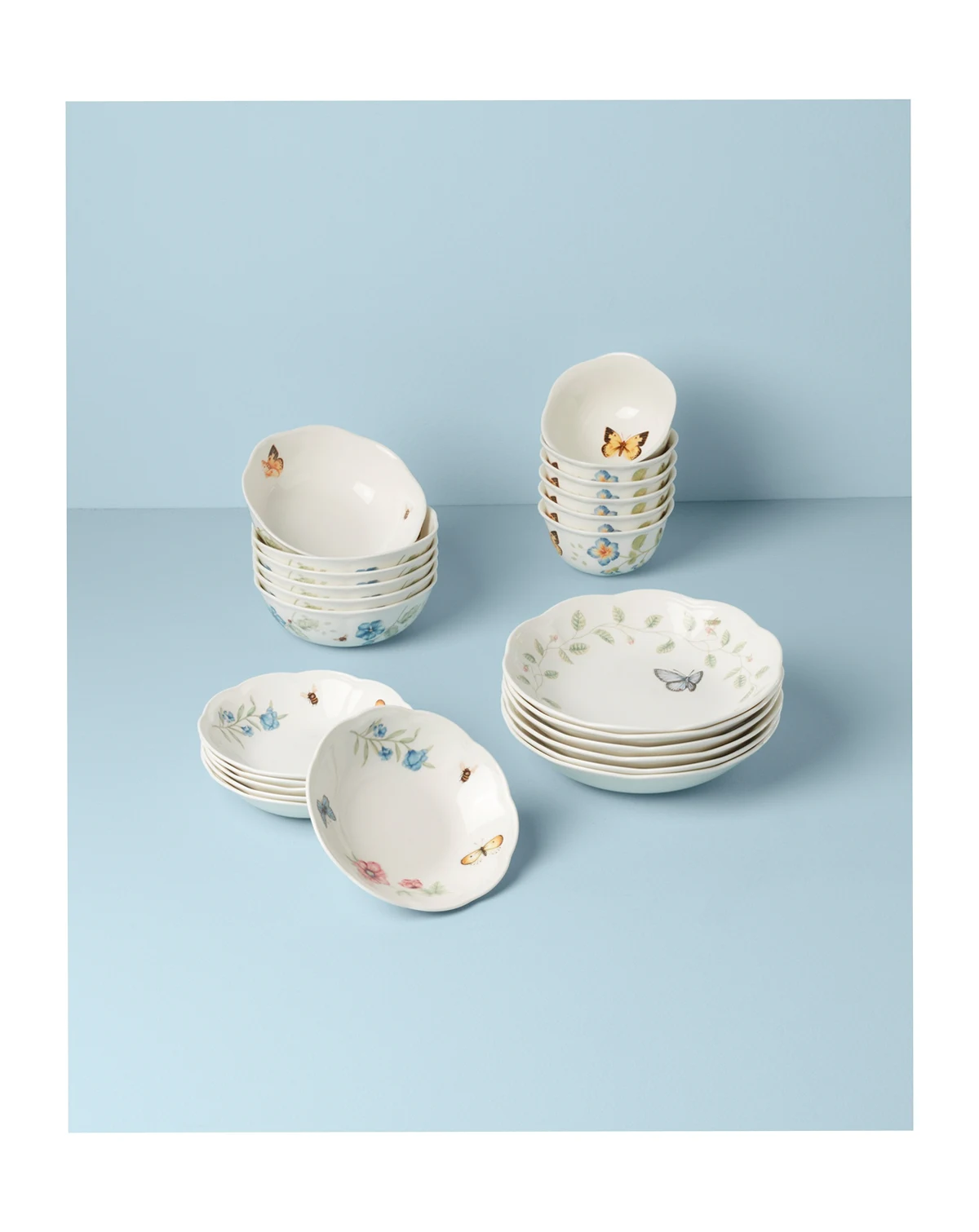 Expand your Butterfly Meadow Collection with this lovely set from Lenox, a 24-piece set of four types of porcelain bowls with the dainty designs, radiant blooms and scalloped edges that are the trademark of this iconic pattern.
