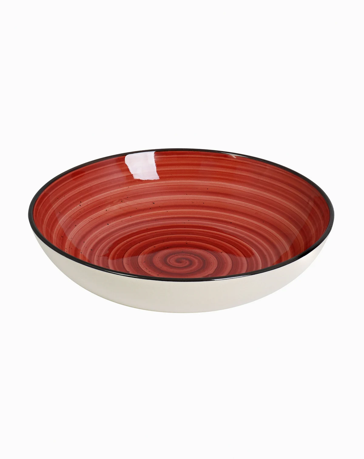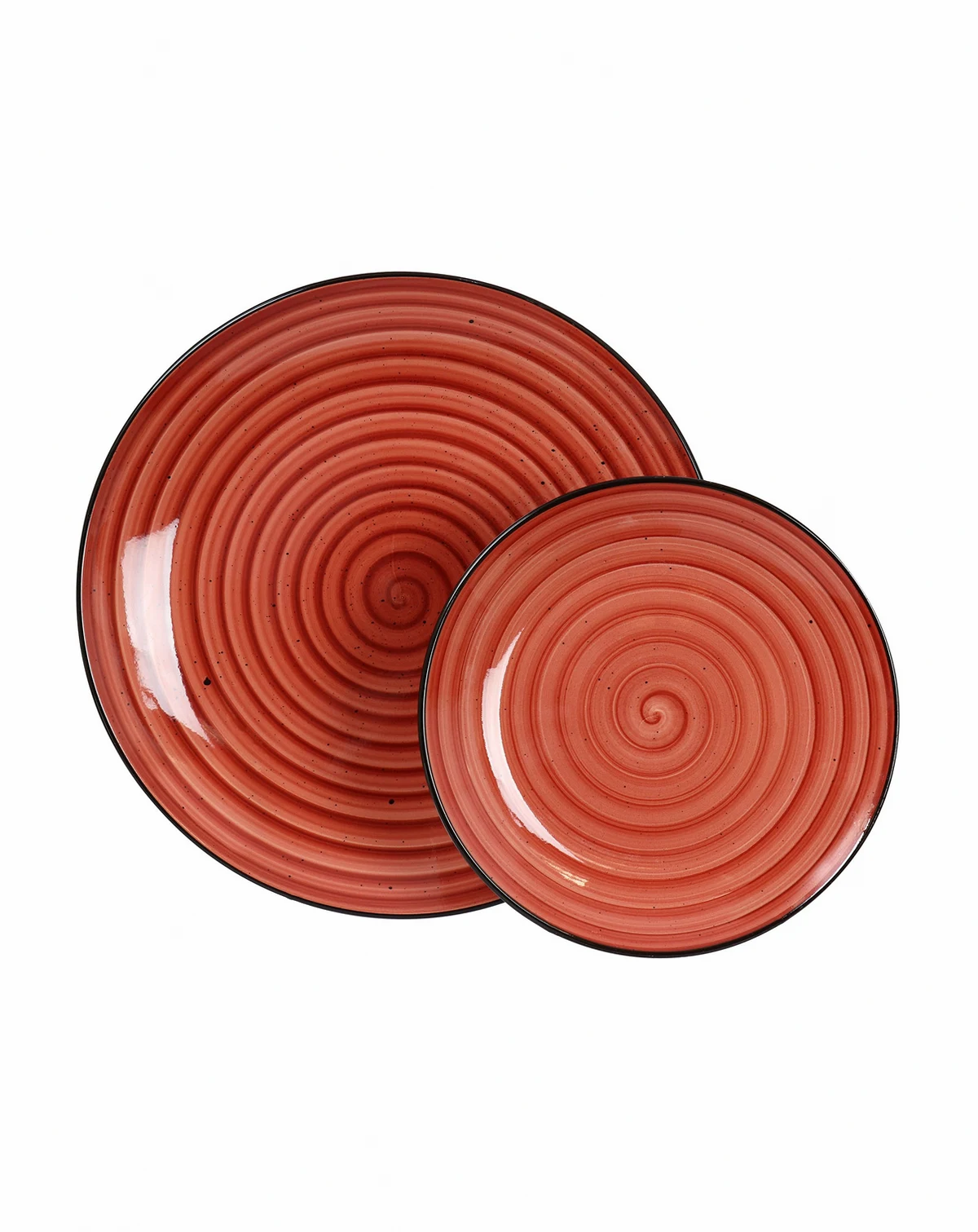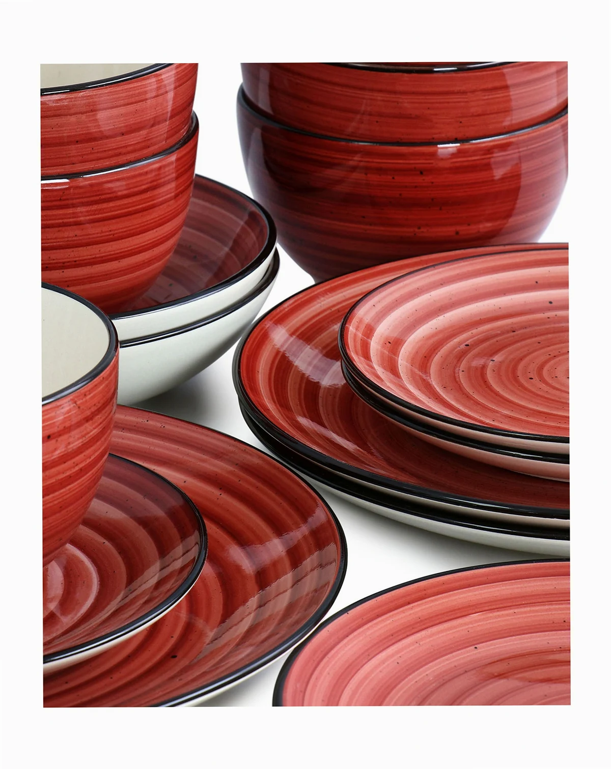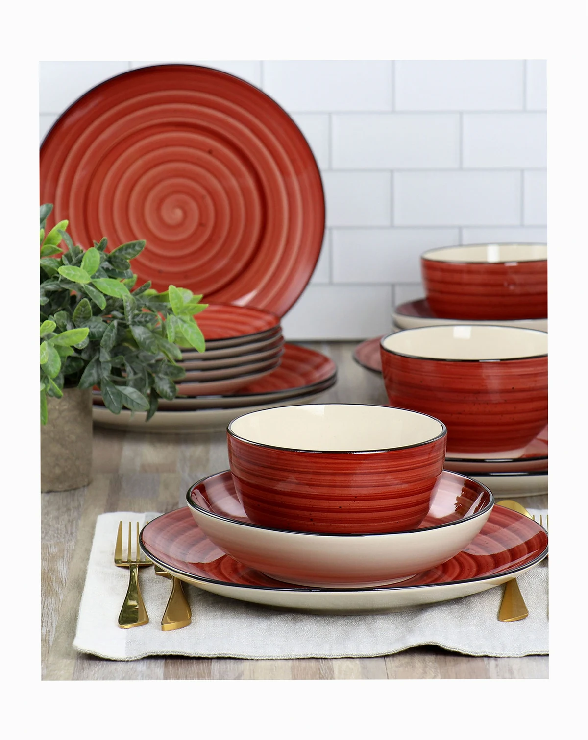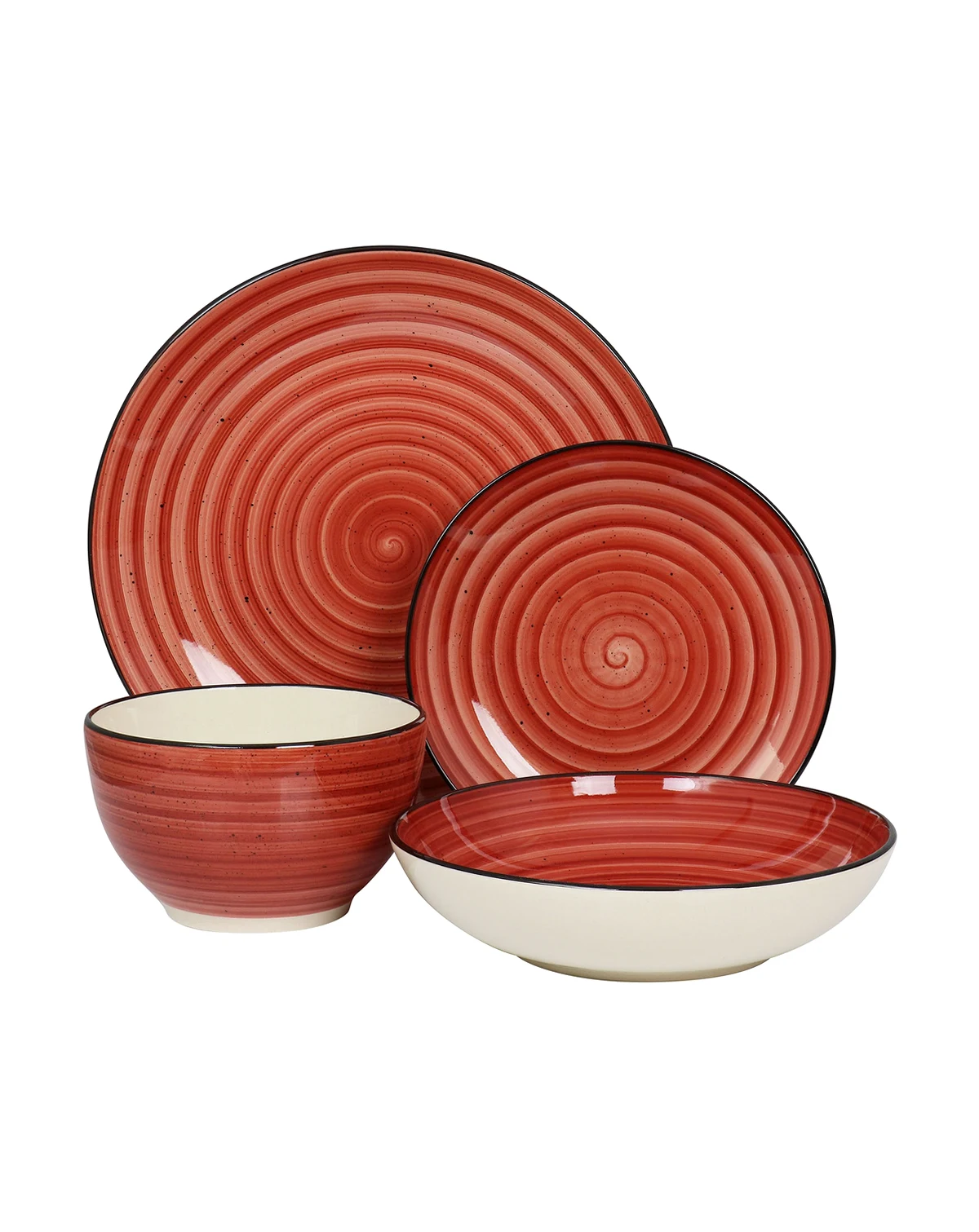 Adding a pop of color to the dinner table, Elama Gia 24 piece stoneware dinnerware set is hand painted with swirl and speckle design, bringing a unique style to your table setting. Ideal for casual lunches and intimate dinners, this set has a classic round shape, strong colored trim and 2 toned with white. Conveniently stackable pieces can be stored away easily and neatly in compact spaces. Conveniently dishwasher and microwave safe.