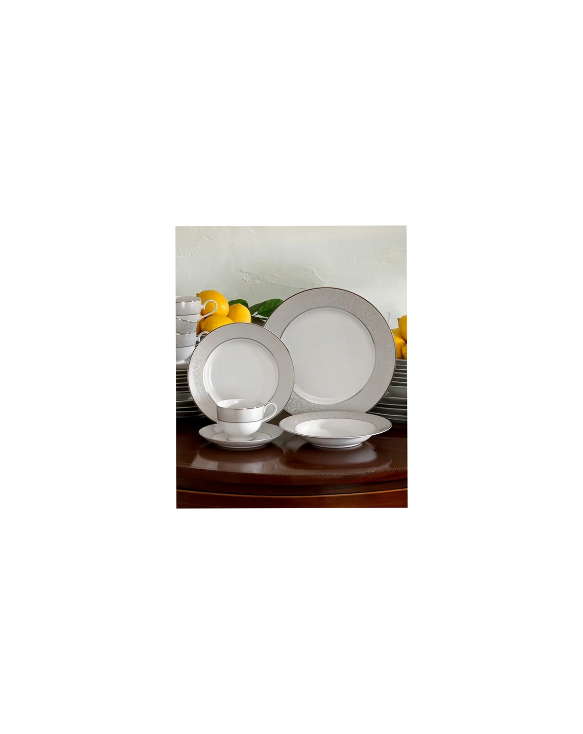 Clean, cool and marked by an understated elegance, Mikasa's Parchment dinnerware set combines a soft gray border and intricate scroll design accented by shimmering platinum.